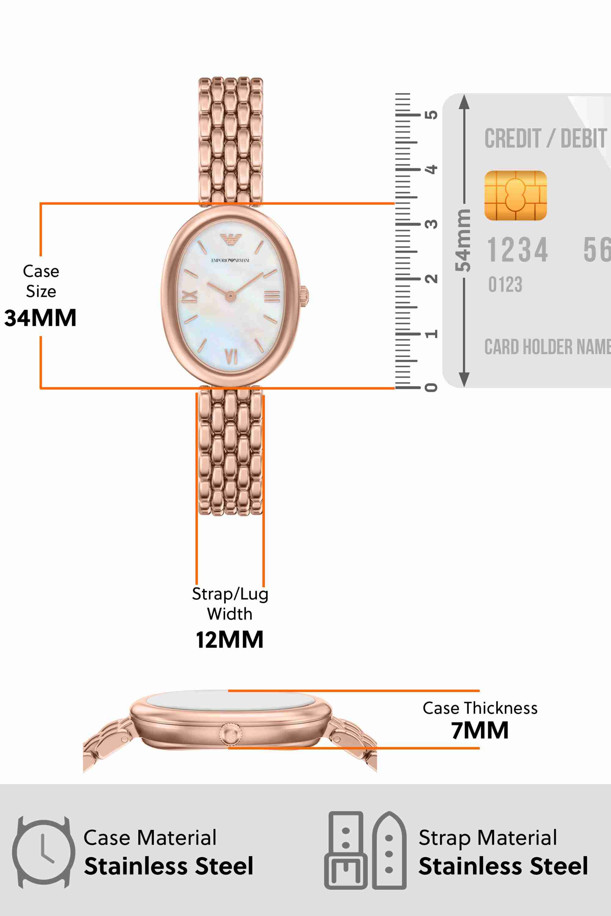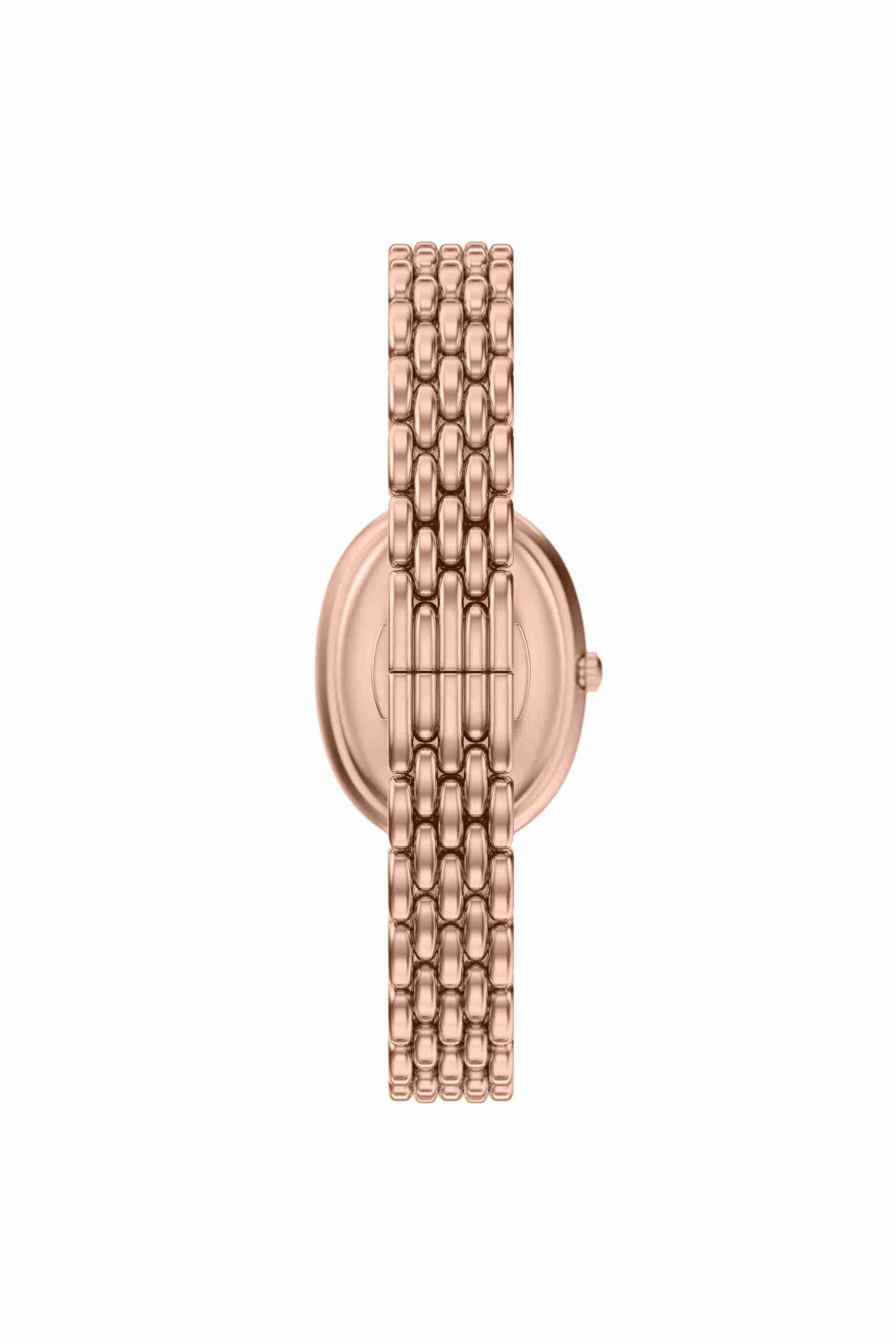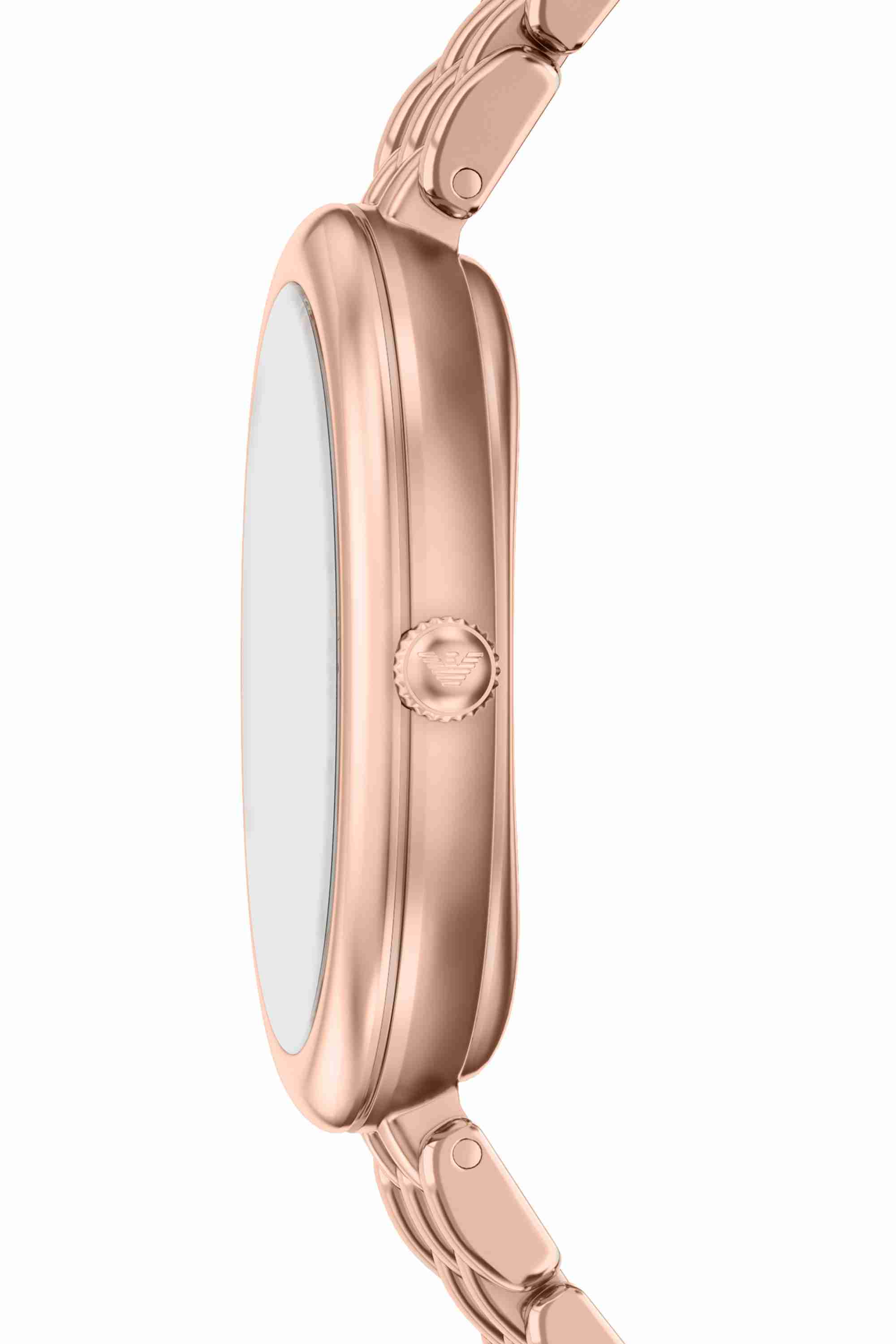 Emporio Armani's Sinfonia is a 26 x 34mm watch, showcasing a white mother-of-pearl dial with Roman numeral indexes on an intricate, multi link polished rose gold-tone stainless steel bracelet. The distinct oval silhouette makes this watch the ideal dress accessory.
