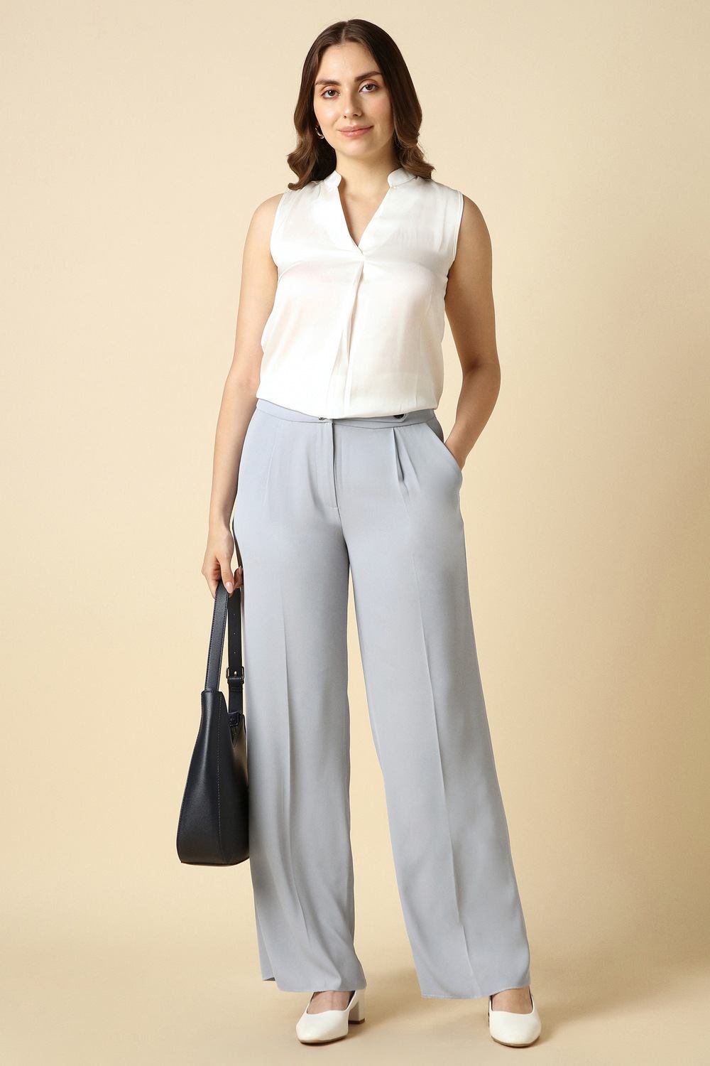 Elevate your professional attire with these chic grey trousers from Allen Solly. Meticulously crafted from a blend of polyester and spandex, they offer exceptional stretch for all-day comfort during formal events. The solid pattern ensures a timeless appeal, allowing for easy pairing with any blouse. Designed to enhance your polished look, these trousers embody sophistication and practicality, making them a must-have addition to your wardrobe for any workday or special occasion.