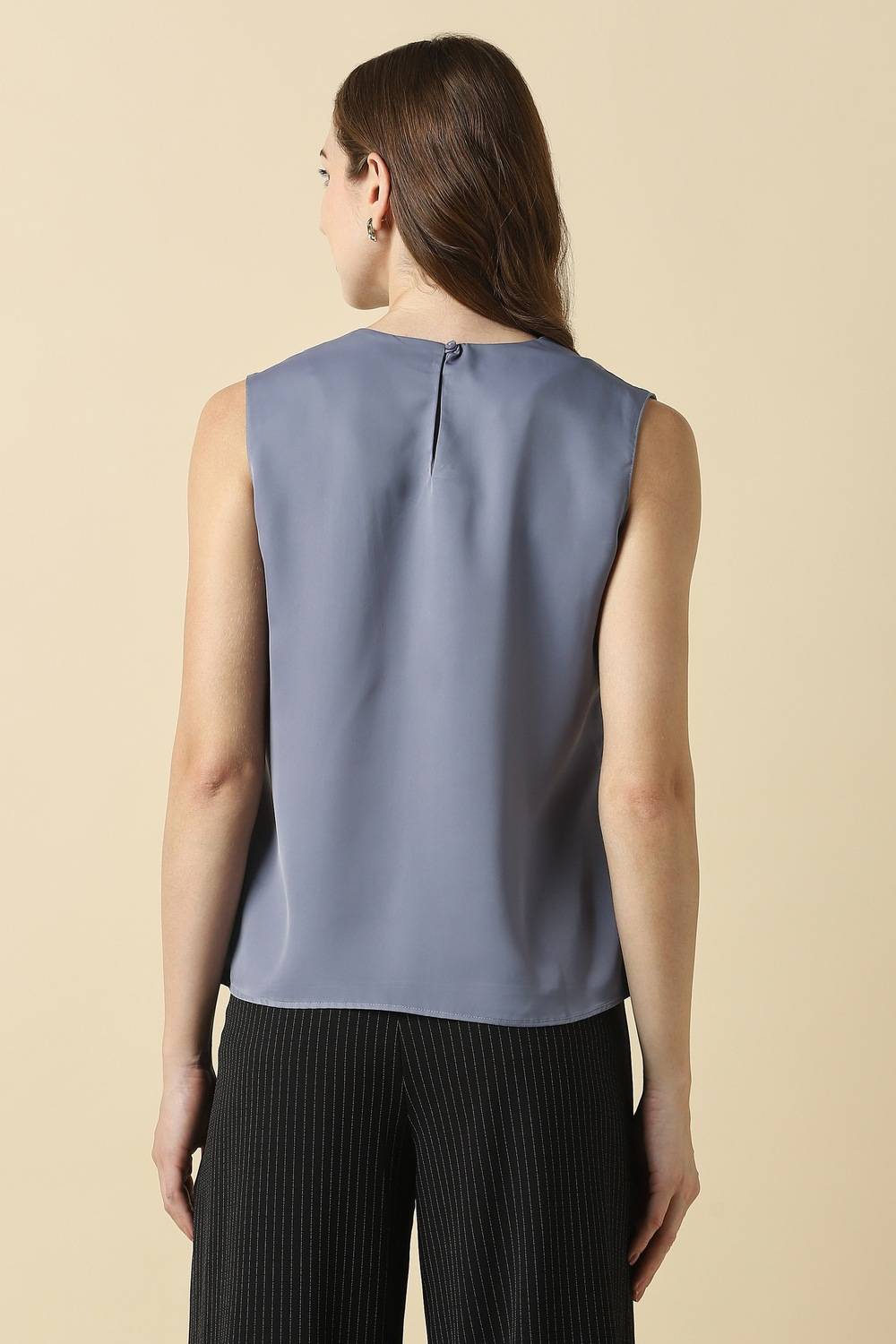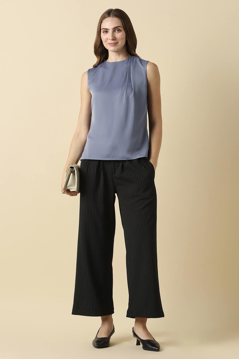 Elevate your formal occasions with this elegant grey top from Allen Solly. Meticulously constructed from high-quality polyester, it offers enduring style and comfort. The round neck and solid pattern create a sophisticated silhouette that pairs beautifully with tailored trousers or skirts. Perfect for boardrooms and evening events alike, this top radiates confidence, making it a must-have for the modern woman`s wardrobe. Embrace effortless chic and redefine your fashion statement.