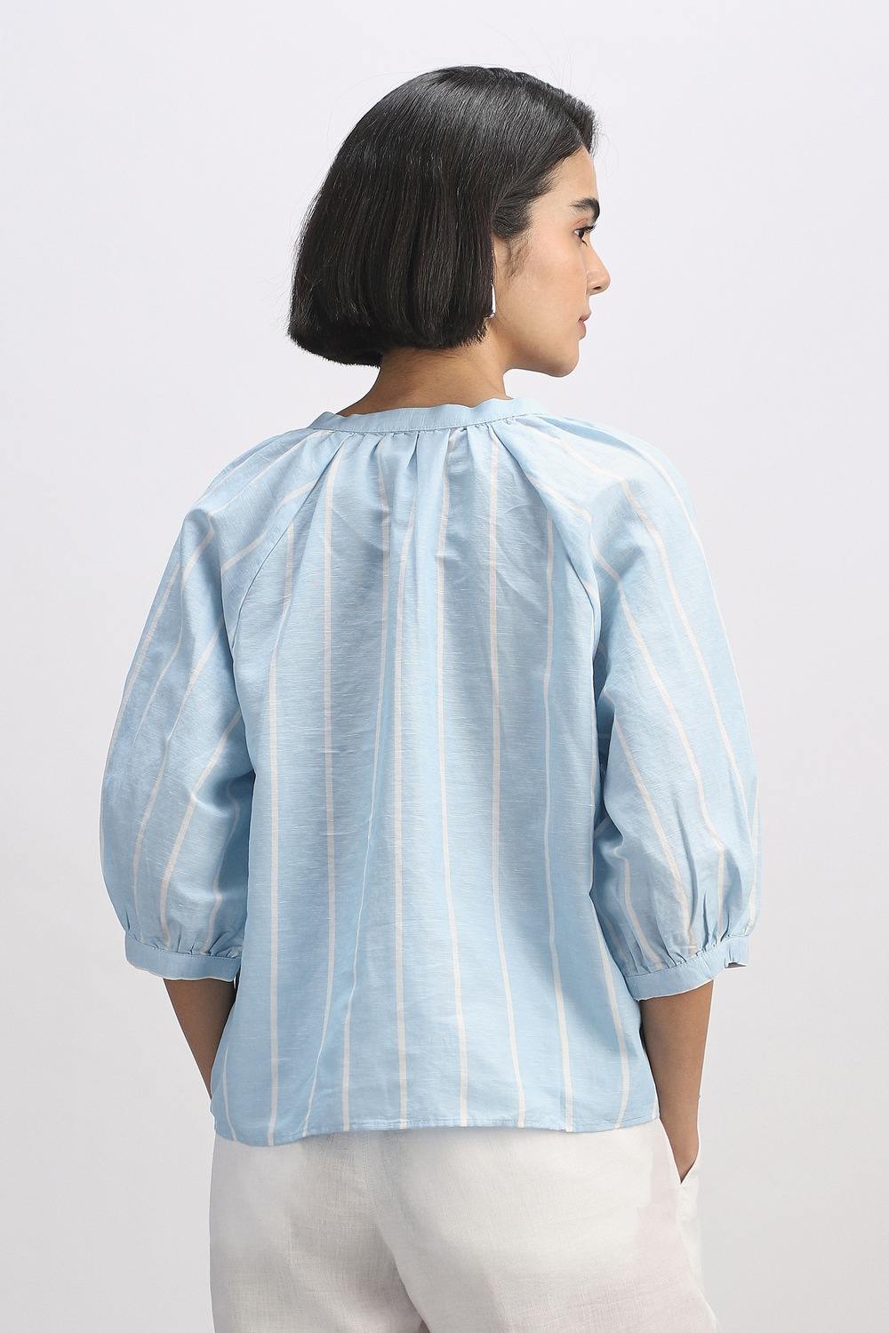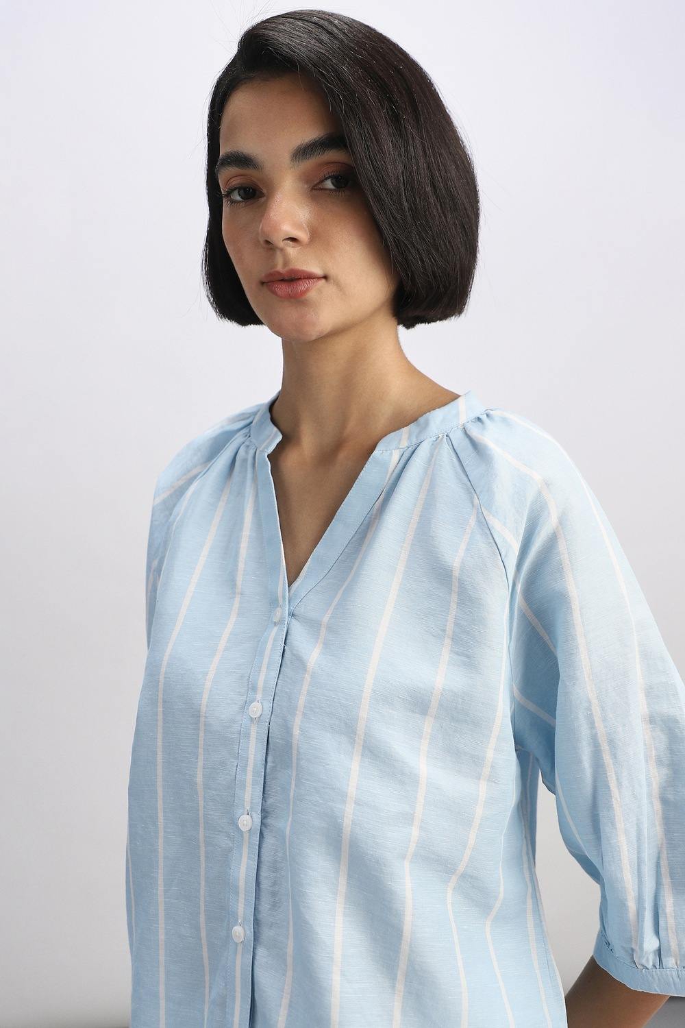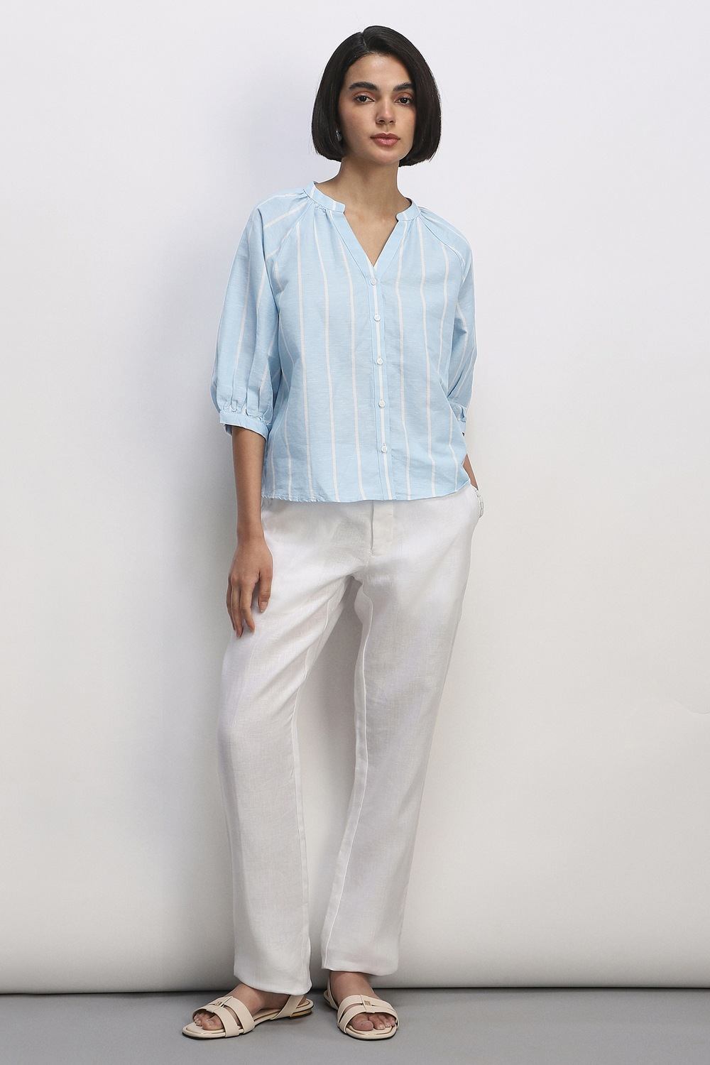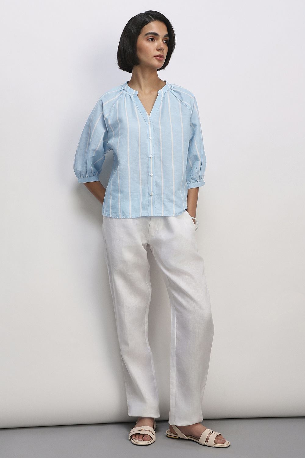Indulge in the breezy charm of this light blue striped top, a quintessential piece from Allen Solly. Meticulously constructed from a luxurious blend of linen and cotton, it offers breathable comfort for your leisurely outings. The round neckline and relaxed fit make it an ideal choice for casual elegance, easily styled with your favorite jeans or shorts. Embrace effortless sophistication as you radiate style on every occasion with this refined staple.