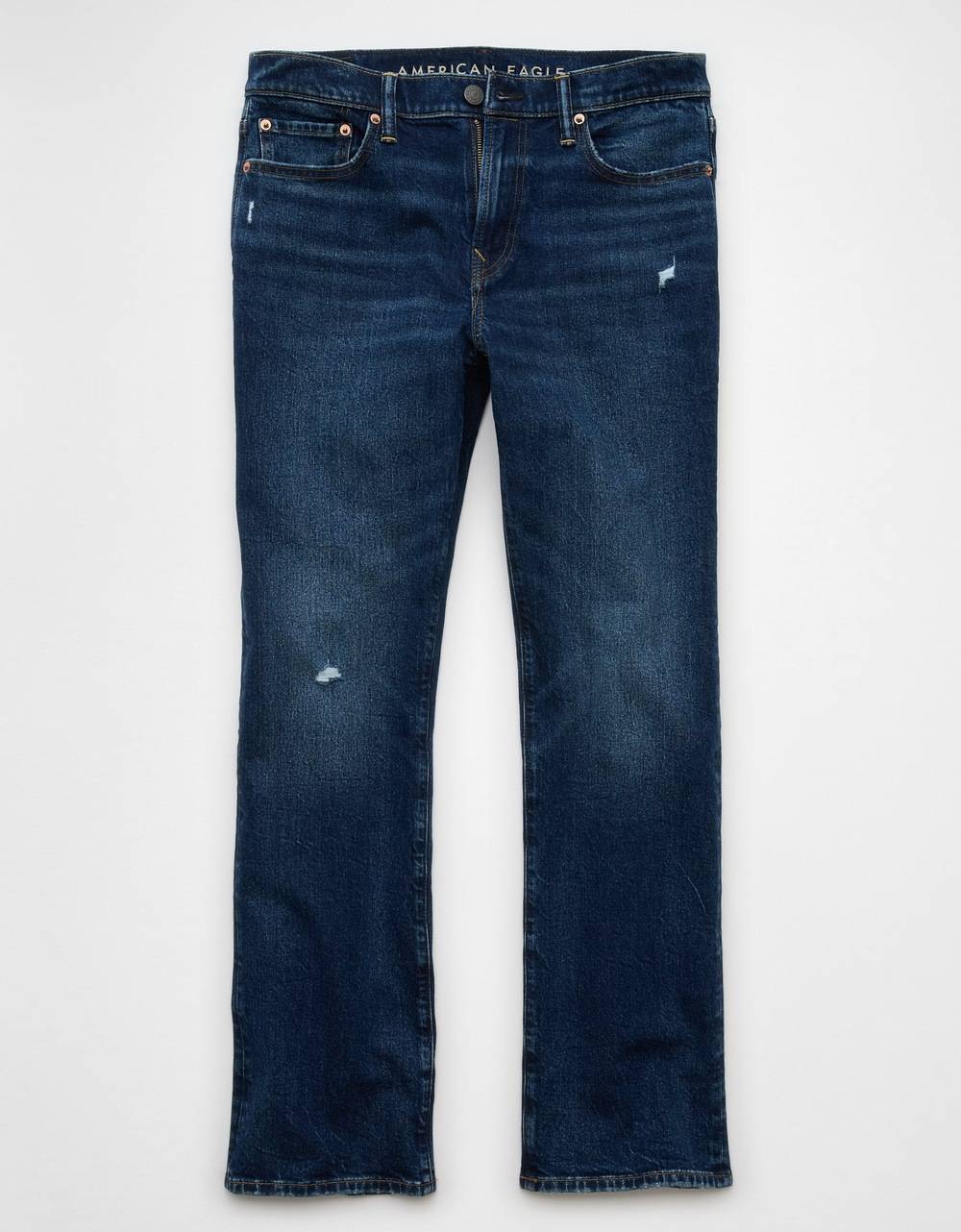 Crafted for comfort and style, these American Eagle bootcut jeans feature a rich navy hue and a dark wash finish. Made from a blend of cotton, recycled cotton, lyocell, and elastane, they provide the perfect balance of stretch and breathability for all-day wear. With a casual fit that flatters, these jeans are ideal for relaxed outings or casual events. Elevate your wardrobe with this versatile staple.