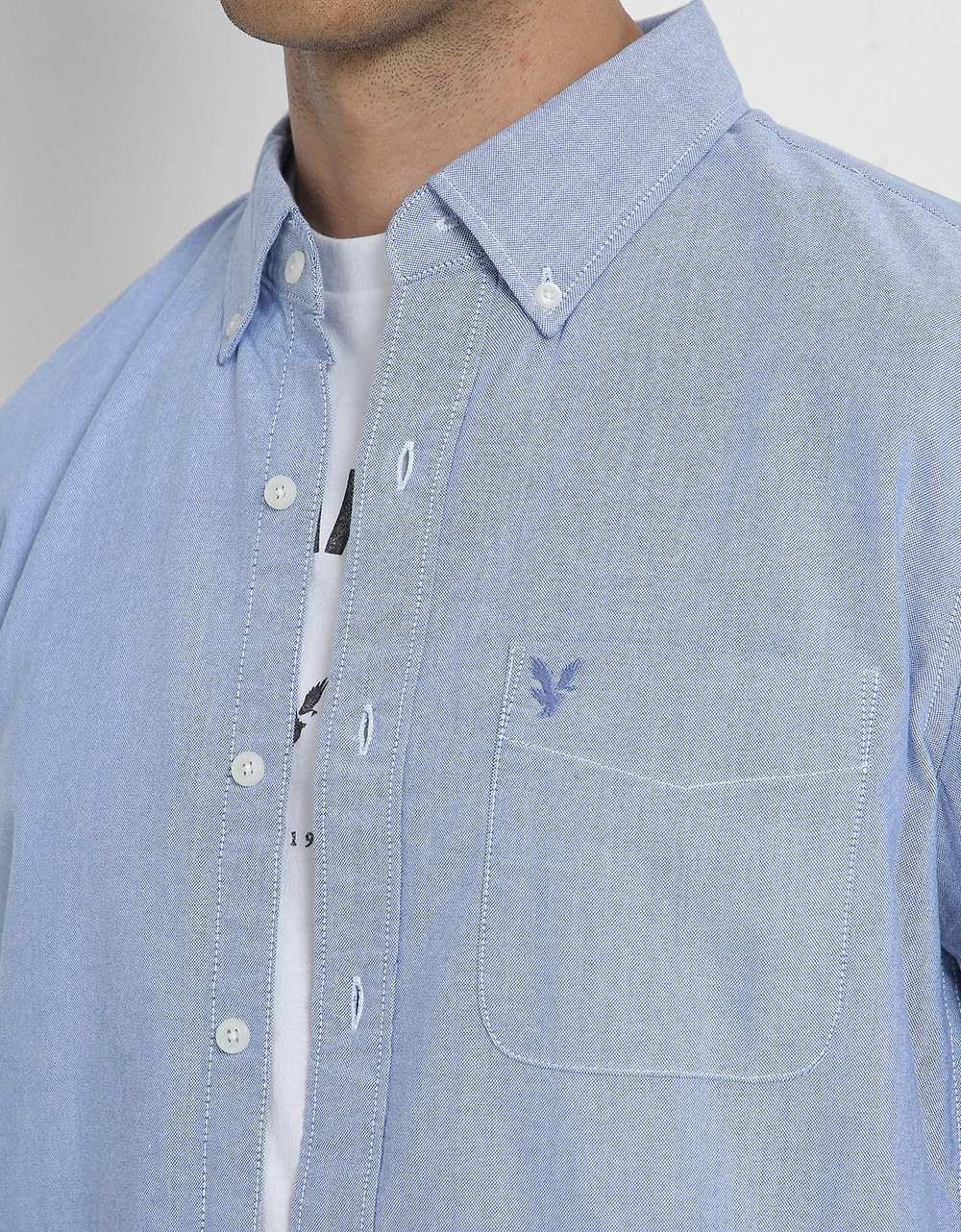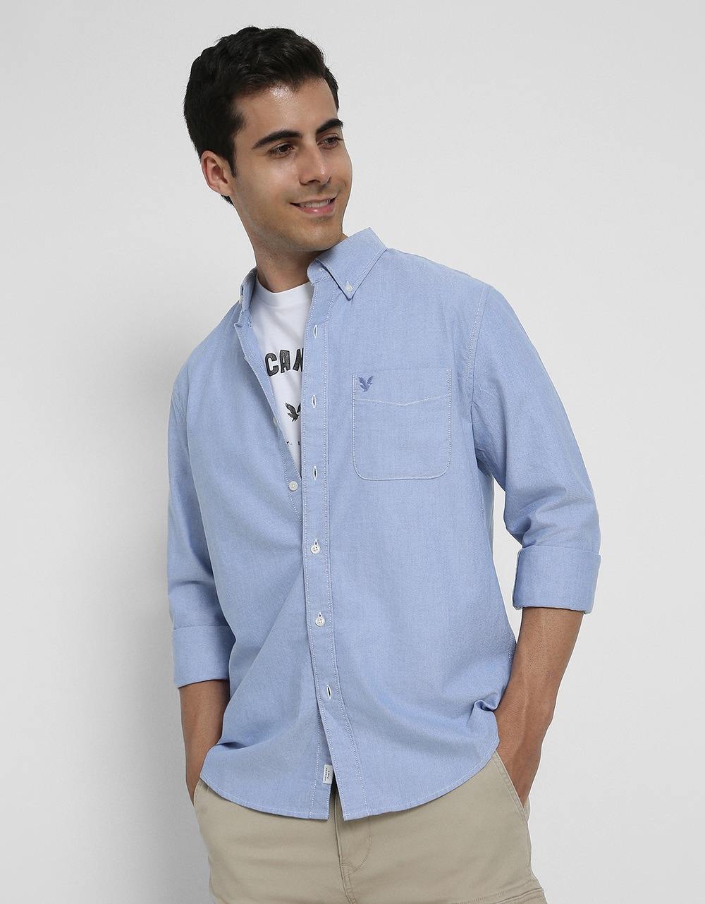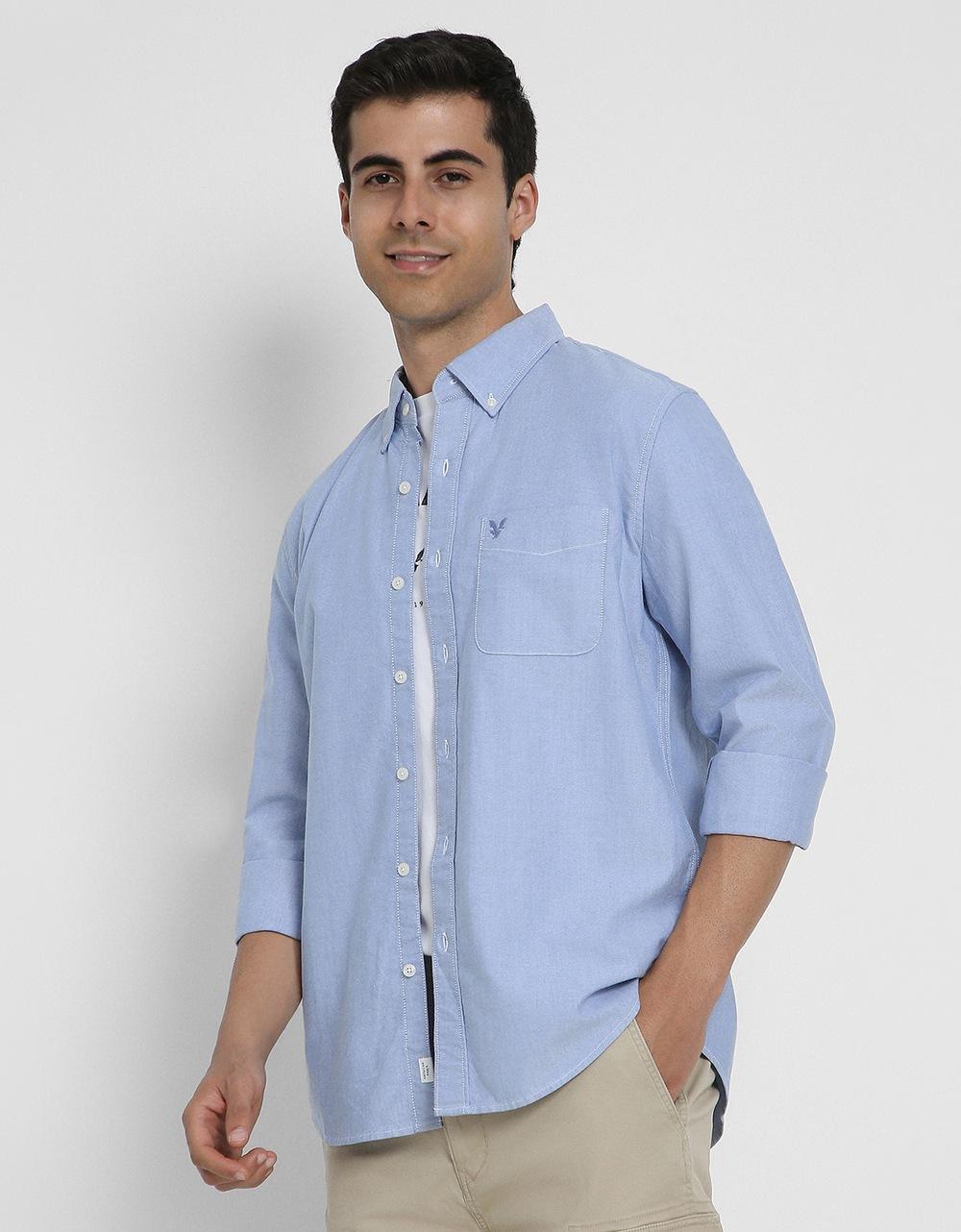 Experience effortless style with this American Eagle solid blue shirt crafted from premium cotton. Featuring a slim fit and classic collar, it provides a modern yet comfortable look for casual outings. The long sleeves and regular cuffs add a touch of refinement, making it versatile for various occasions. Elevate your everyday wardrobe with this essential piece that combines quality and style seamlessly. Perfect for making a statement without compromising on comfort.