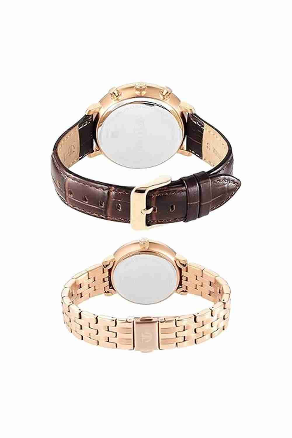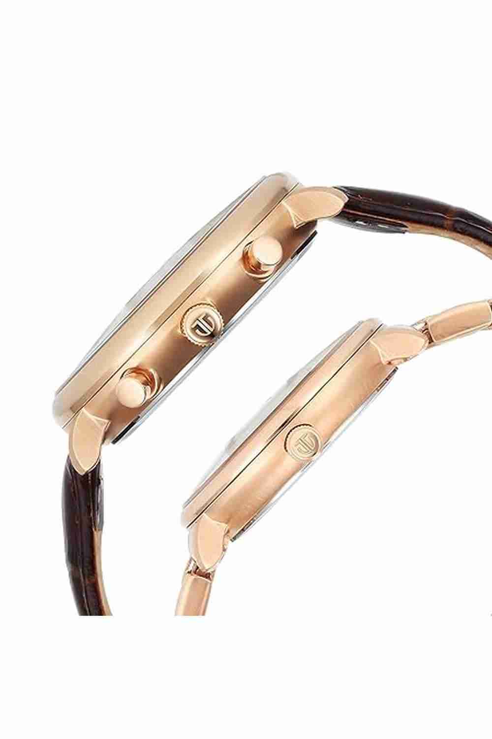 This refined Couple Watch Set beautifully symbolizes love and togetherness. Both timepieces feature a rich brown sunray dial with classic Roman numeral markers for an elegant, timeless look. The men’s watch includes multifunction sub-dials and a chic brown leather strap, blending functionality with style. The women’s watch is enhanced by a luxurious gold-toned stainless steel strap, adding a touch of graceful sophistication.