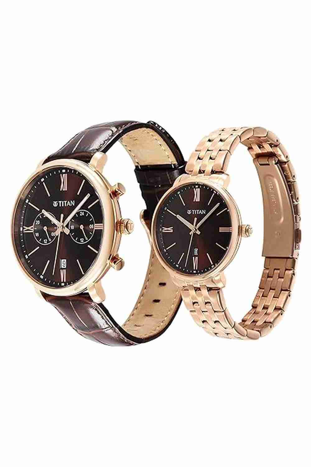 Home/Analog Watches/Titan/bandhan couple's quartz analogue watch - brown dial with brown leather and rose gold stainless steel strap (nt9400794207wz02)