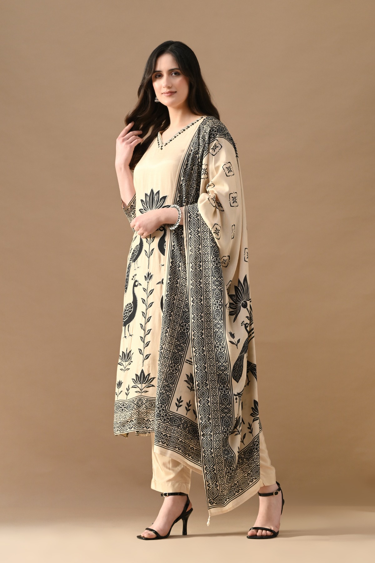 This elegant beige printed stone embellished kurta set features a v-neck, three-quarter sleeves, side slit, and straight hemline. paired with matching pants and matching dupatta, it blends traditional charm and modern style, perfect for any occasion.