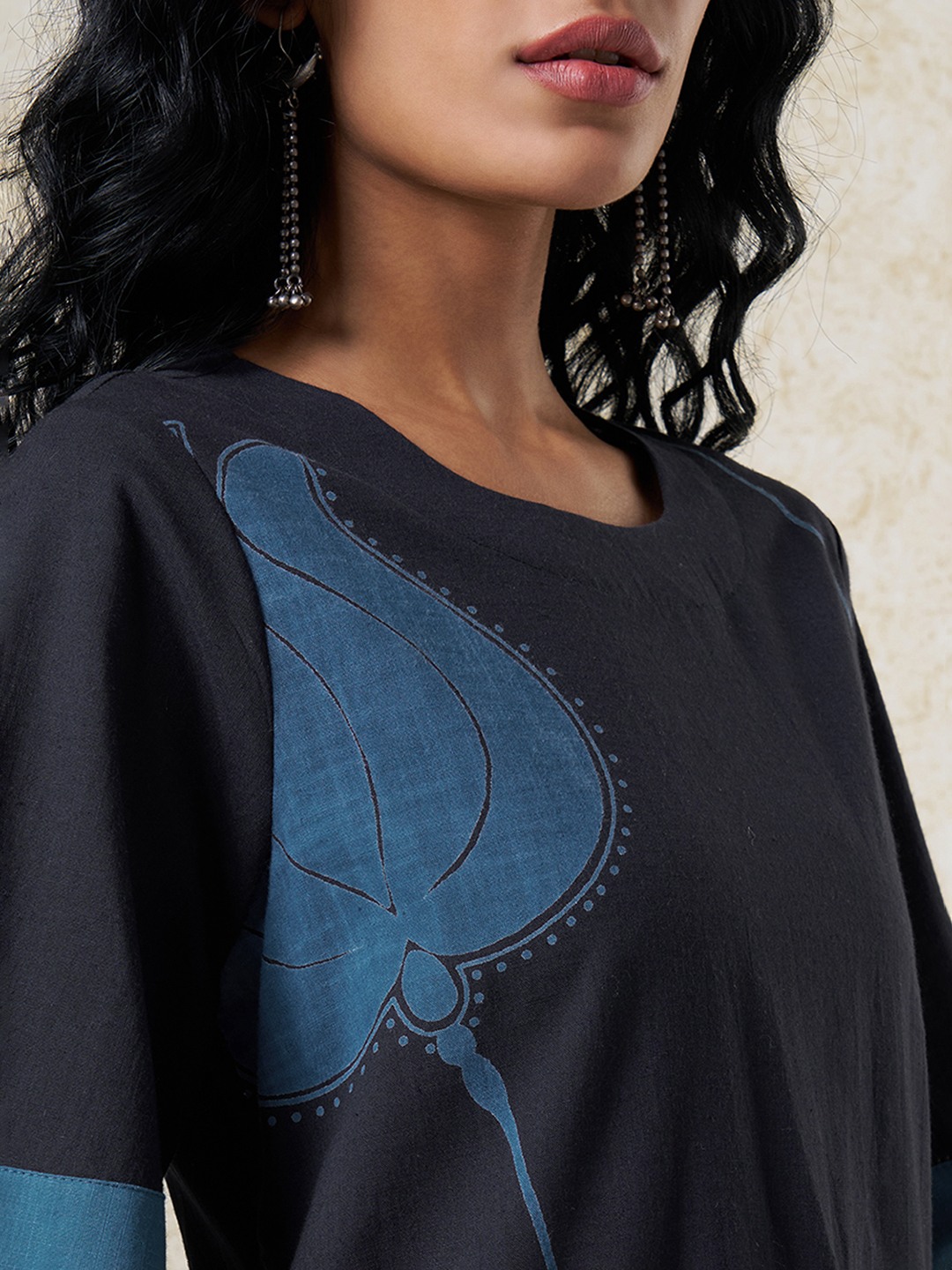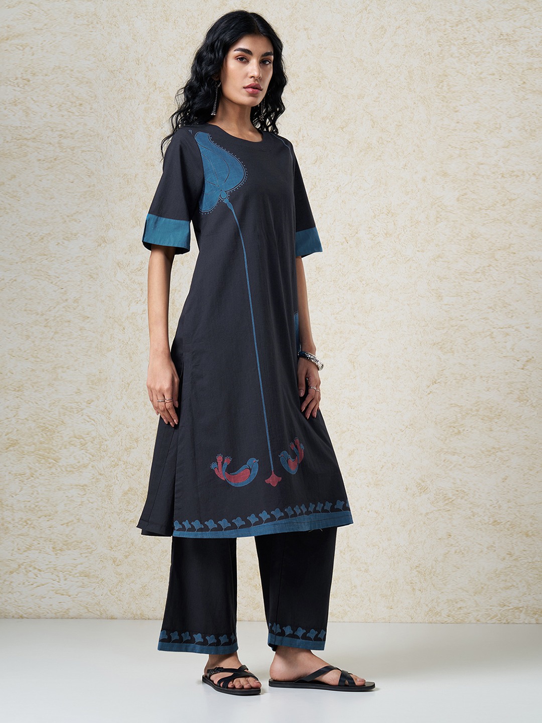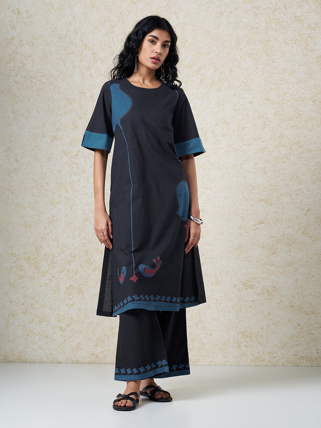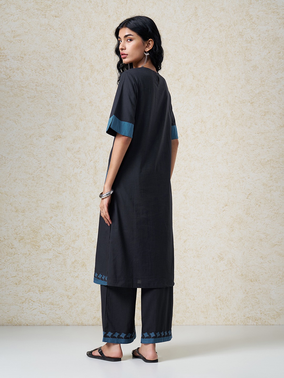 Graphic placement meets fluid coordination in a bold contemporary silhouette. Designed with a round-neck kurta featuring half sleeves with contrast cuffs, highlighted by abstract placement print and linear detailing, paired with matching pants finished with coordinated border accents. Lightweight woven construction offers a breathable hand feel with a soft, easy drape.