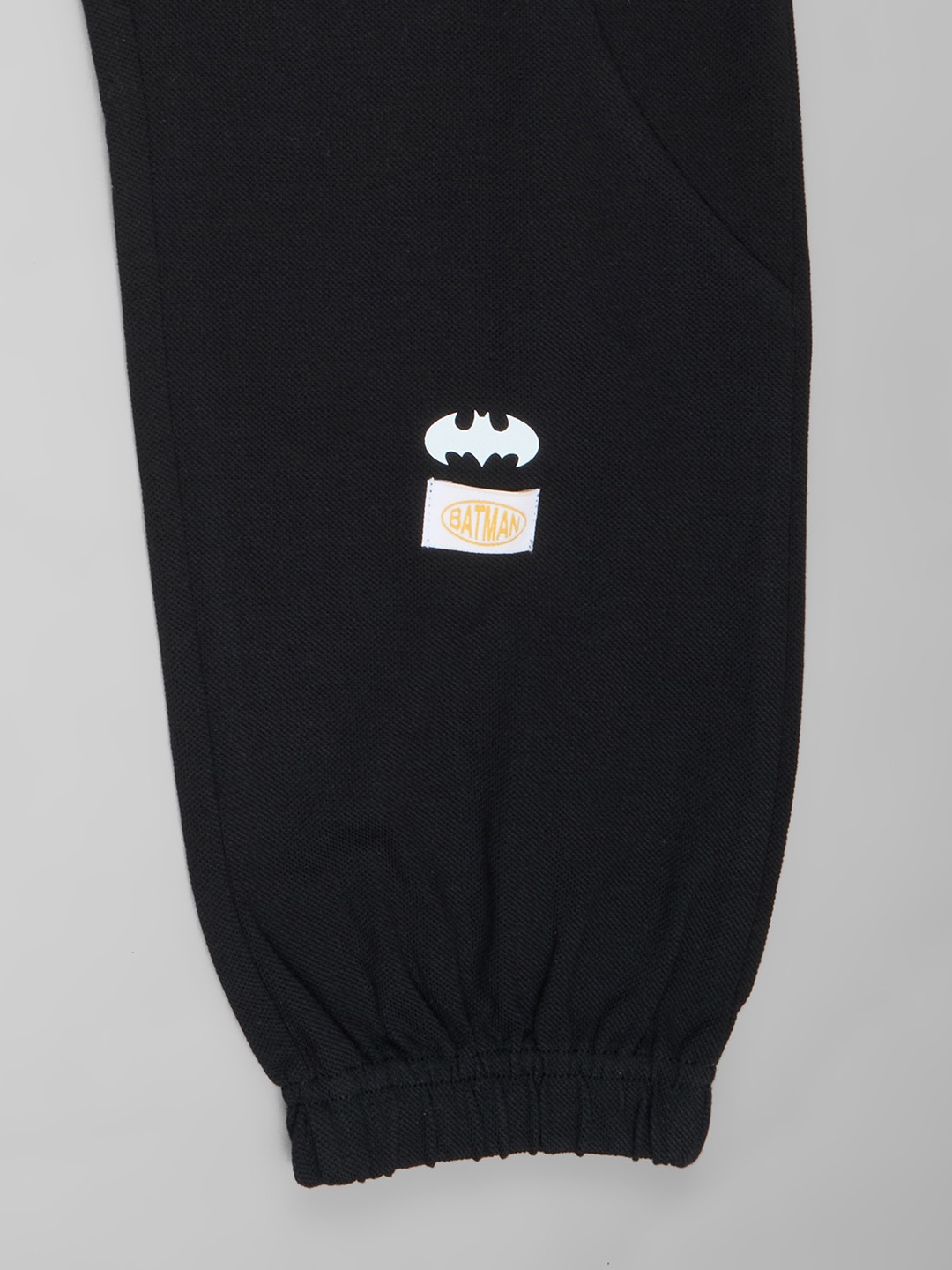 Dark tones with a graphic edge. Designed with an elasticated waistband, adjustable drawstring tie, tapered legs and cuffed hems, these joggers feature a bold vertical typographic print along one leg and a small Batman emblem at the thigh. The soft knit construction offers comfort and flexibility for everyday movement.