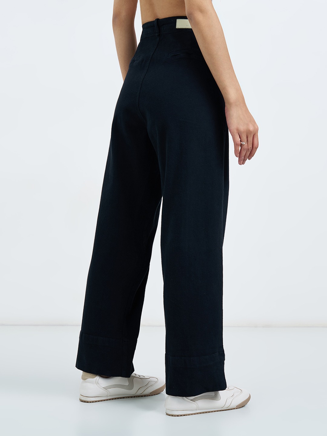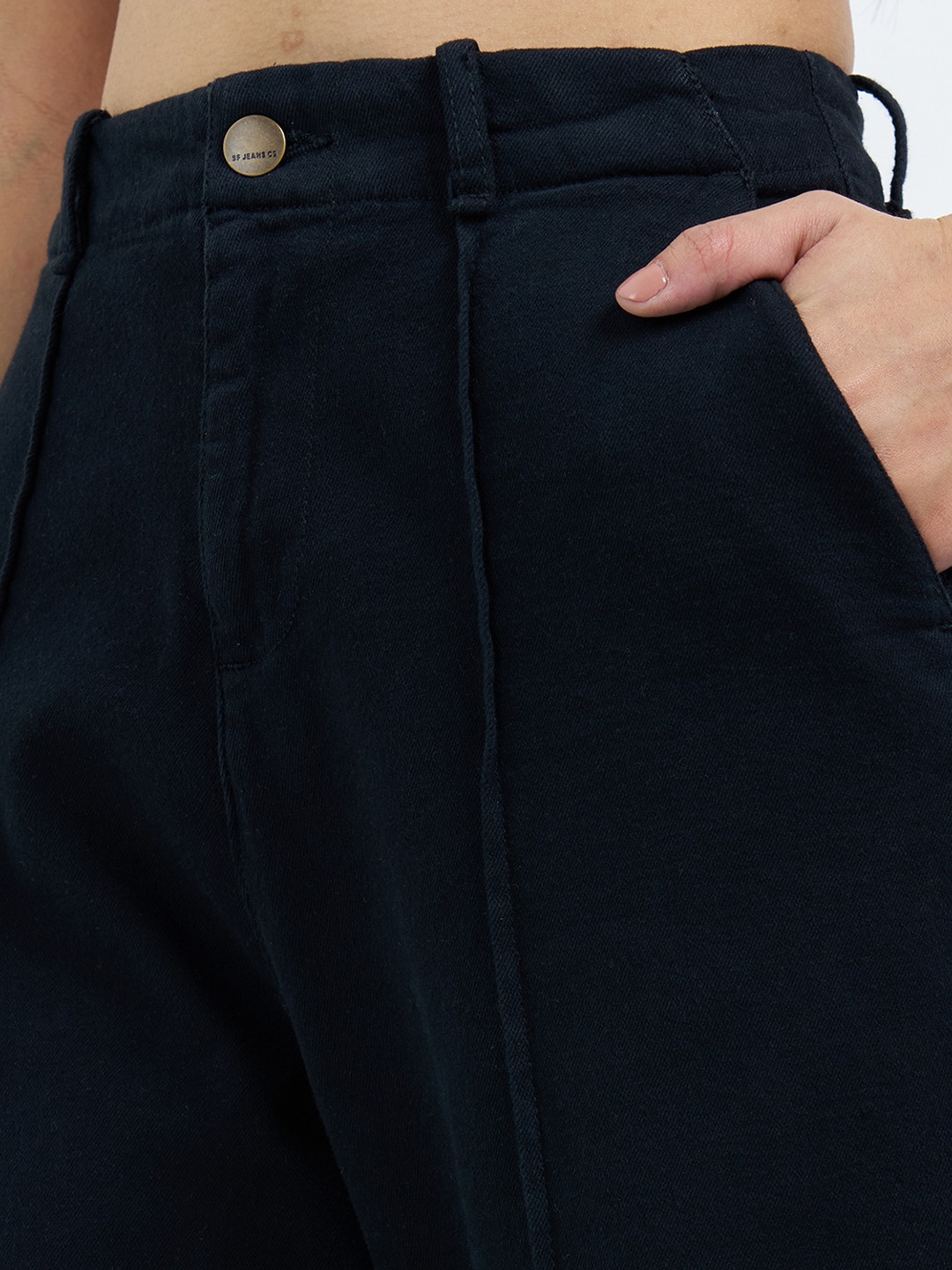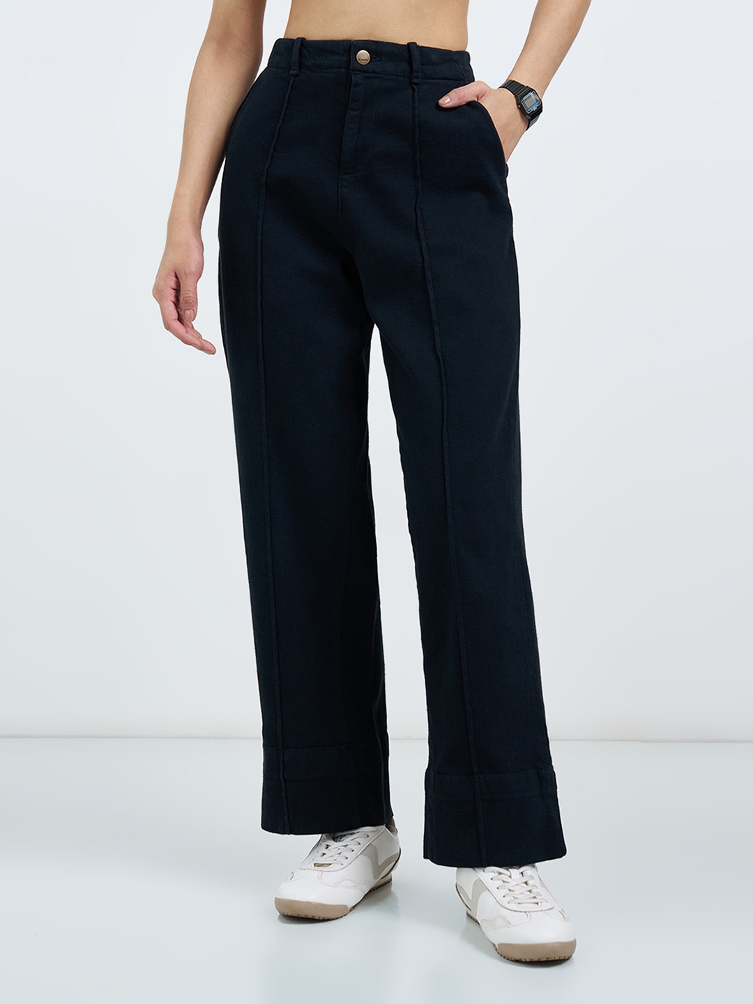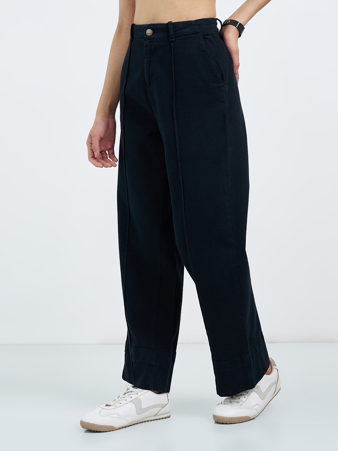 Clean lines and a structured silhouette give these wide leg jeans a sharp, modern edge. Designed with a high-rise waist, classic five-pocket styling and wide legs, they feature subtle front seam detailing that adds definition without breaking the flow. The solid black denim keeps the look polished while allowing the silhouette to stand out.