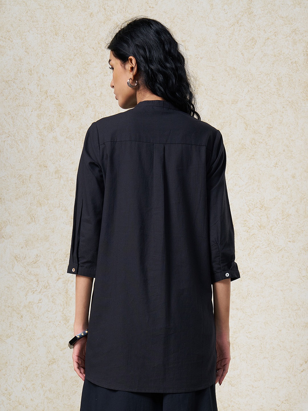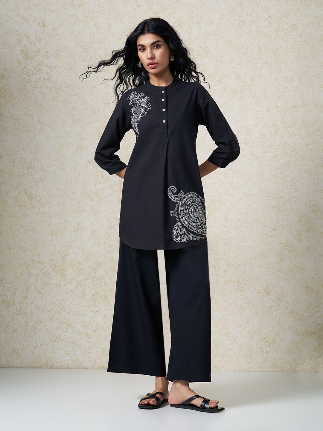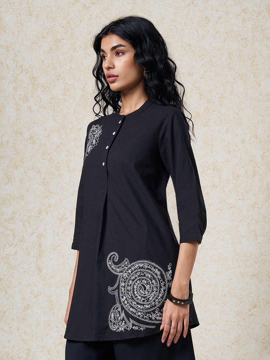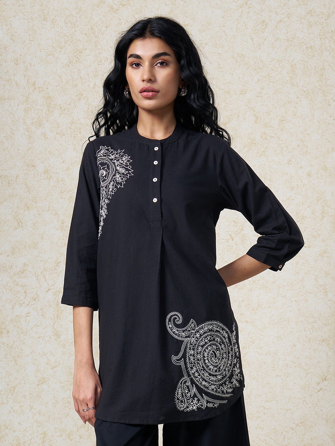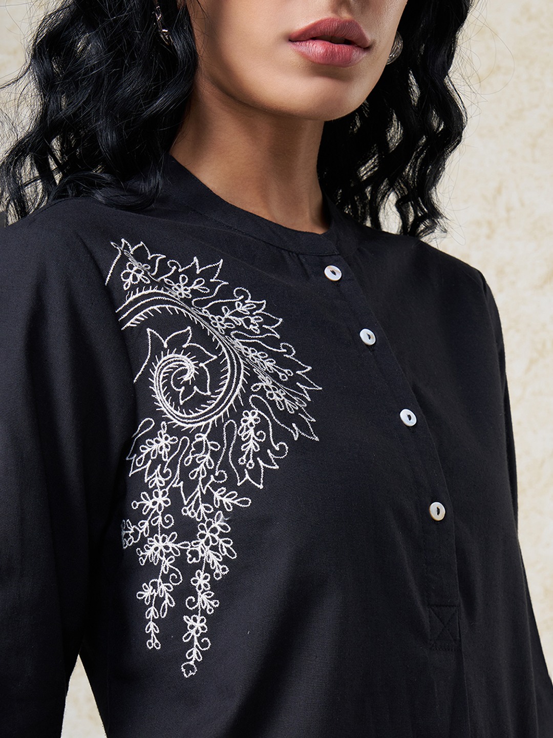 Soft tailoring meets intricate artistry in a refined silhouette. Designed with a mandarin collar, front button placket, and 3/4 sleeves, featuring statement embroidery placement that adds ornamental focus. Lightweight woven construction offers a breathable hand feel with a smooth, graceful drape.