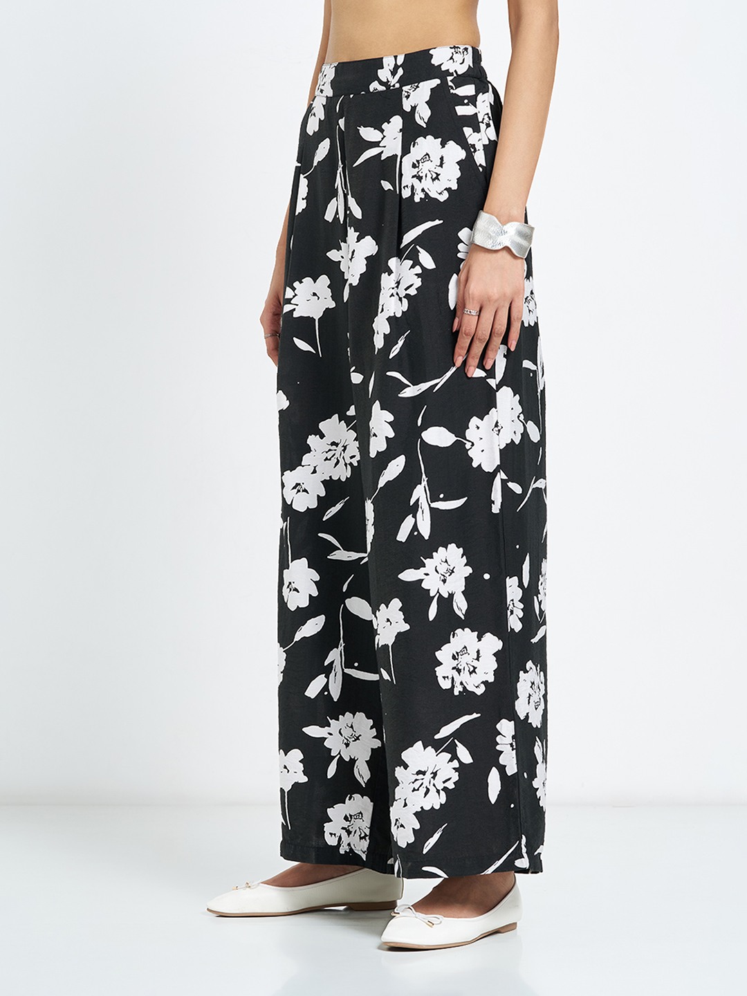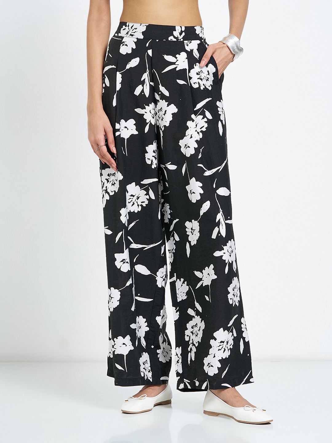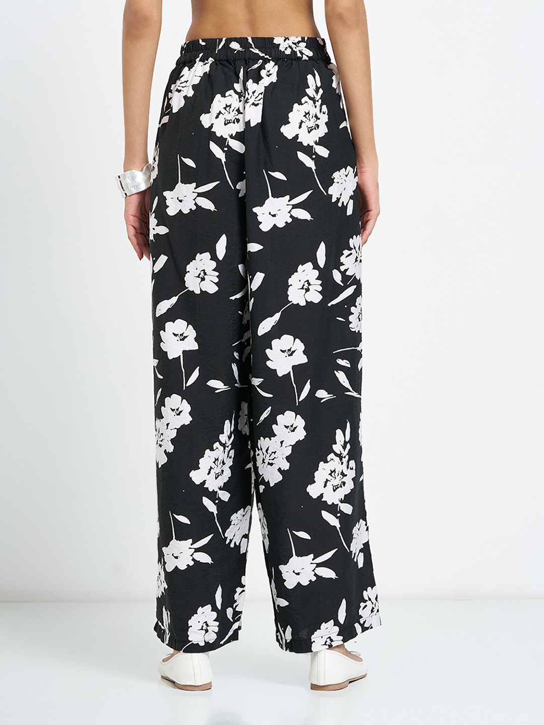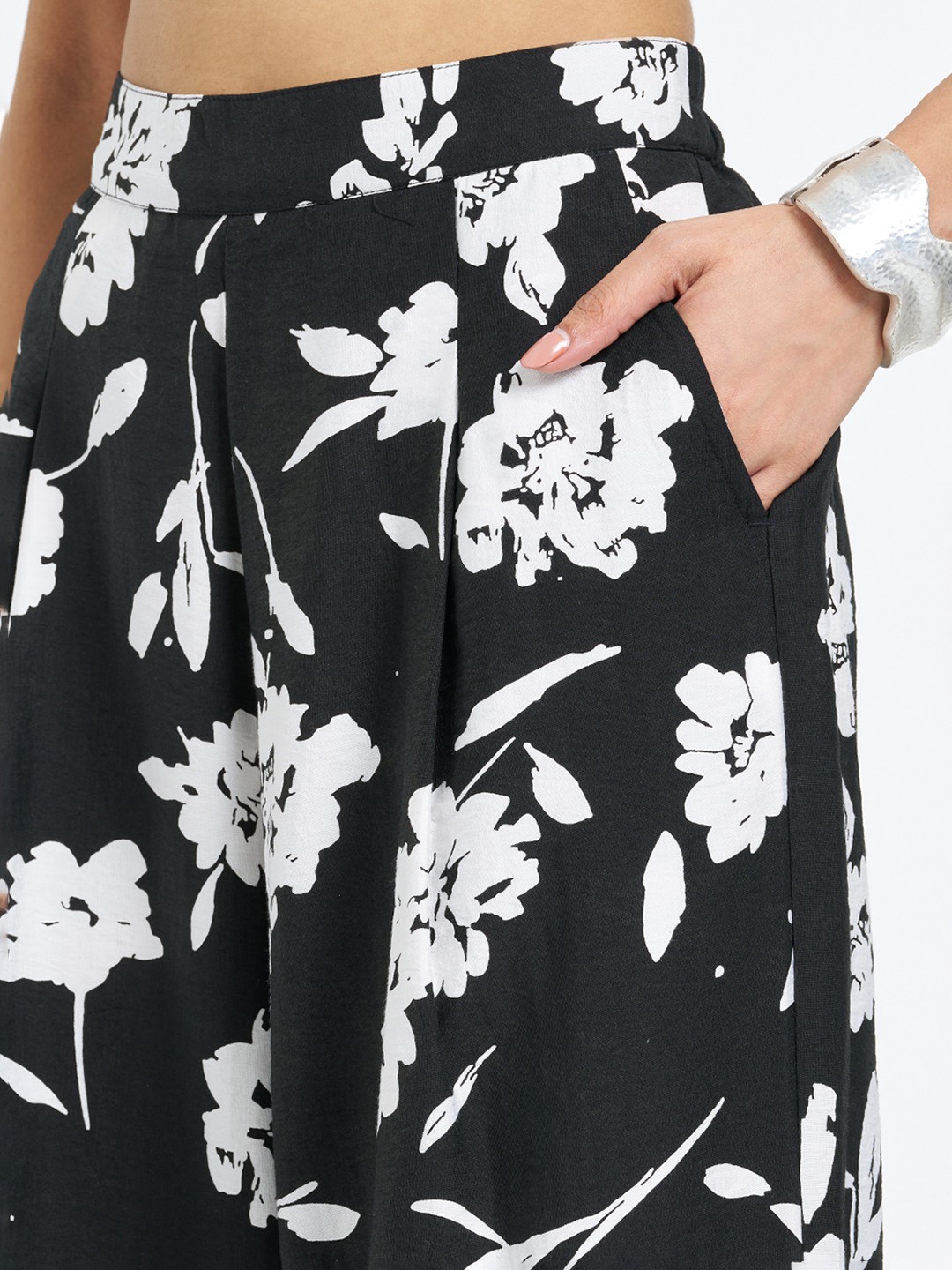 Monochrome florals lend this pair a bold yet refined presence. Designed with an elasticated waistband, it features front pleats, functional side pockets and a flowing wide leg silhouette. Lightweight woven construction keeps the drape fluid and comfortable through the day.