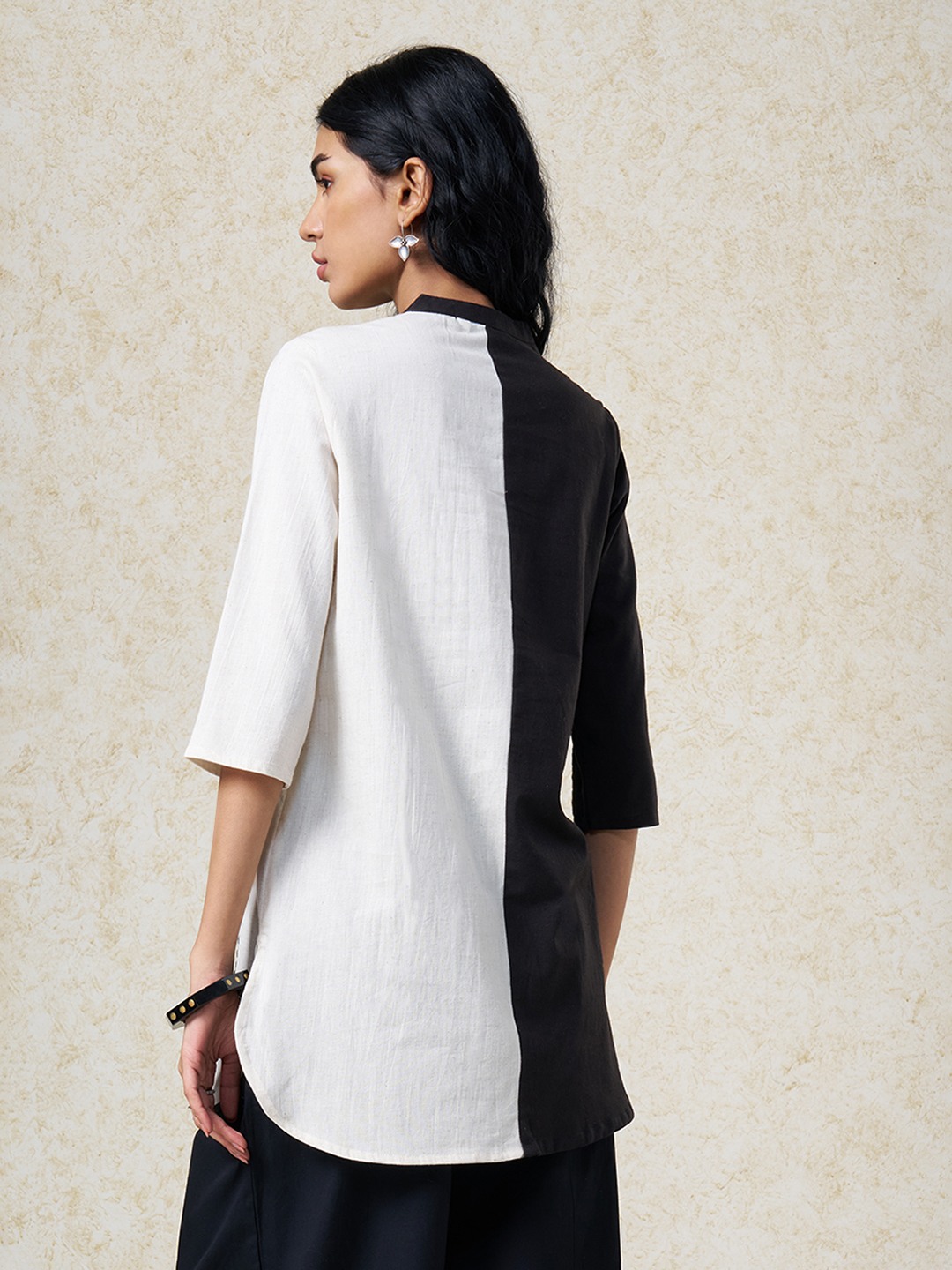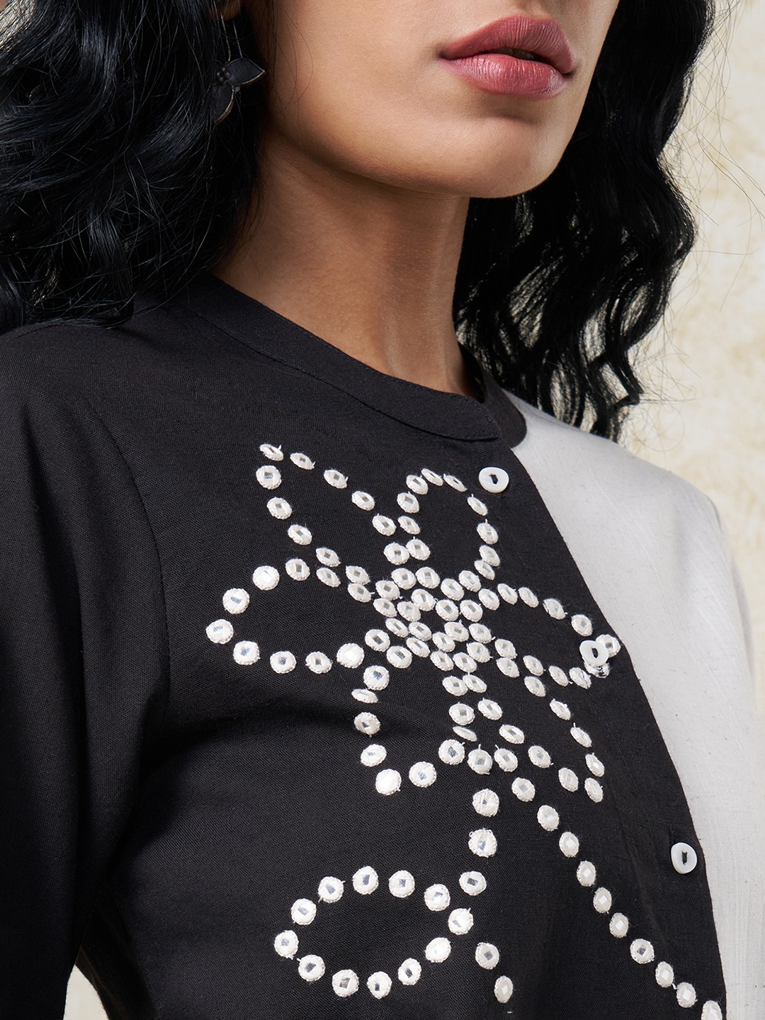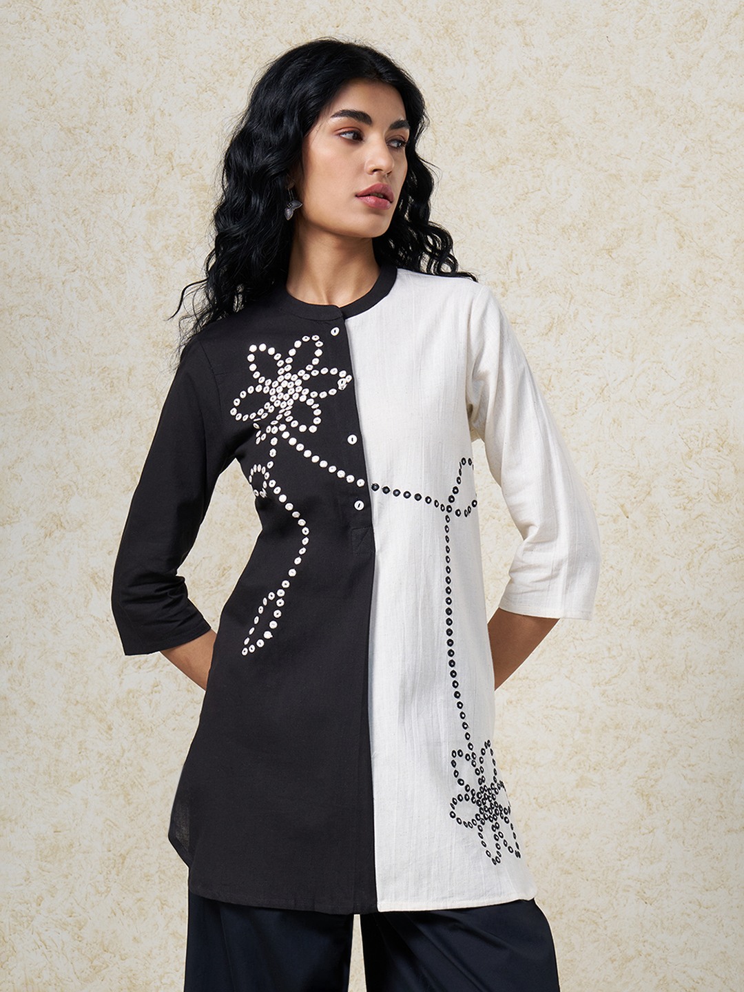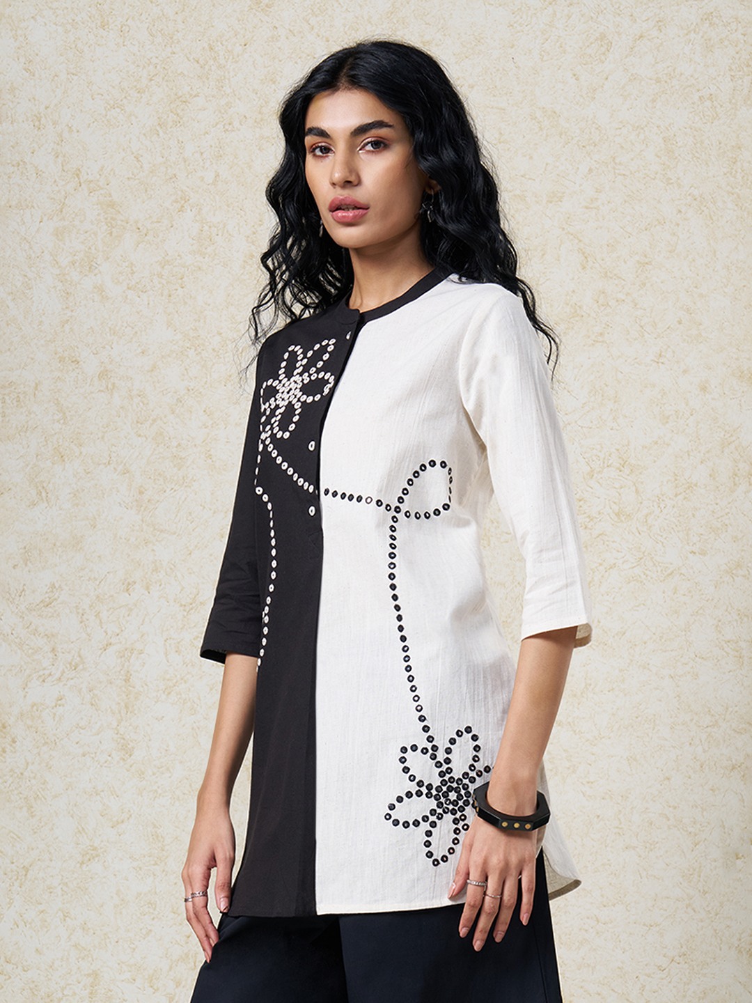Graphic contrast meets delicate embellishment in a sharply defined silhouette. Designed with a mandarin collar and 3/4 sleeves, it features a split colour block construction highlighted with mirror embellishment tracing across the front. Lightweight woven construction offers a breathable hand feel with a clean, structured drape.