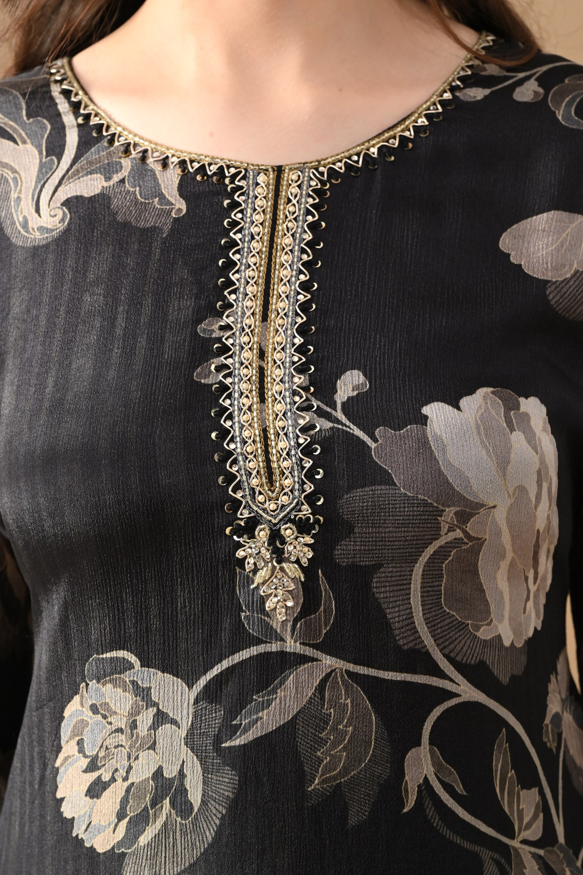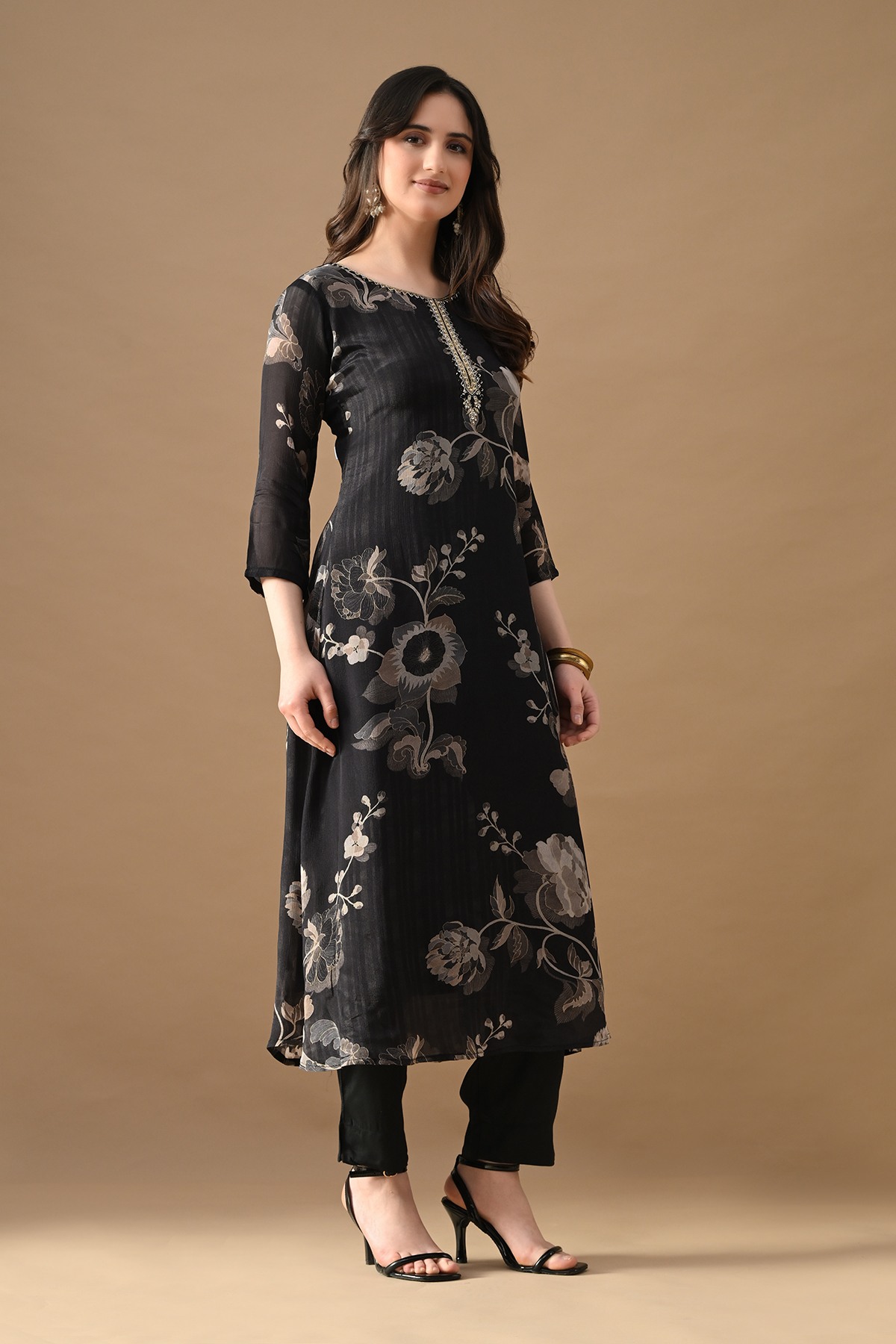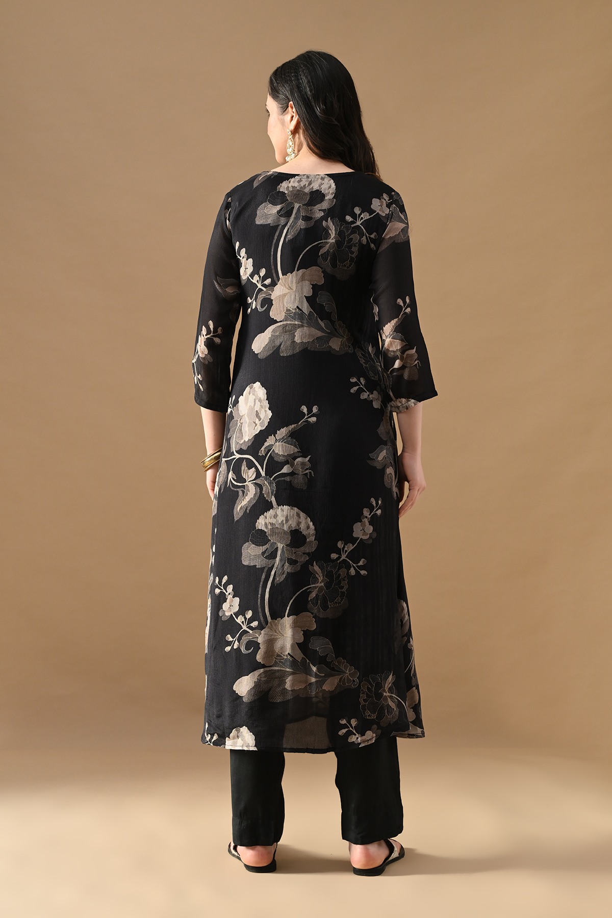 Elevate your everyday look with this black printed a-line kurta set , designed with round neckline, three-quarter sleeves, and a-line. paired with matching pant which have a functional pocket for ease, it offers the perfect balance of comfort and elegance—ideal for casual gatherings as well as semi-formal occasions.