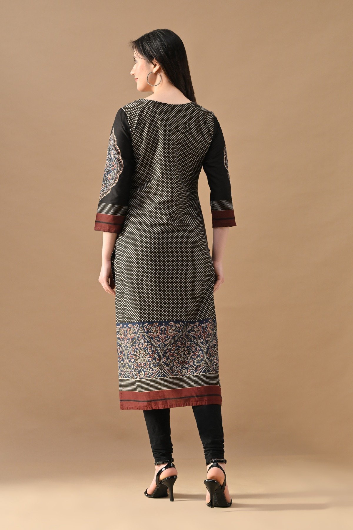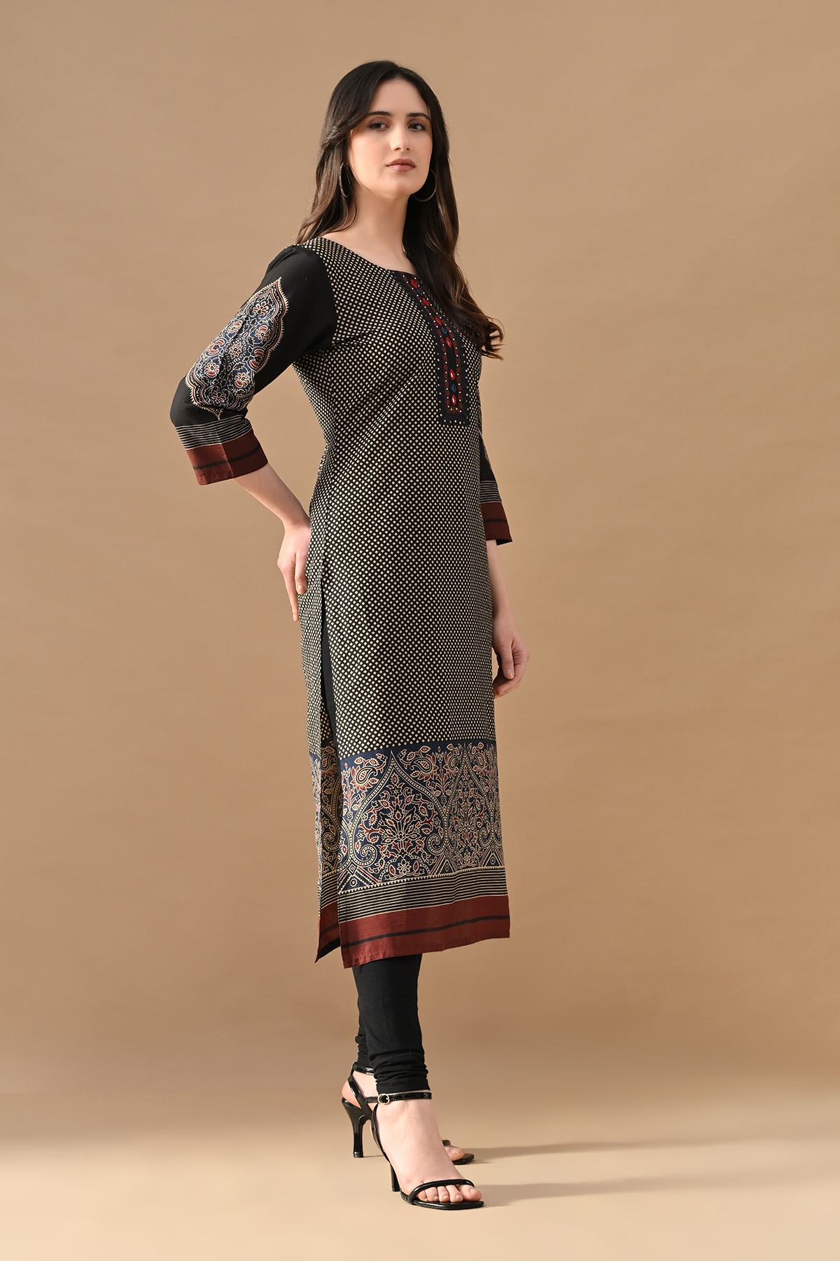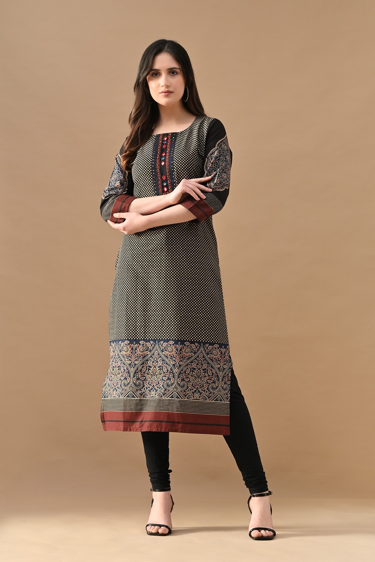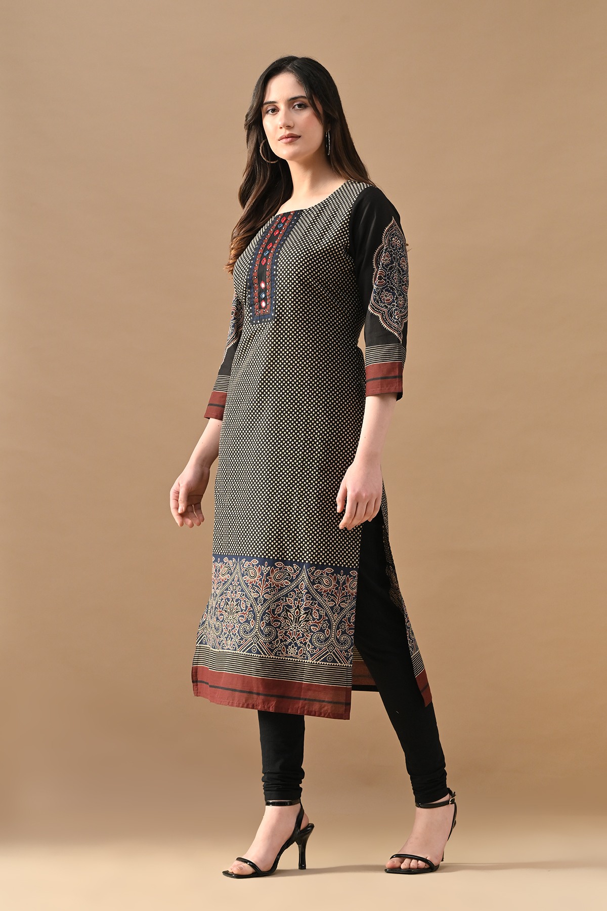 Step out in effortless charm with our black printed ethnic motifs straight kurta. designed with round neckline, three-quarter sleeves, side-slits, straight hemline, this versatile piece beautifully blends comfort with elegance—making it perfect for casual outings.