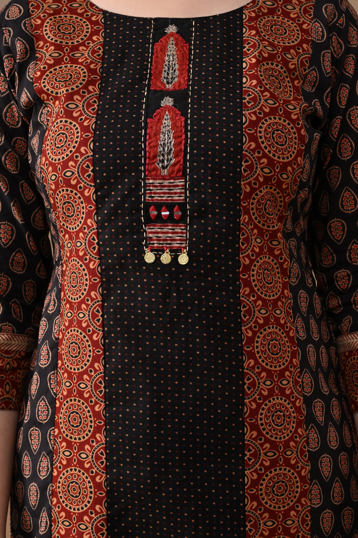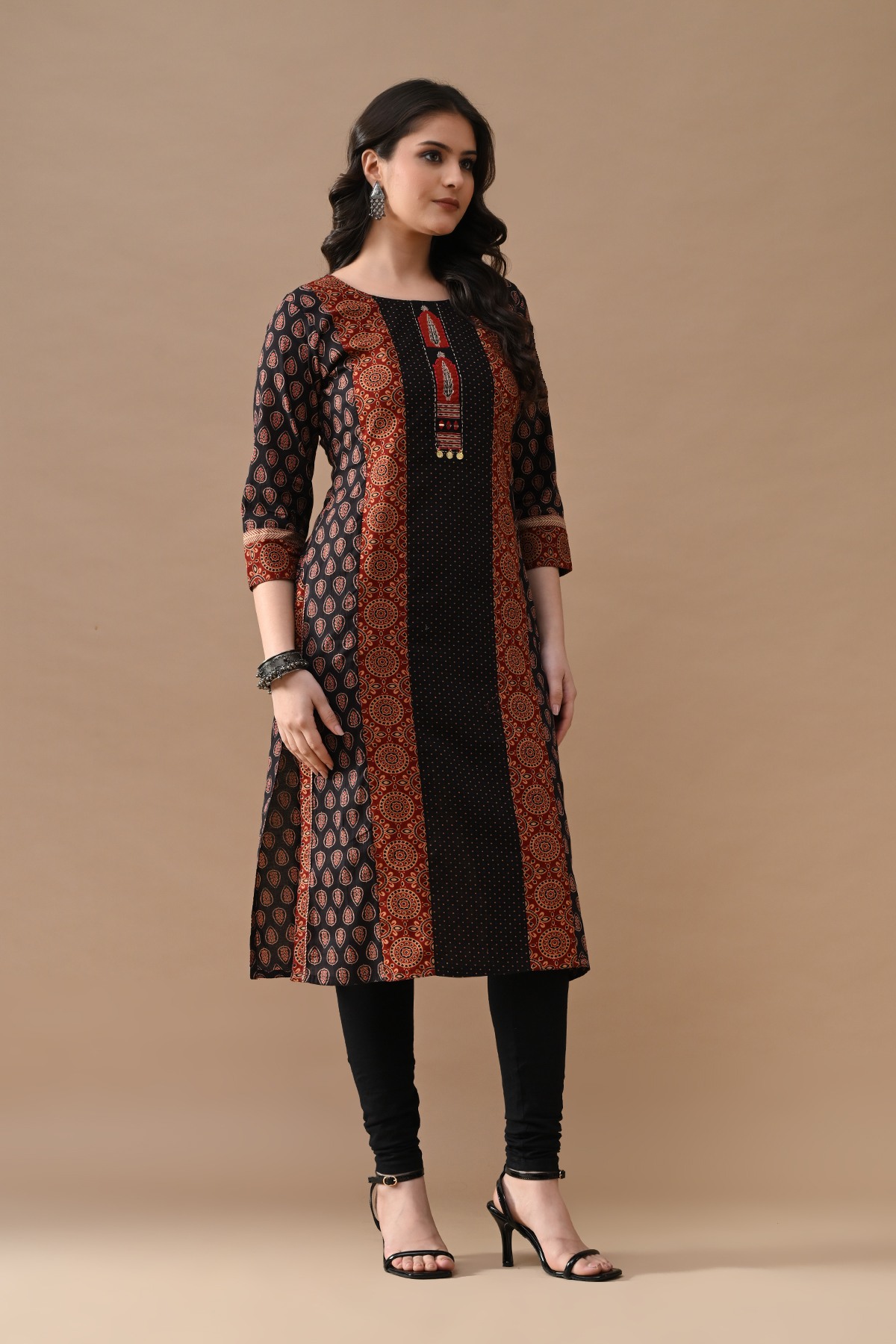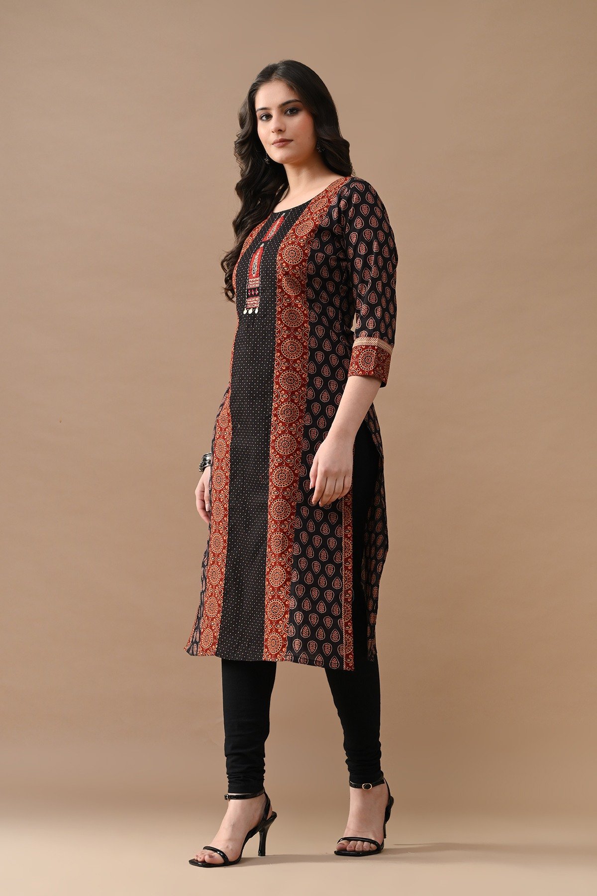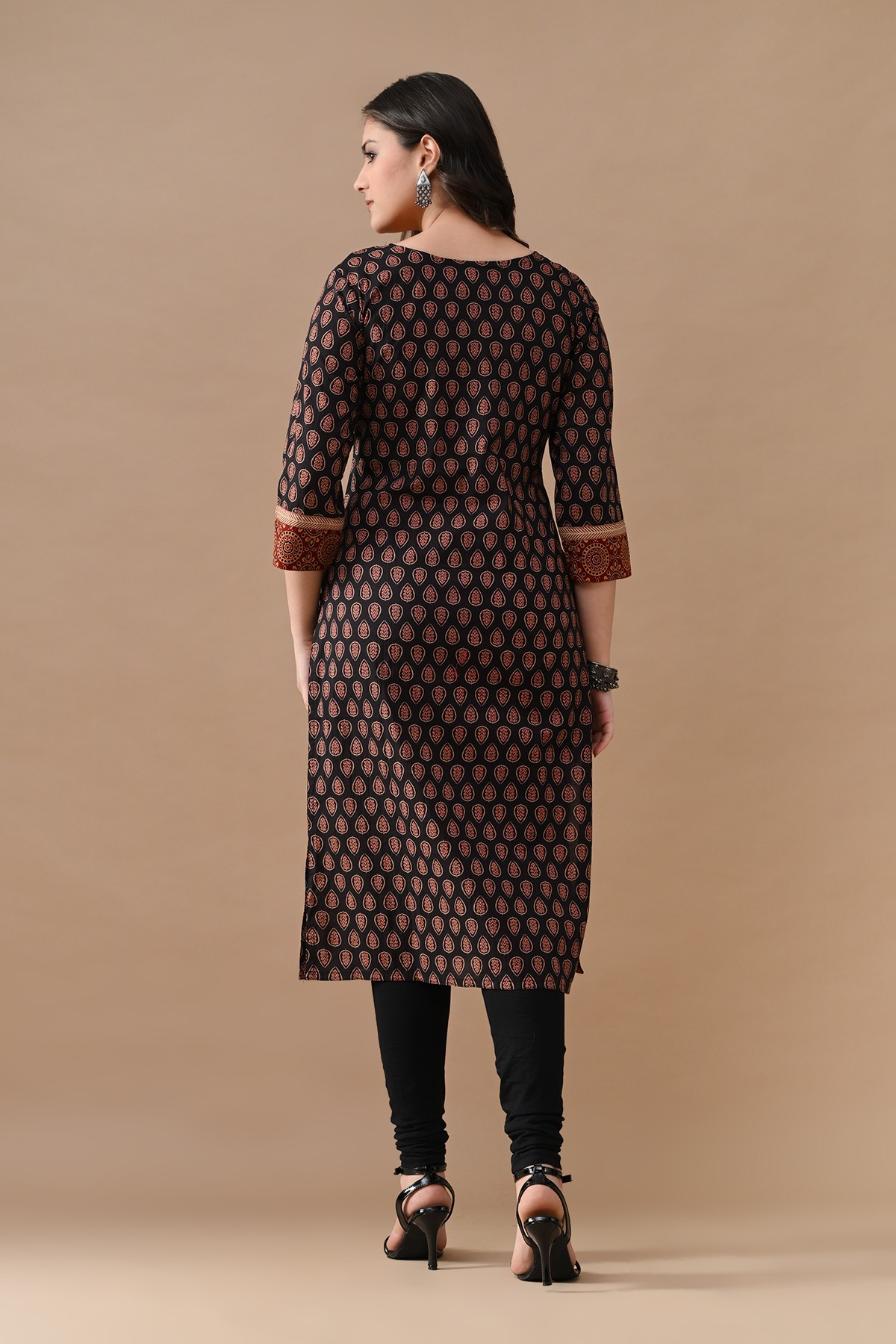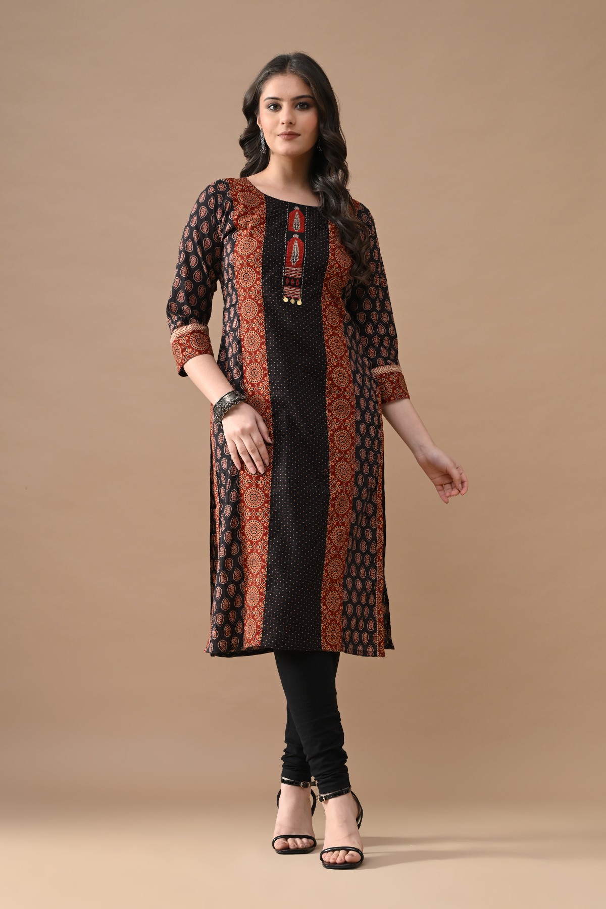 Step out in effortless charm with our black printed straight kurta with a touch of rust color blend. designed with round neckline, three-quarter sleeves, side-slits, straight hemline, this versatile piece beautifully blends comfort with elegance—making it perfect for casual outings.