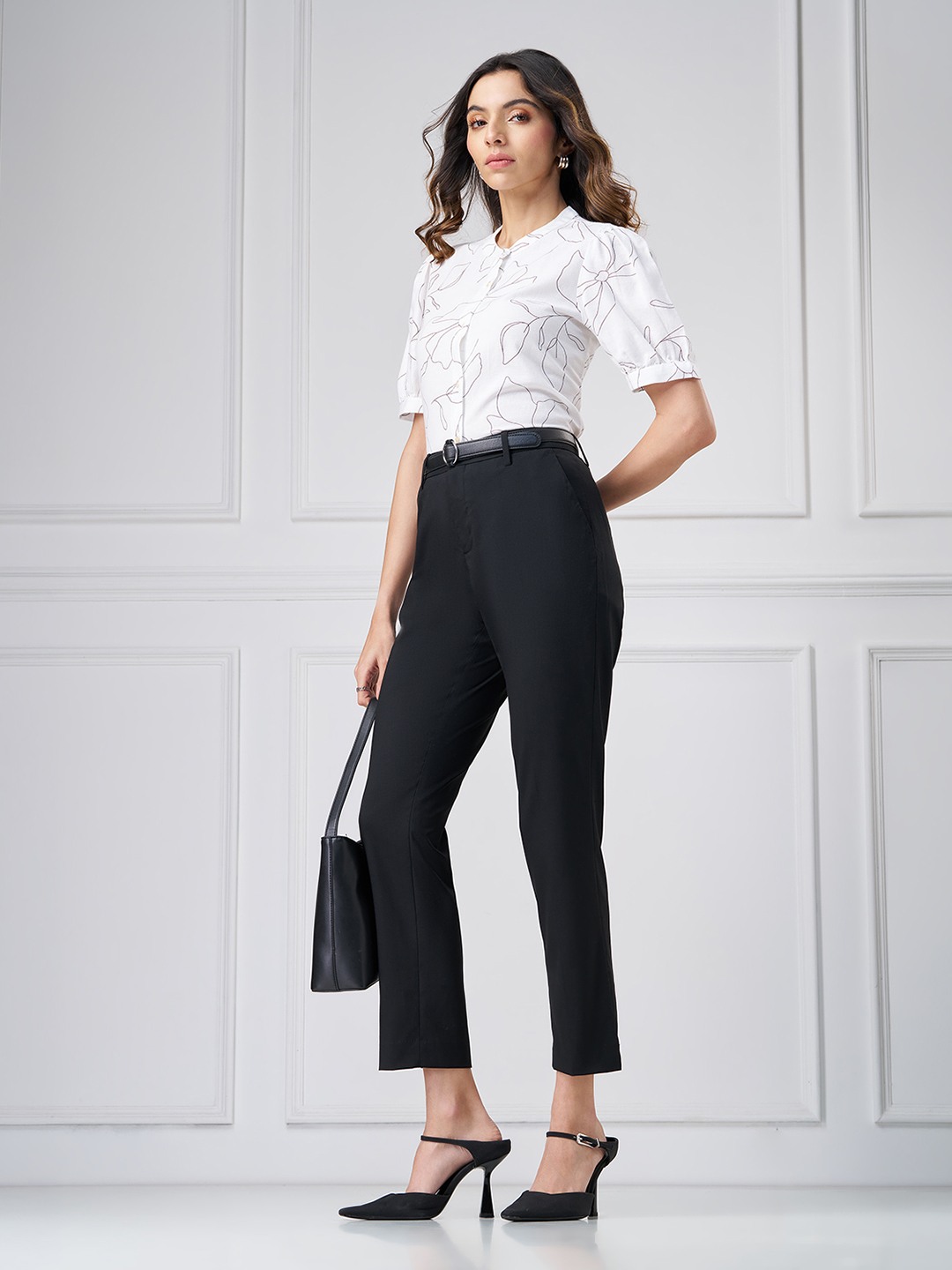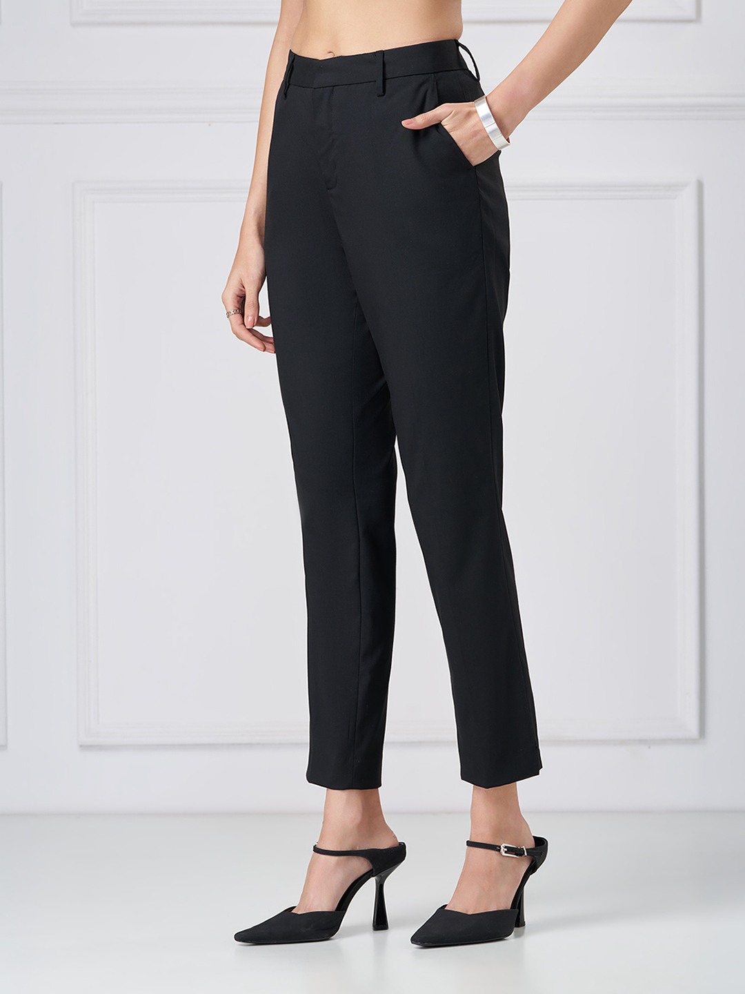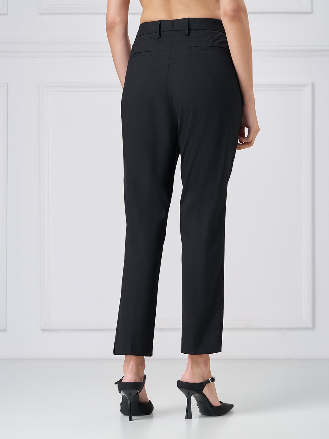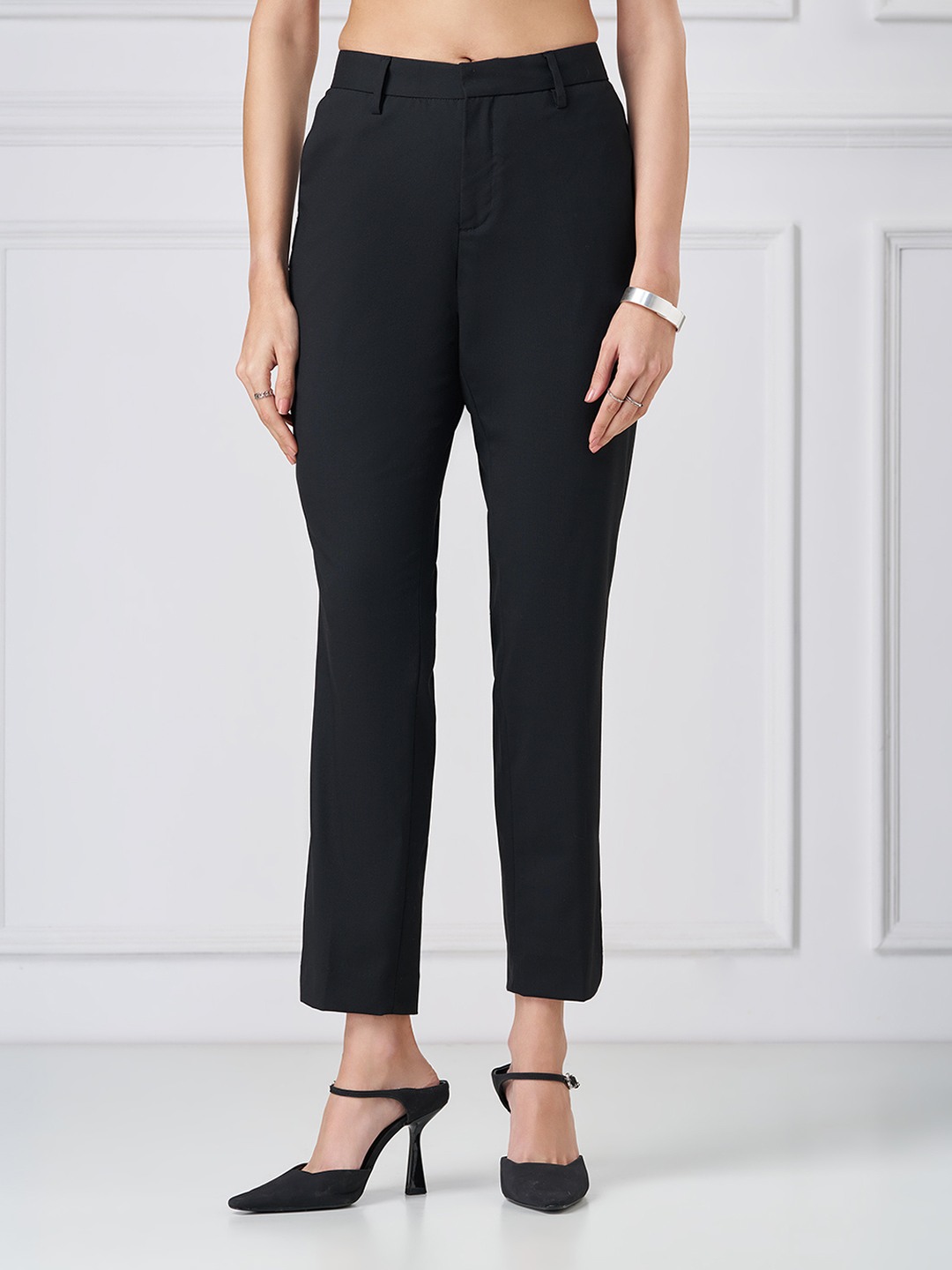 Clean lines meet tailored precision. Designed with a mid-rise waistband featuring belt loops, a concealed front fastening, functional side pockets and a streamlined silhouette, these trousers deliver a sharp structured finish. The woven construction offers a smooth hand feel with a refined drape that holds its shape through the day.