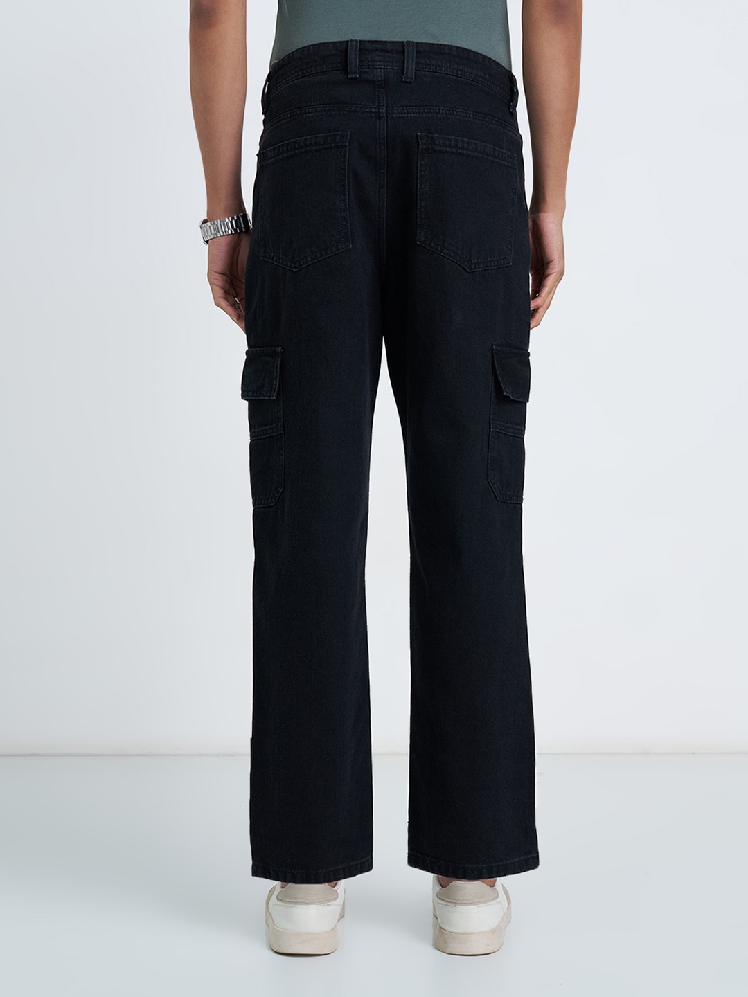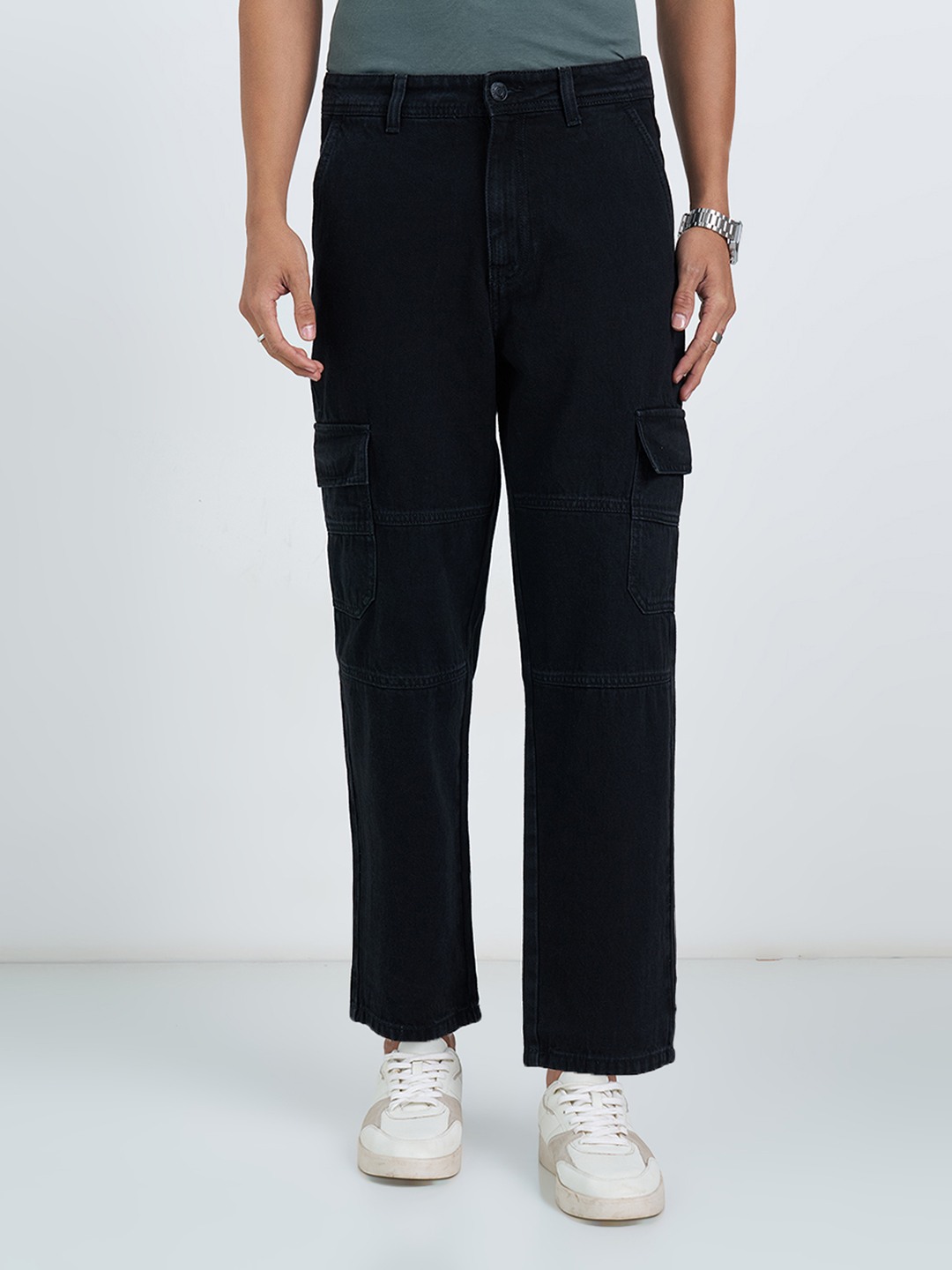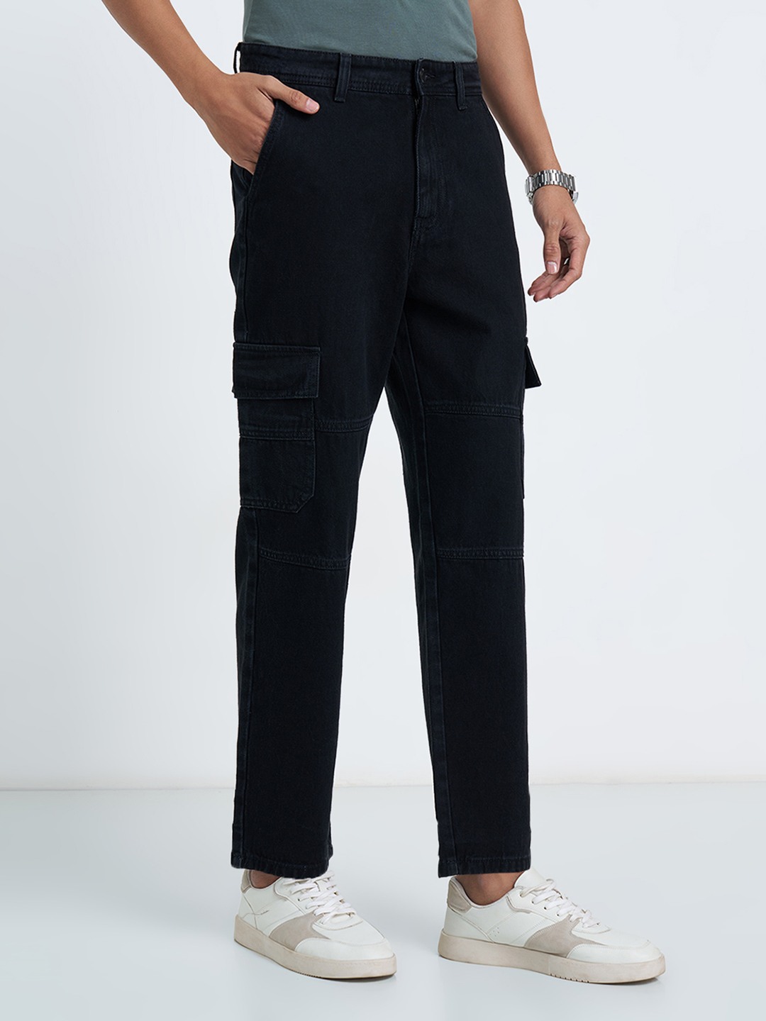 Utility meets everyday ease in these cleanly structured denim cargos. Designed with a relaxed silhouette, they feature a classic button-zip closure, multiple flap cargo pockets, and panelled seam detailing that adds a subtle workwear edge. Crafted in sturdy denim, they hold their shape while staying comfortable through the day.
