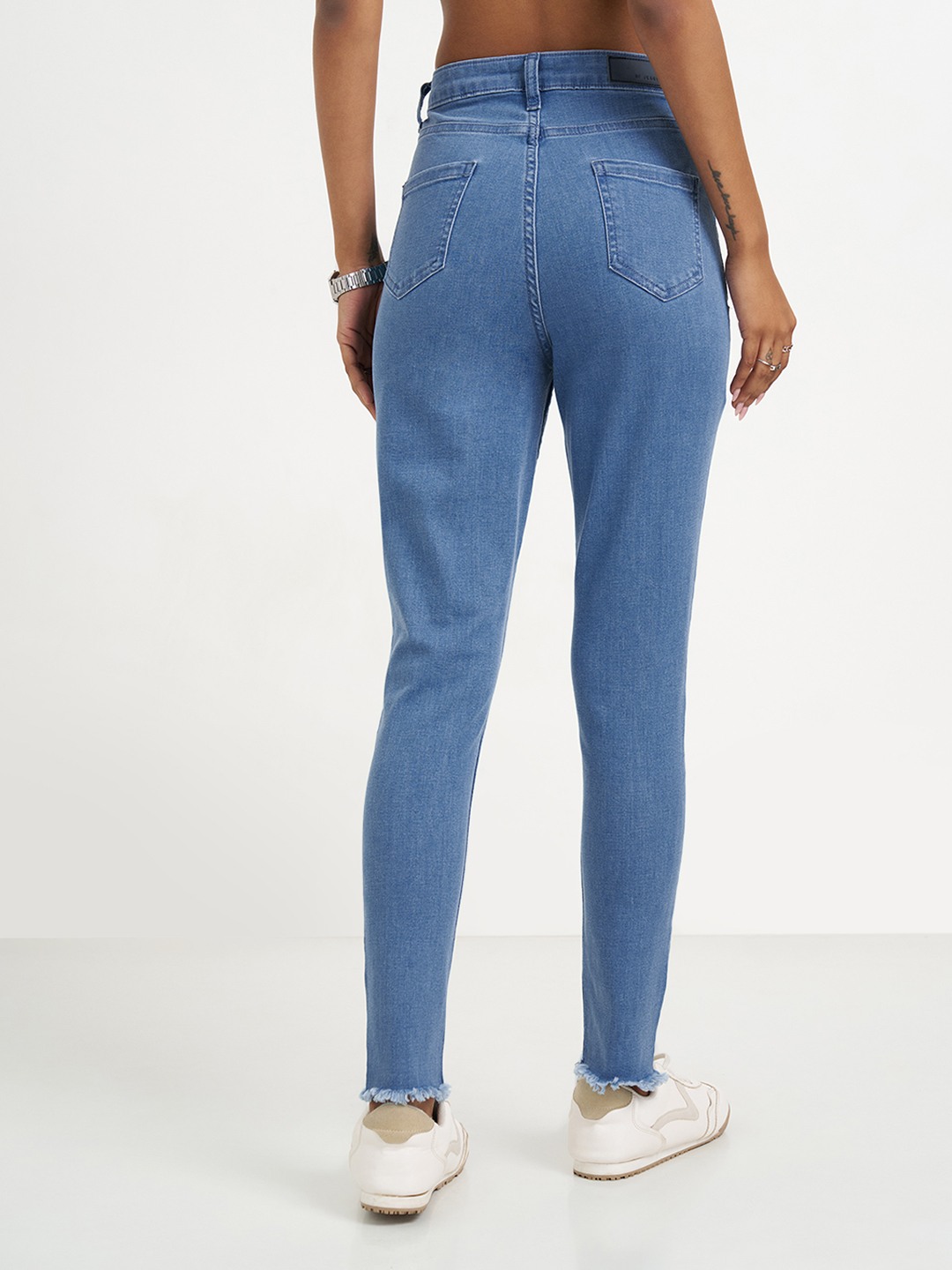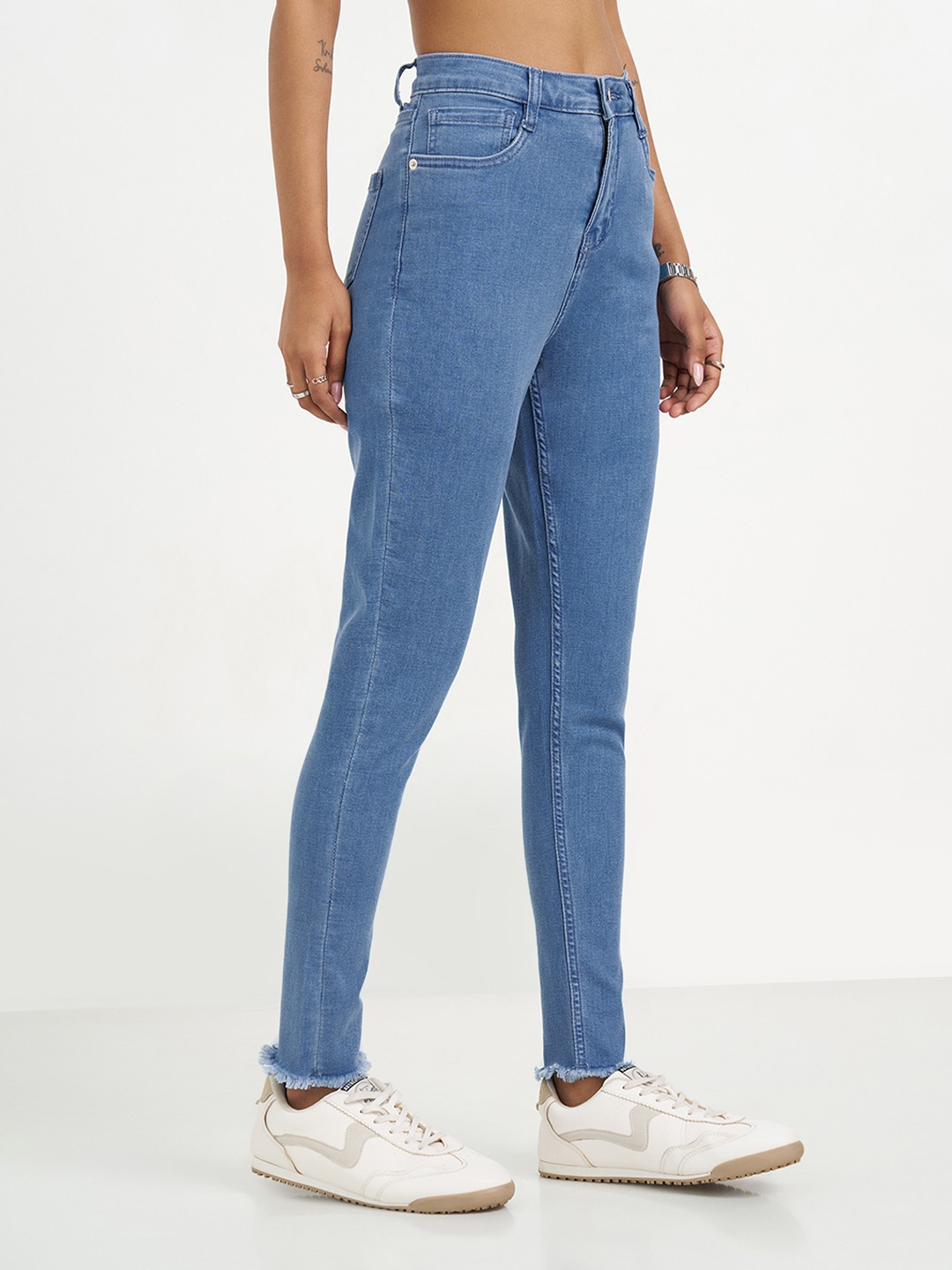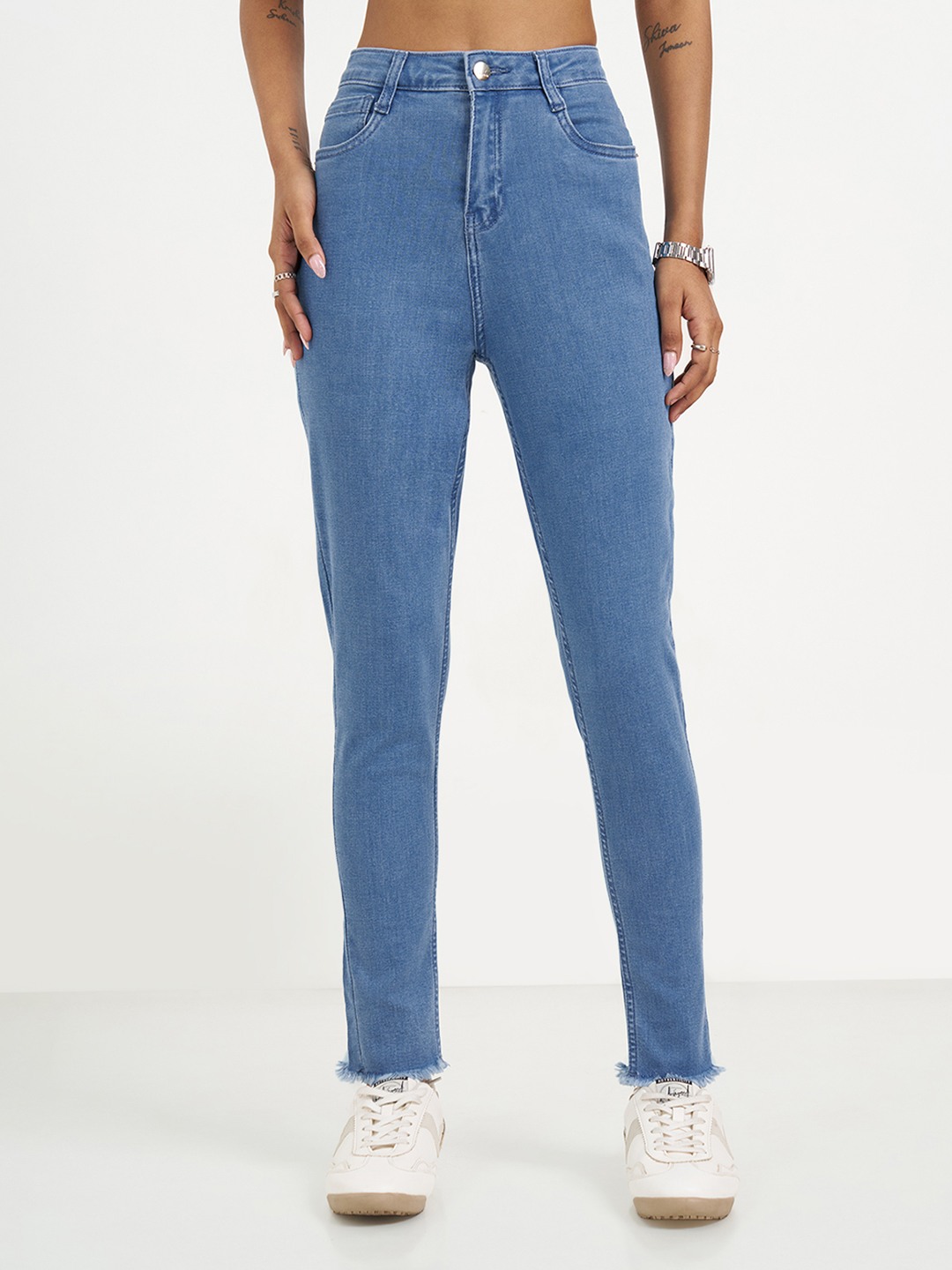 Sharp and streamlined, these skinny fit jeans are designed to contour the leg for a clean, modern silhouette. Featuring a classic five-pocket construction with a button-zip fly, they are finished with a lightly washed look and raw, frayed hems that add subtle edge. The stretch denim offers a close fit while staying comfortable through the day.