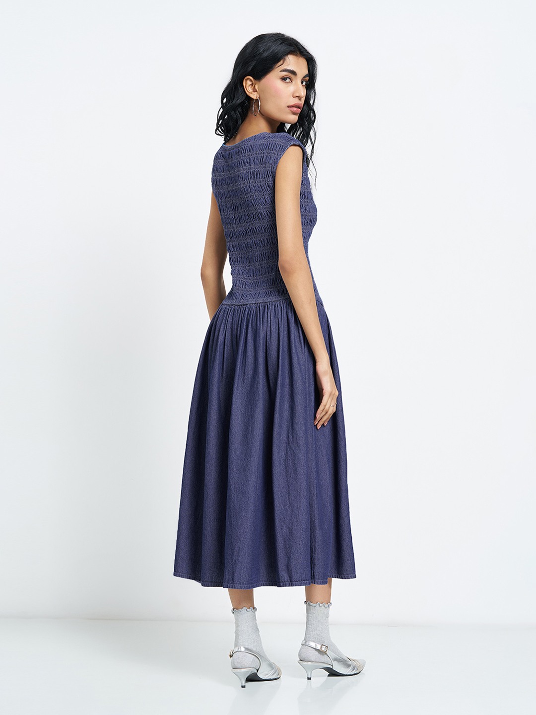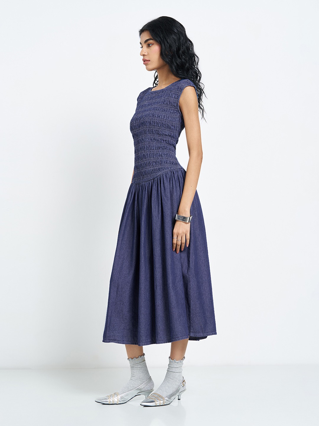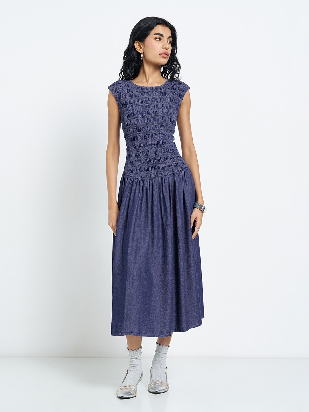 Textured smocking brings sculpted definition to this modern denim silhouette. Designed with a round neckline and cap sleeves, it features a fully smocked fitted bodice that flows into a softly gathered midi skirt for fluid movement. Lightweight denim construction gives the piece a structured yet breathable feel.