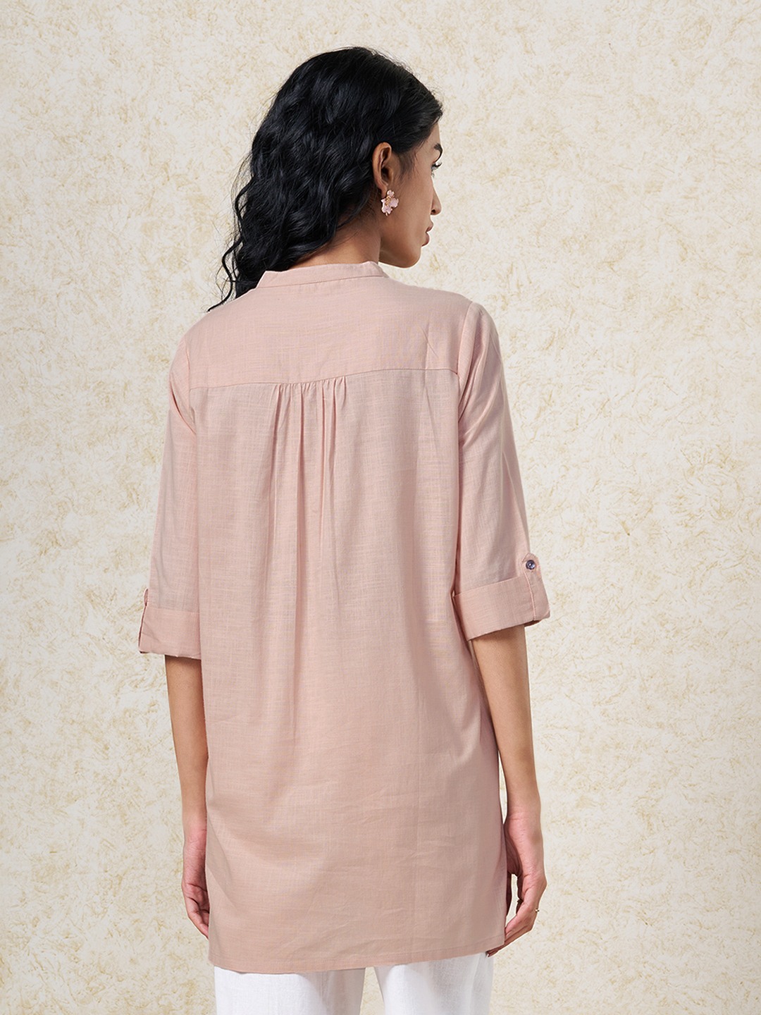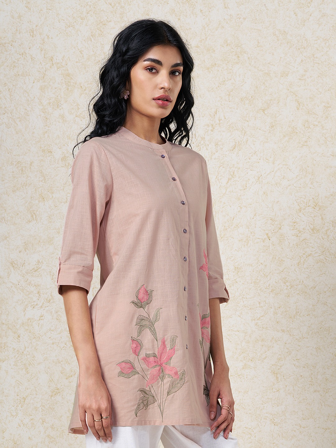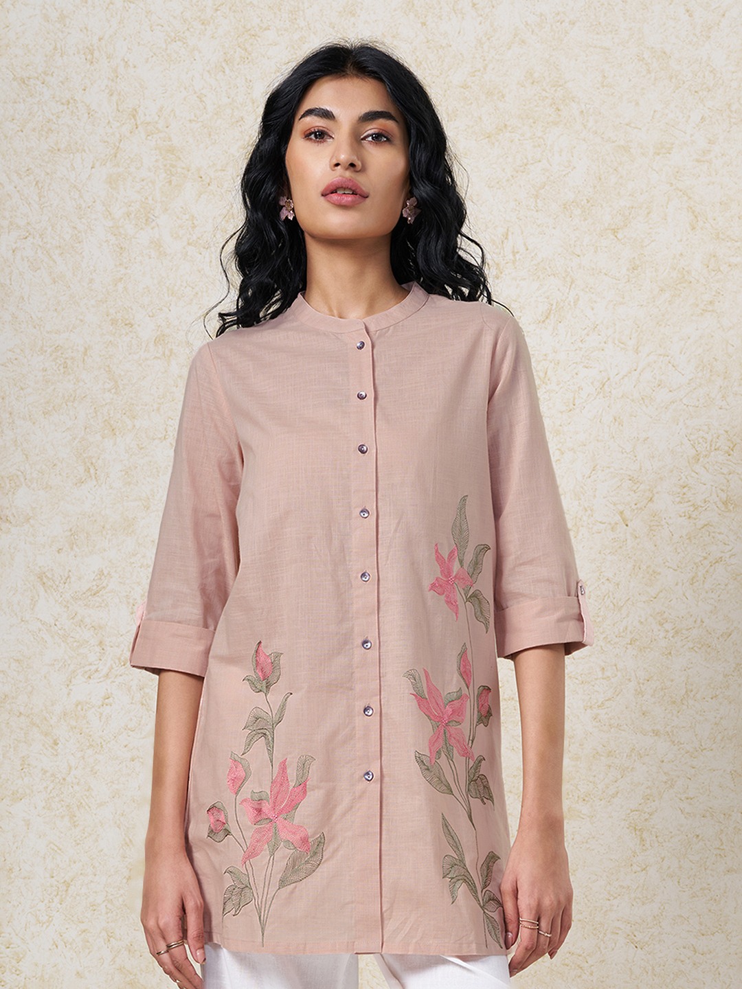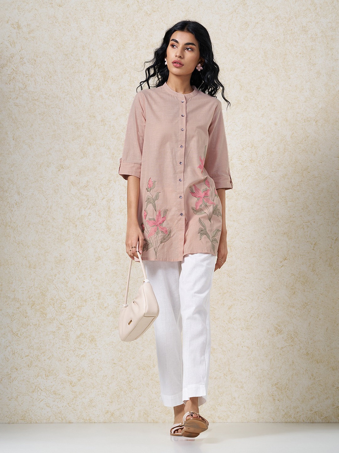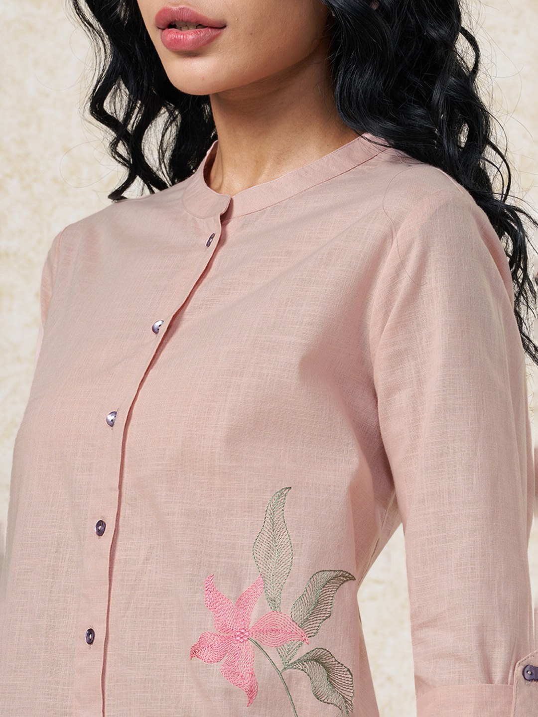 Soft tailoring meets delicate botanical artistry in a refined elongated silhouette. Designed with a mandarin collar, front button placket, and 3/4 sleeves with tab detailing, featuring floral embroidery placement along the hemline that adds a gentle ornamental focus. Lightweight woven construction offers a breathable hand feel with a smooth, graceful drape.