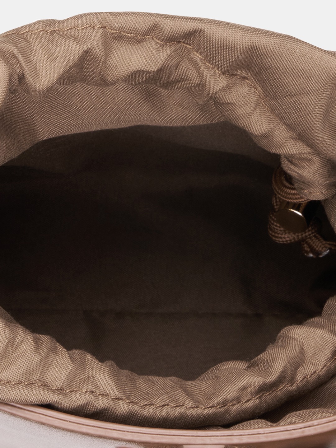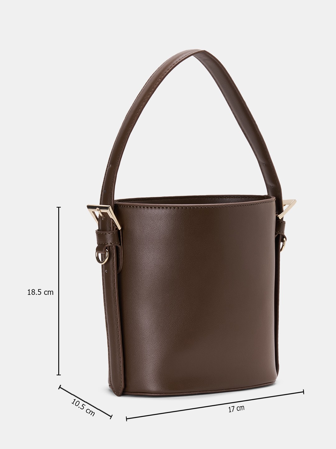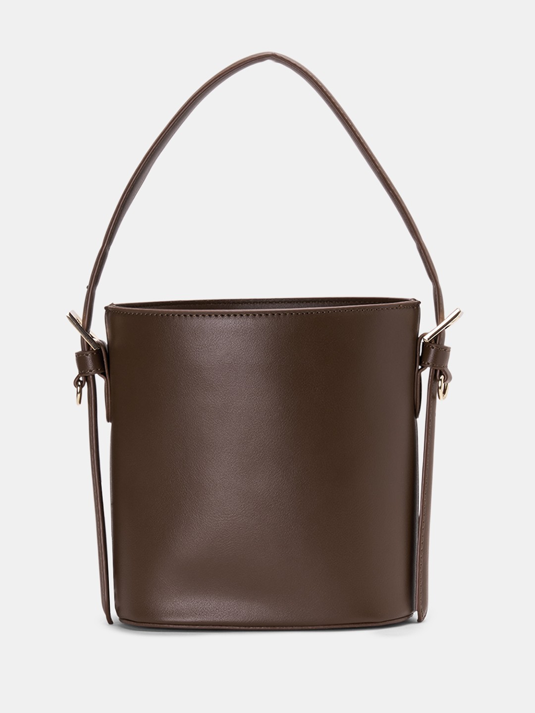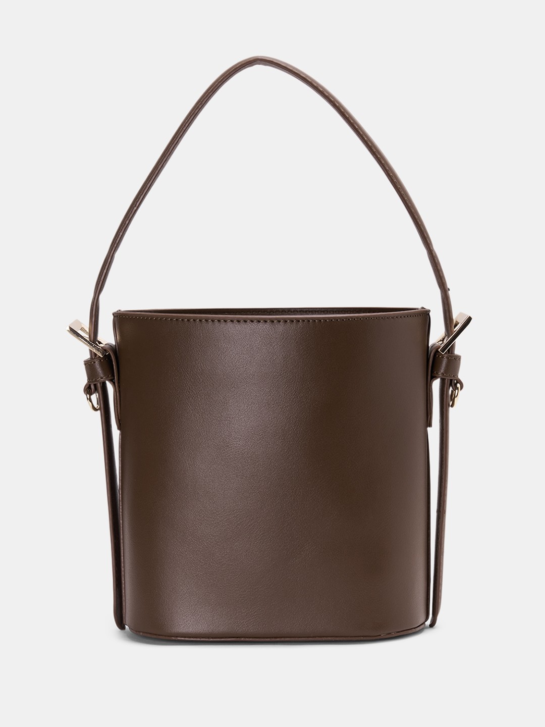 | Clean lines shaped into a modern bucket silhouette. It features a structured cylindrical body with a gathered drawstring closure, slim top handle, adjustable side strap attachments and gold-toned hardware detailing. Finished in smooth structured material with reinforced seams and neat edge piping. |