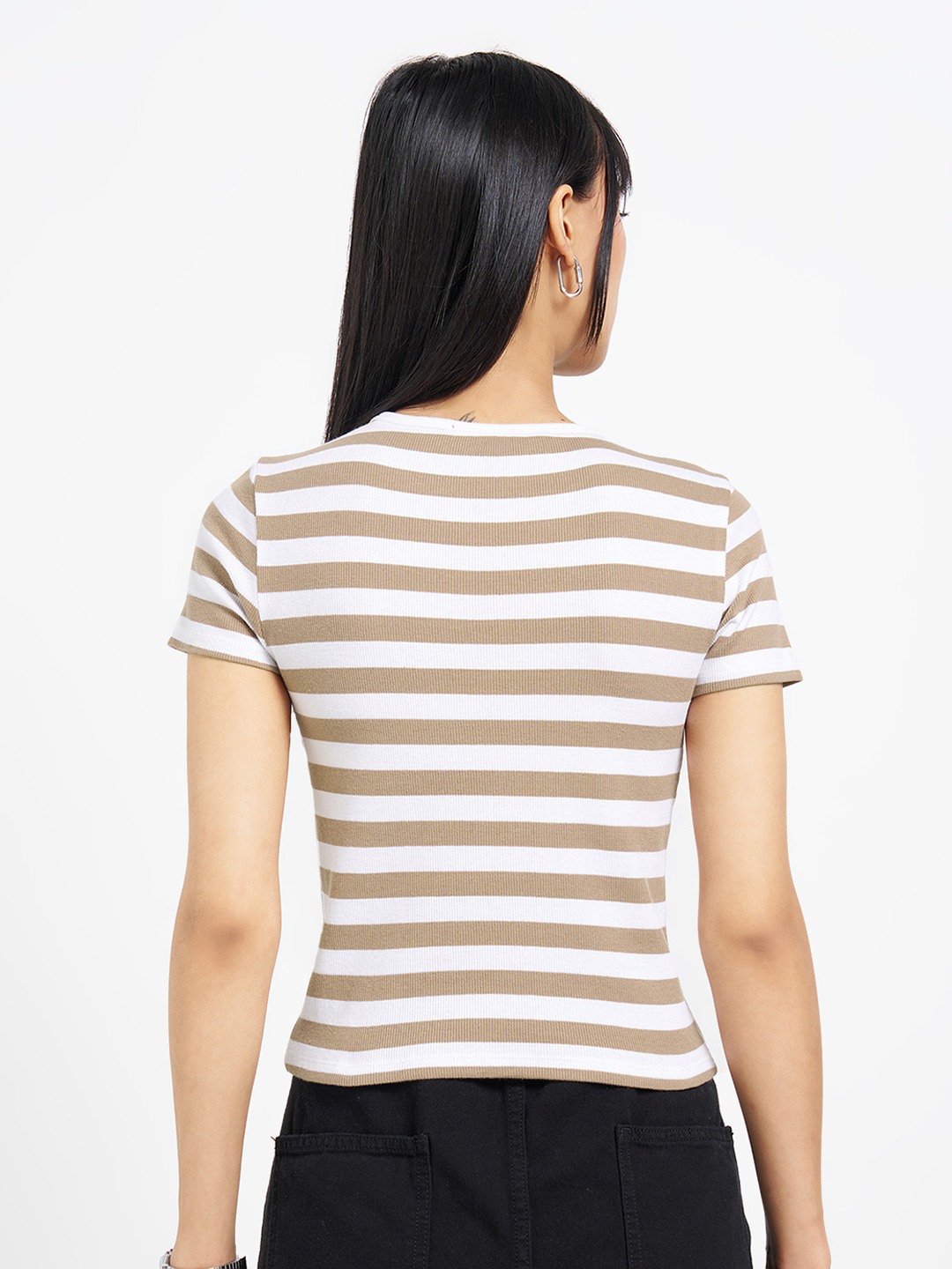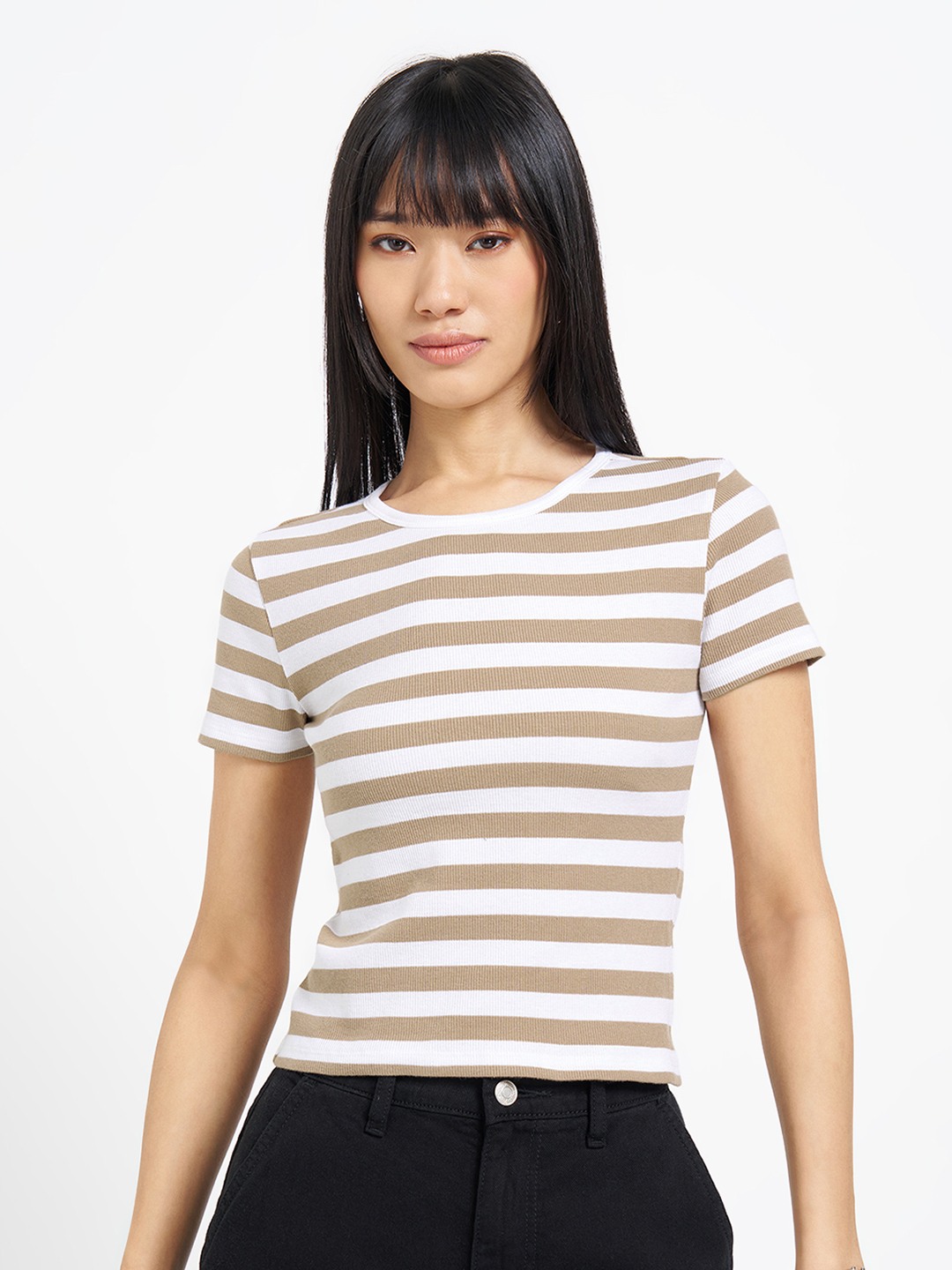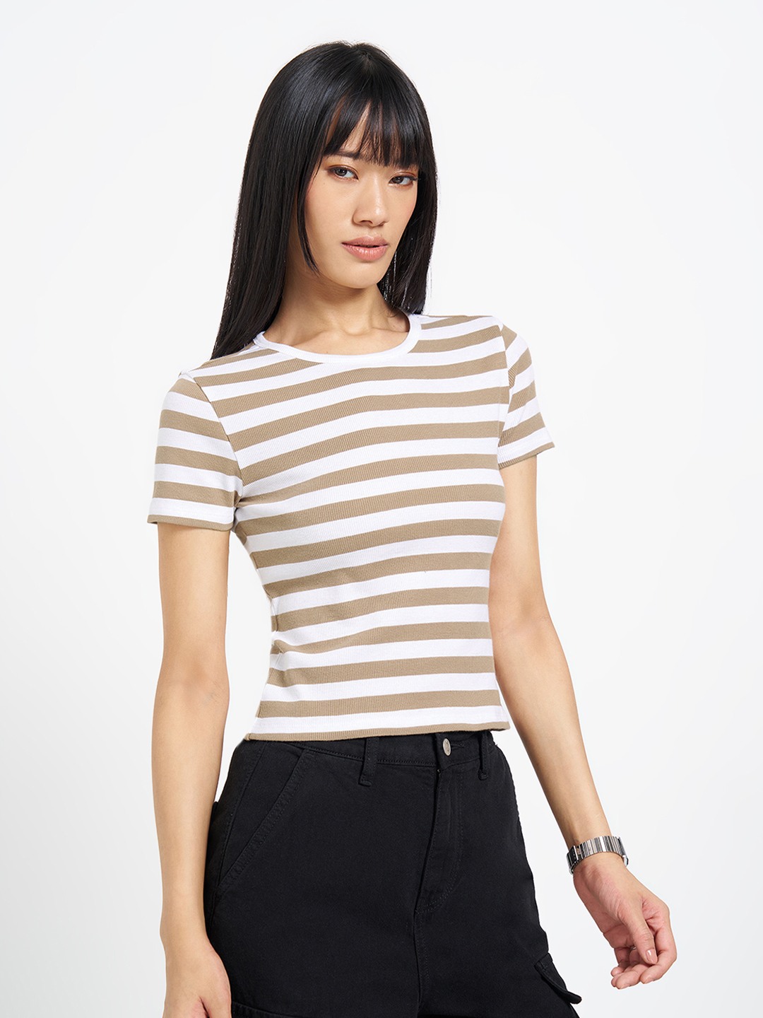 Clean lines with a close, body-skimming fit. Designed with a crew neckline and half sleeves, it features contrasting horizontal stripes and a cropped length. Soft stretch knit offers a smooth, breathable feel.