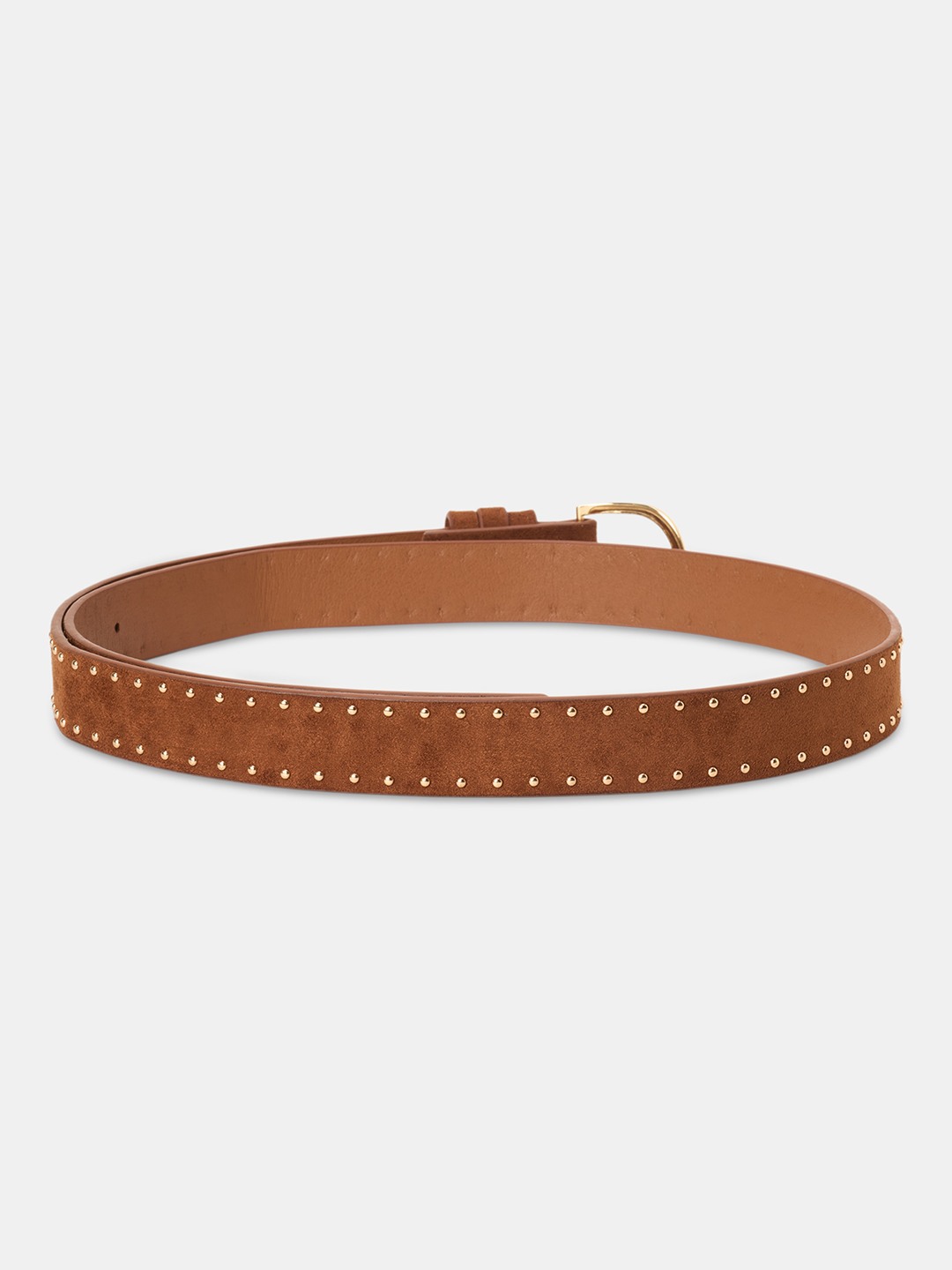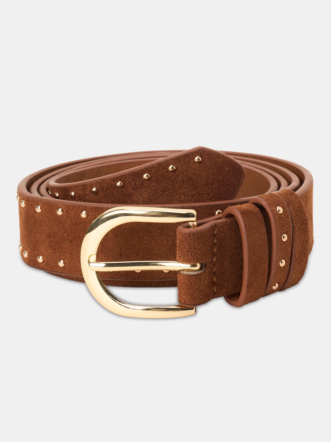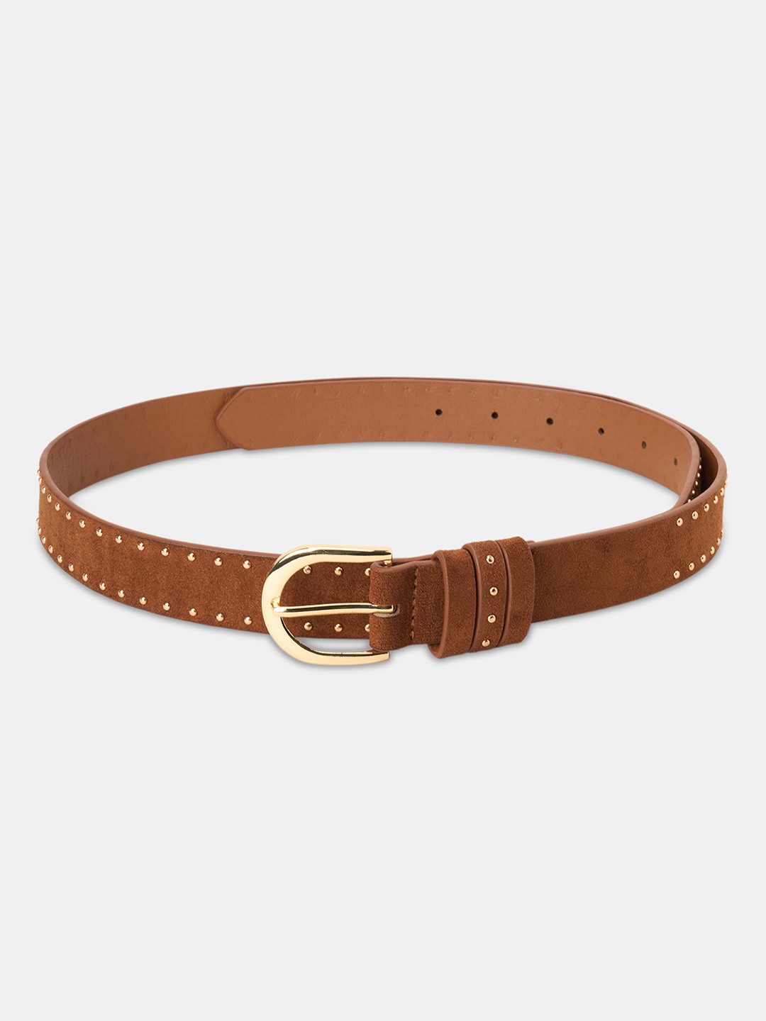 Textural depth and fine detailing define this elevated waist accessory. The brown strap features a brushed, suede-look surface accented with evenly placed gold-tone studs, paired with a classic rounded buckle for a balanced, fashion-forward finish. Constructed with a softly structured body and reinforced stitching, it offers durability while maintaining a refined, tactile feel.