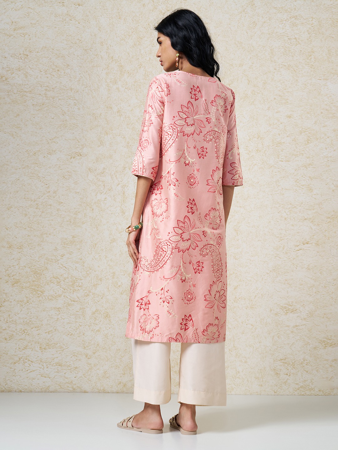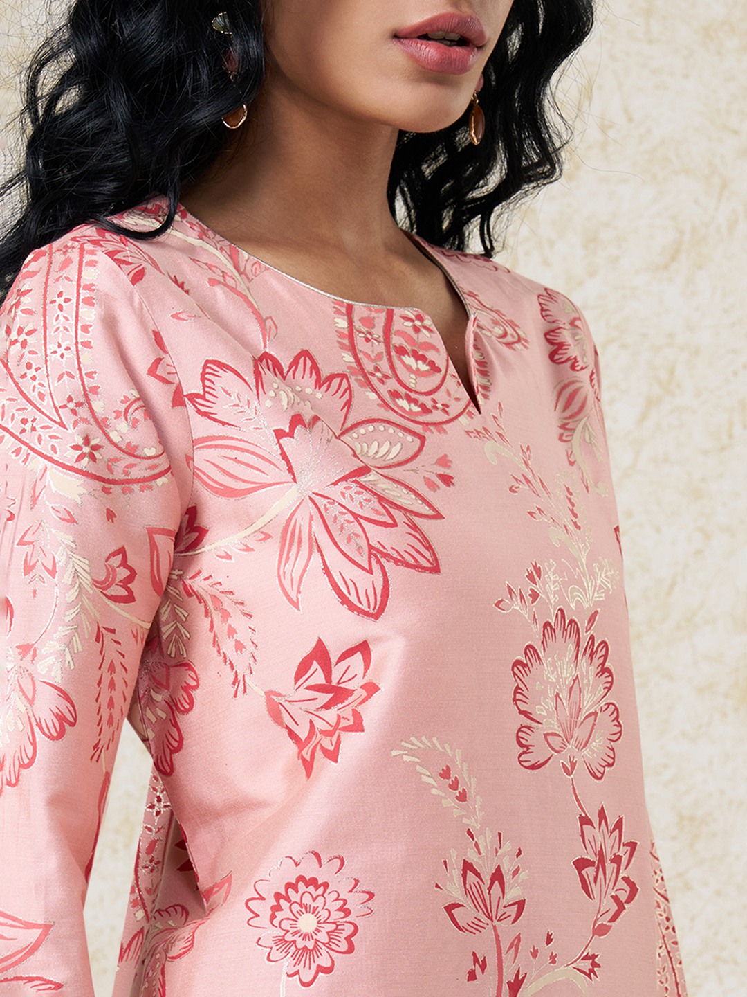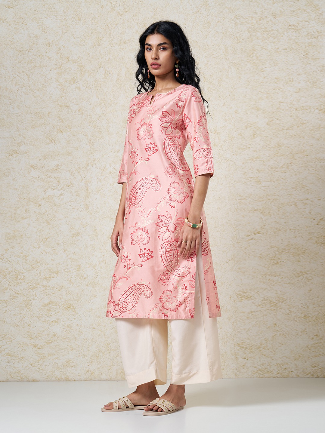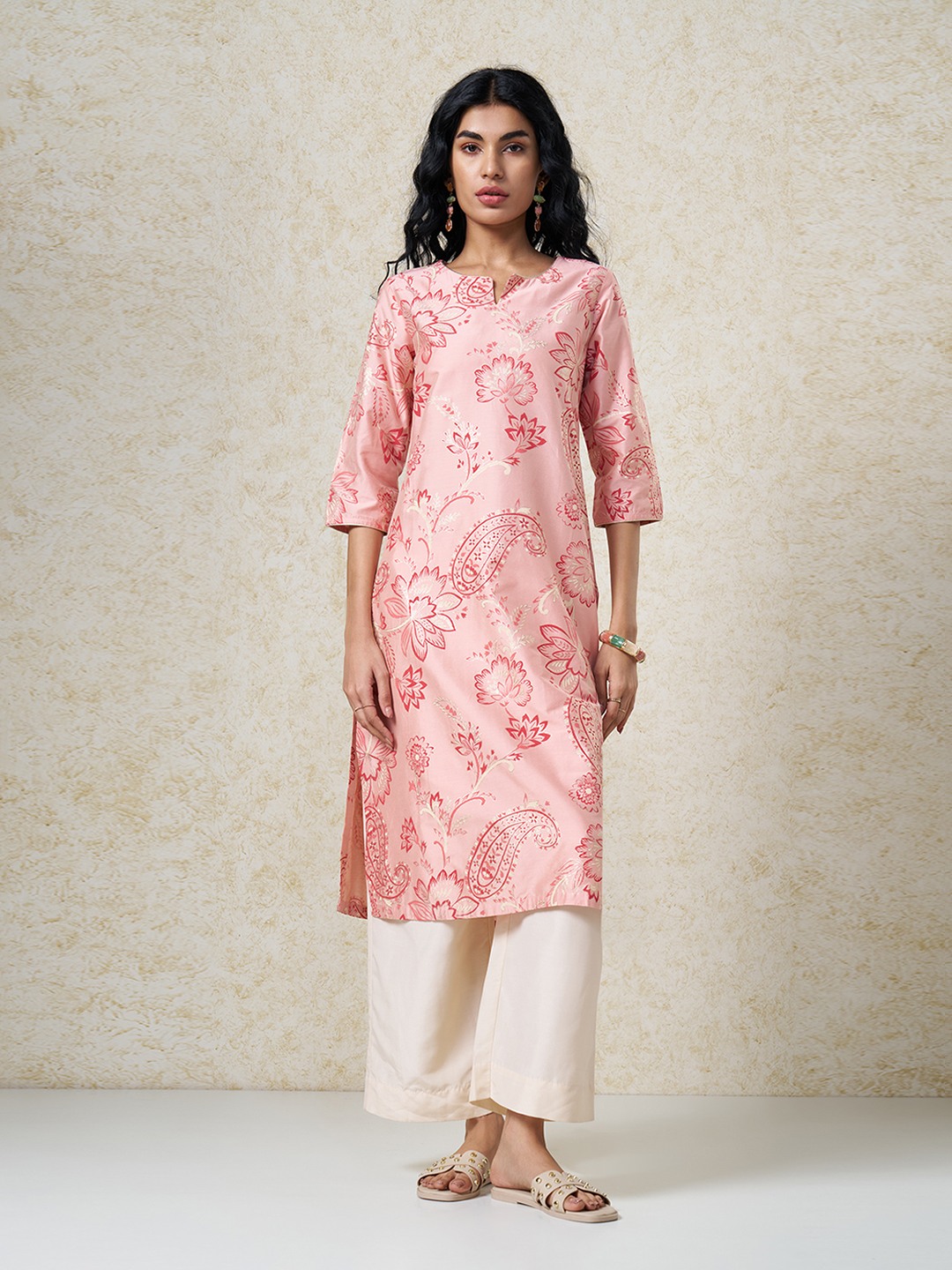 Effortless ease meets classic print storytelling in a festive silhouette. Designed with a notch neckline and 3/4 sleeves, featuring an all-over paisley and floral print across a fluid form with clean side slits. Lightweight woven construction offers a breathable hand feel with a smooth, relaxed drape.