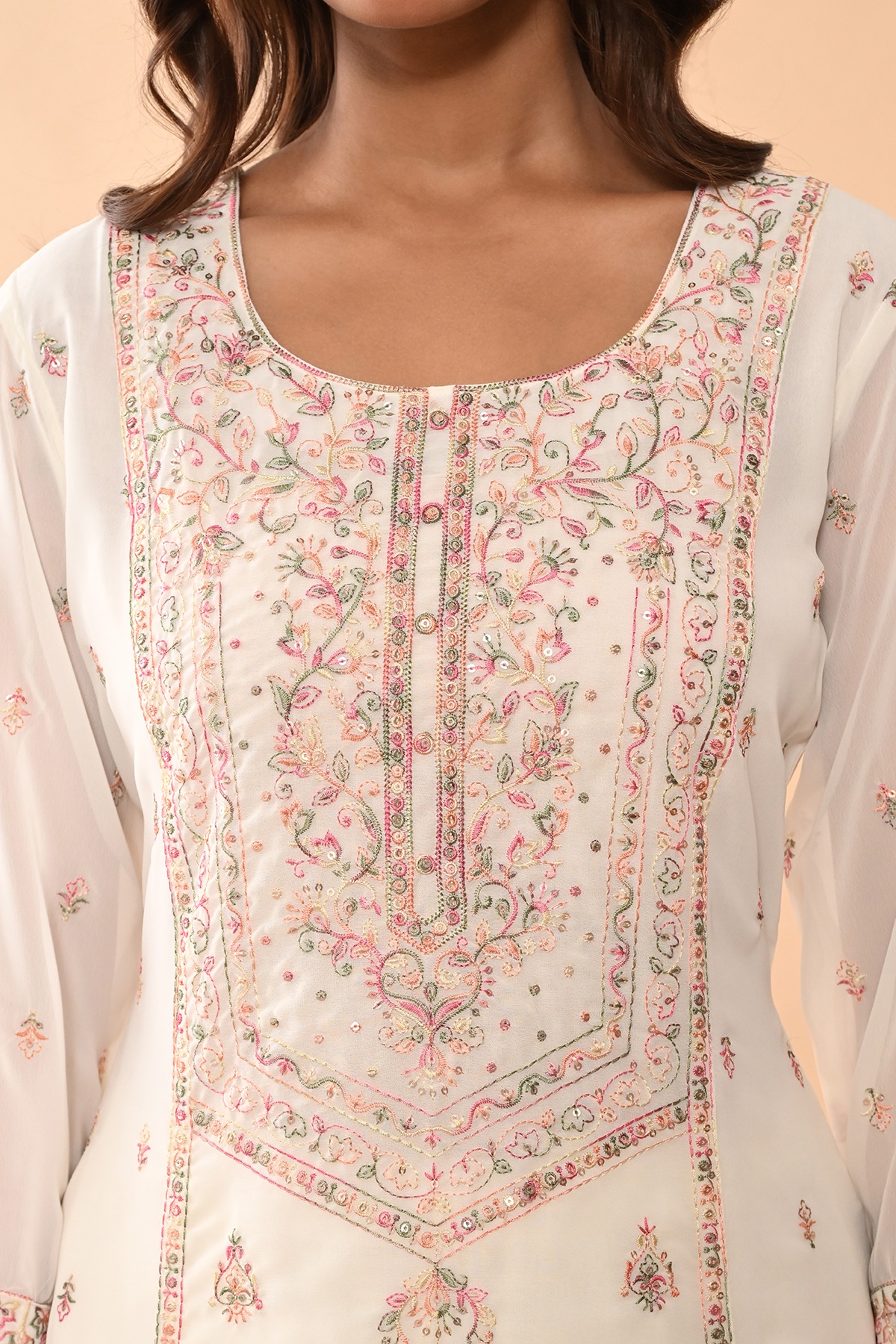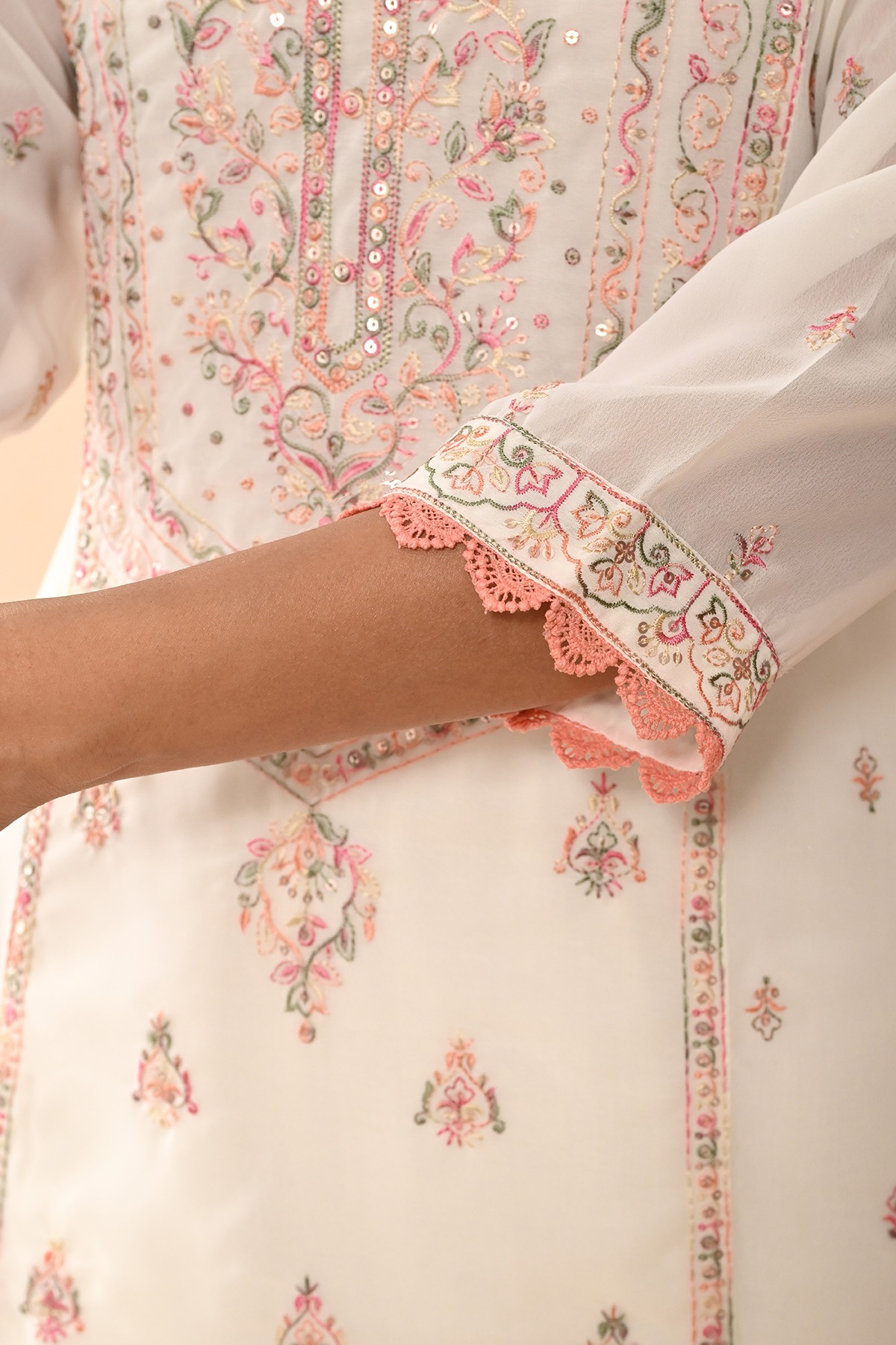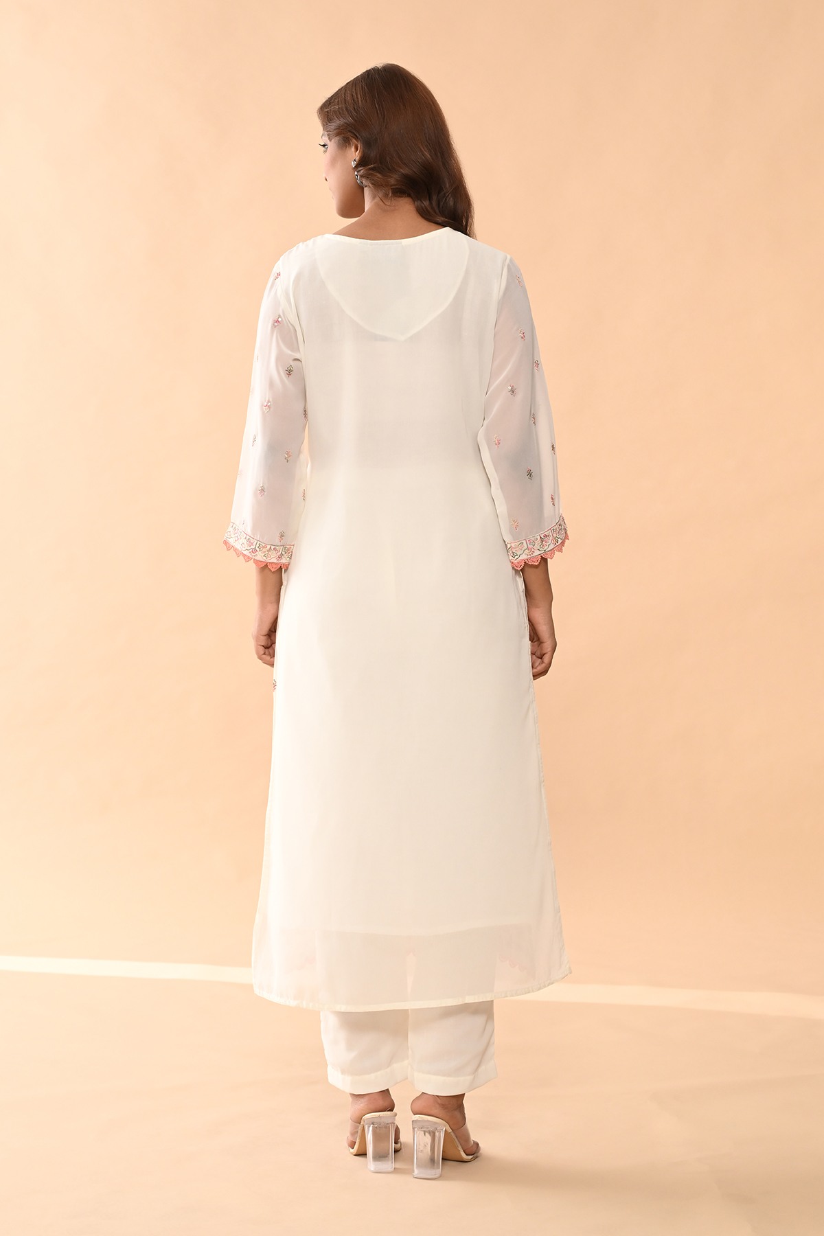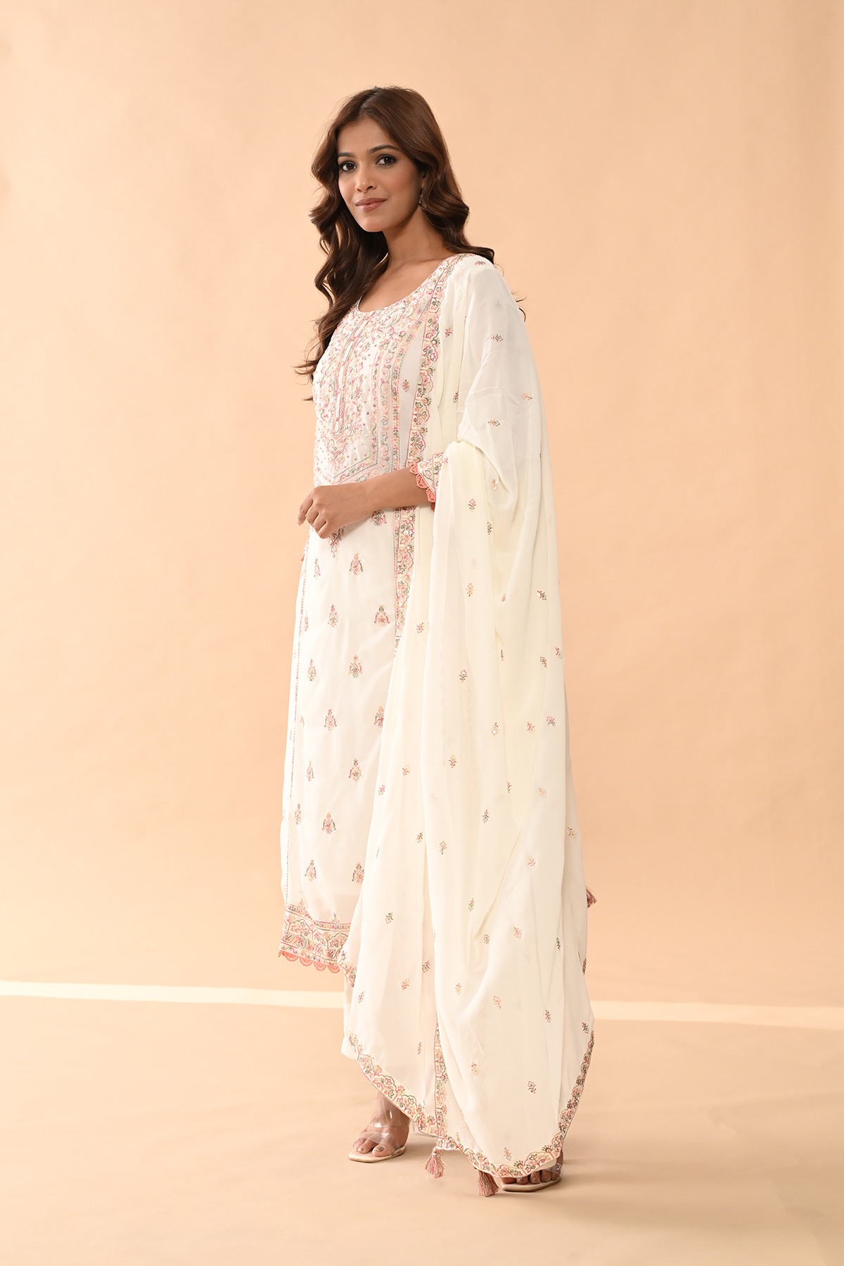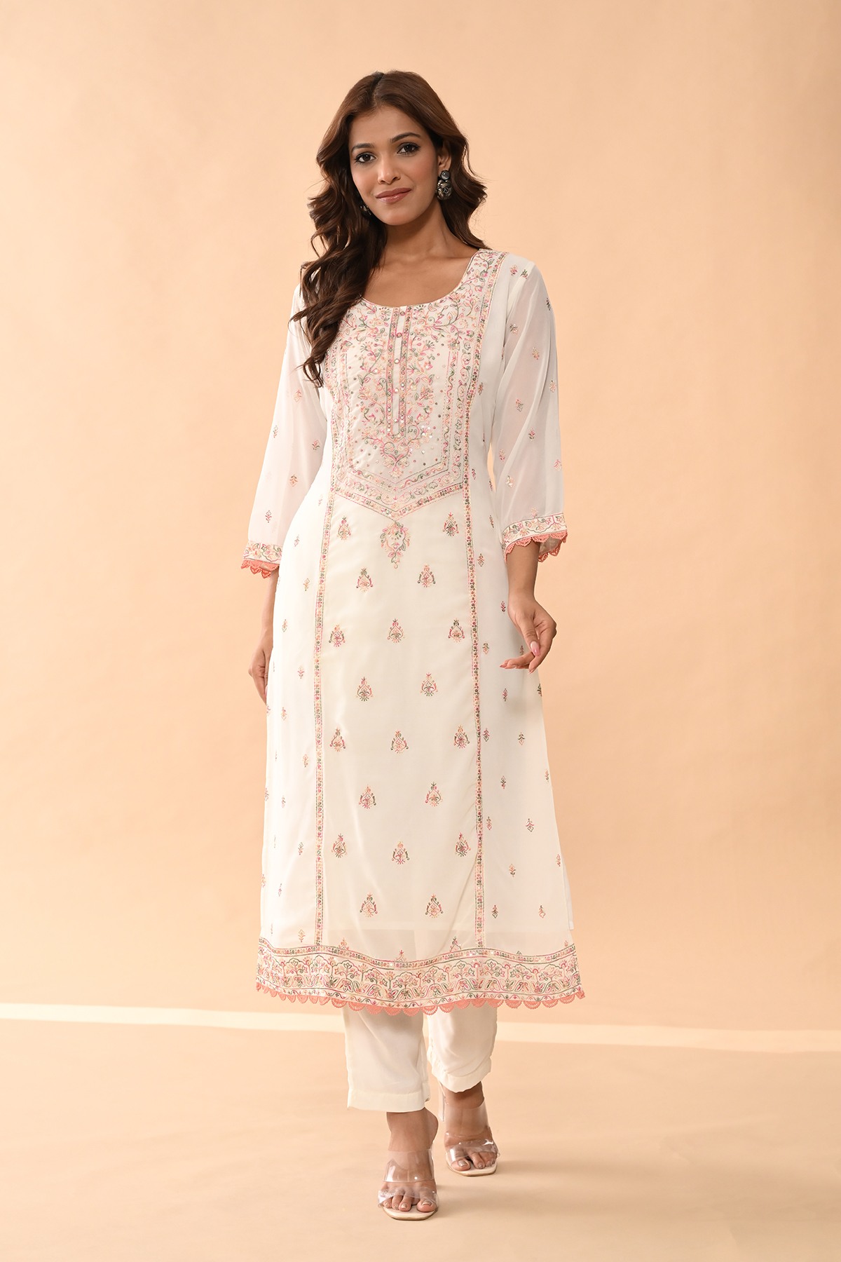 Cream embroidered kurta set featuring a chic round neckline, three-quarter sleeves, a straight hemline, and side slits. paired with matching pants and a dupatta, this timeless ensemble exudes elegance and sophistication, making it a perfect choice for both casual and semi-formal occasions.