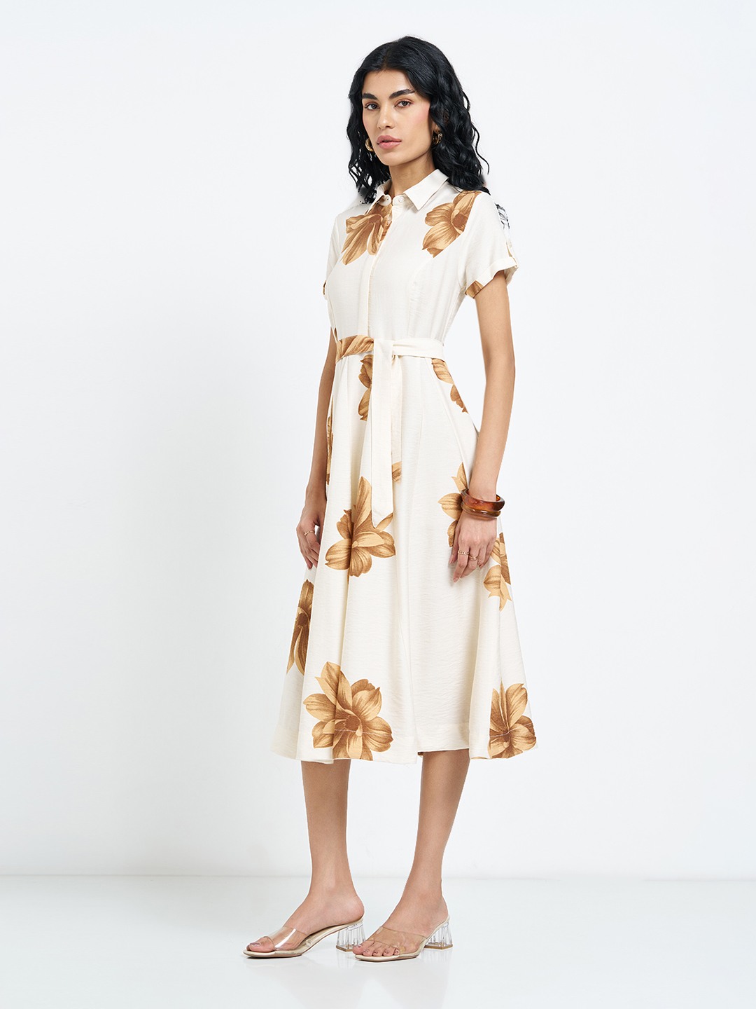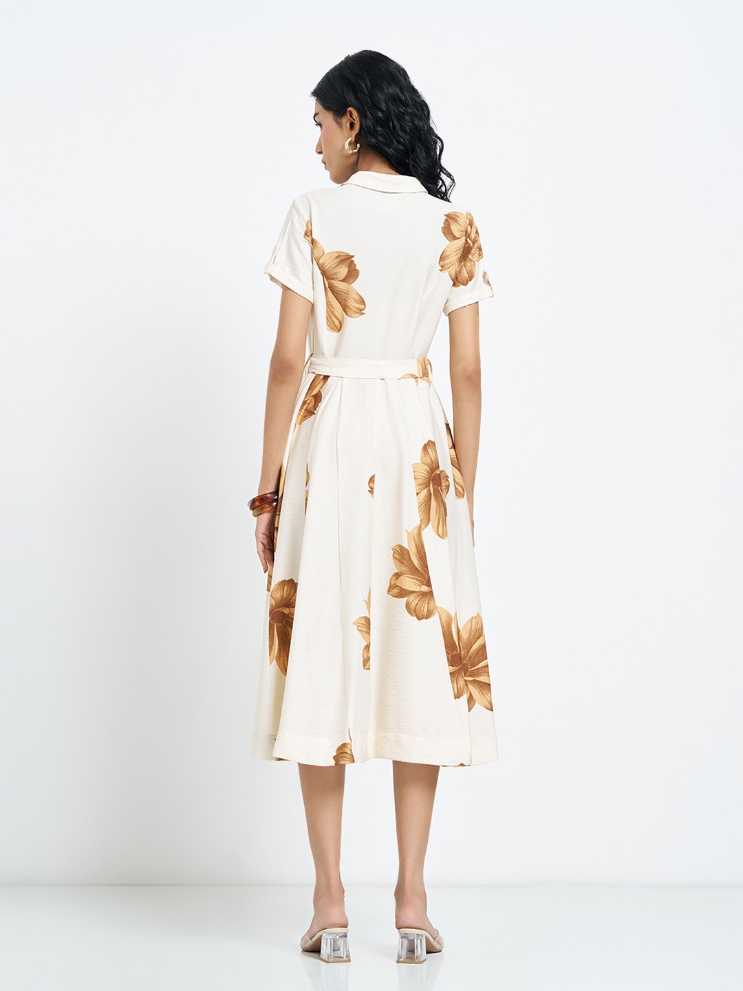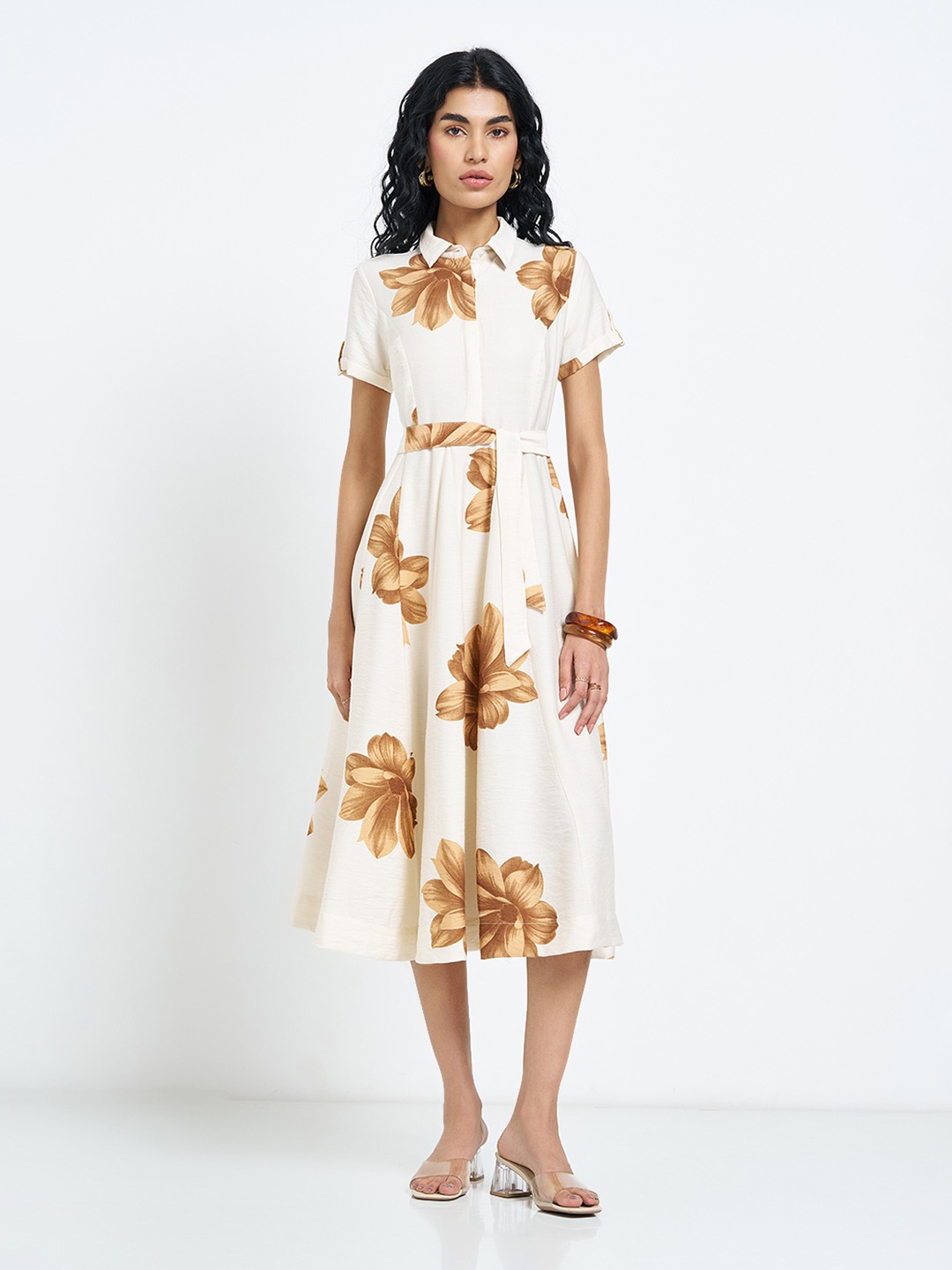 Elegant florals lend this piece a graceful daytime presence. Designed with a classic shirt collar and concealed front placket, it features short sleeves, a detachable waist tie and a softly flared midi silhouette accented with oversized floral prints. Lightweight woven construction keeps the drape airy and comfortable through the day.