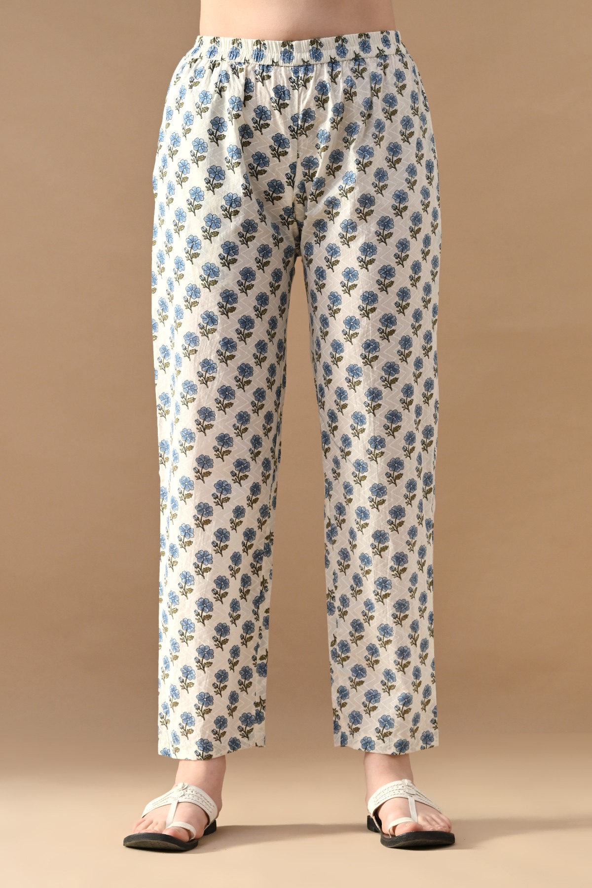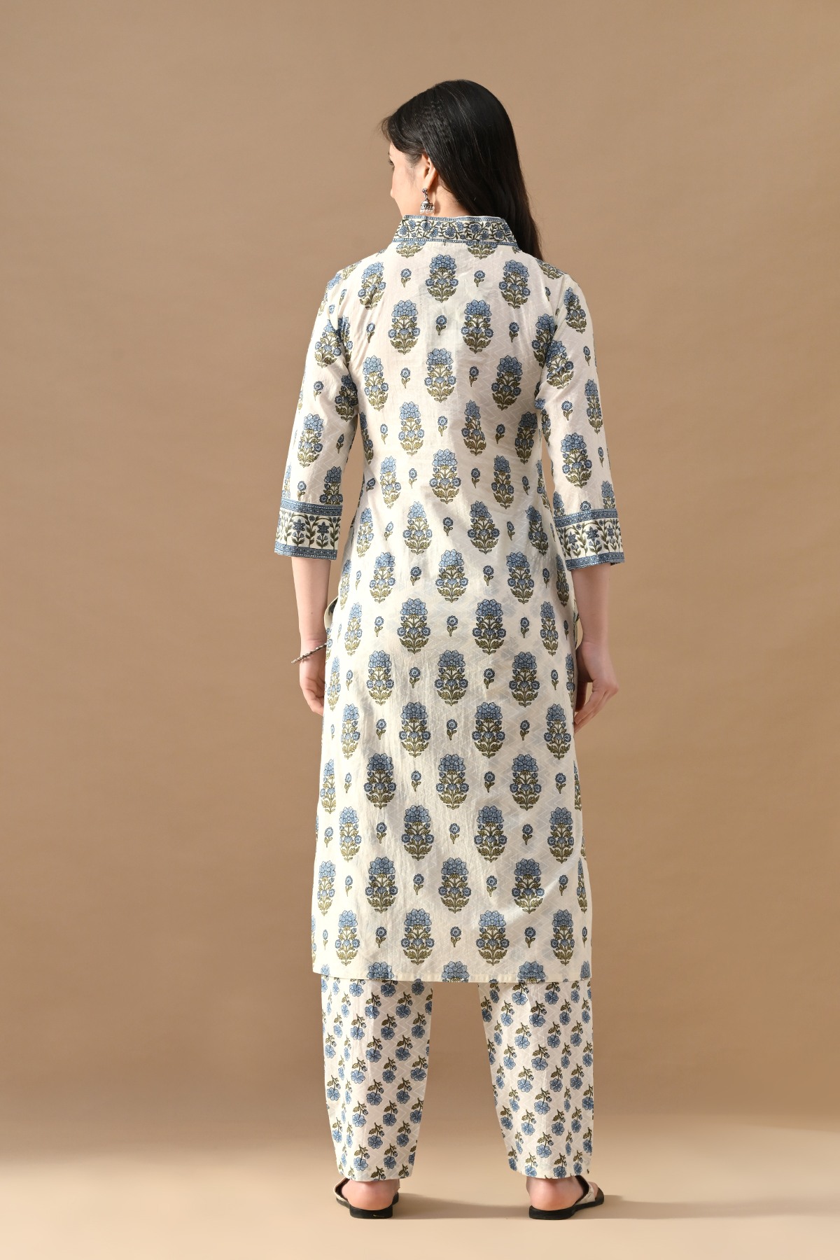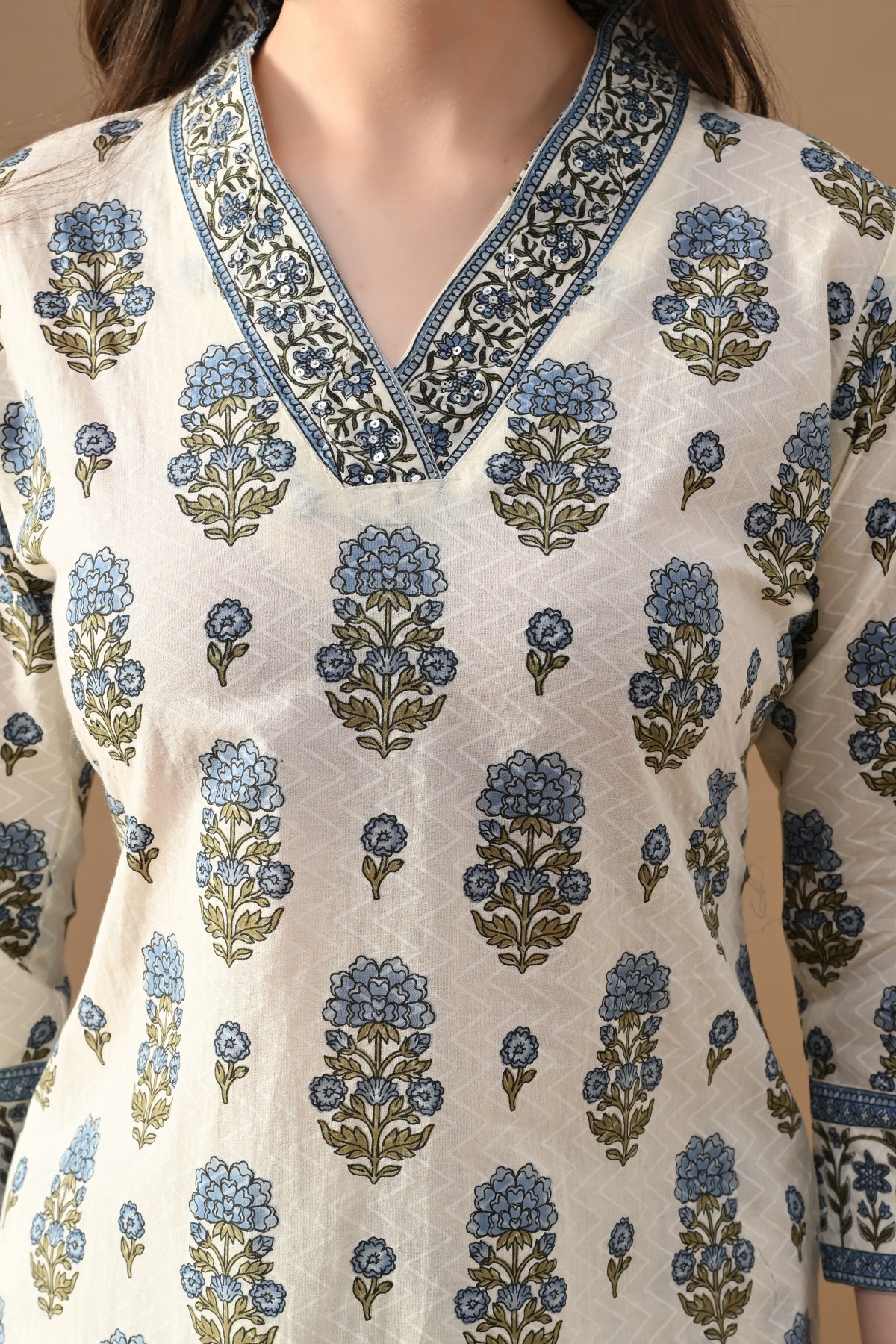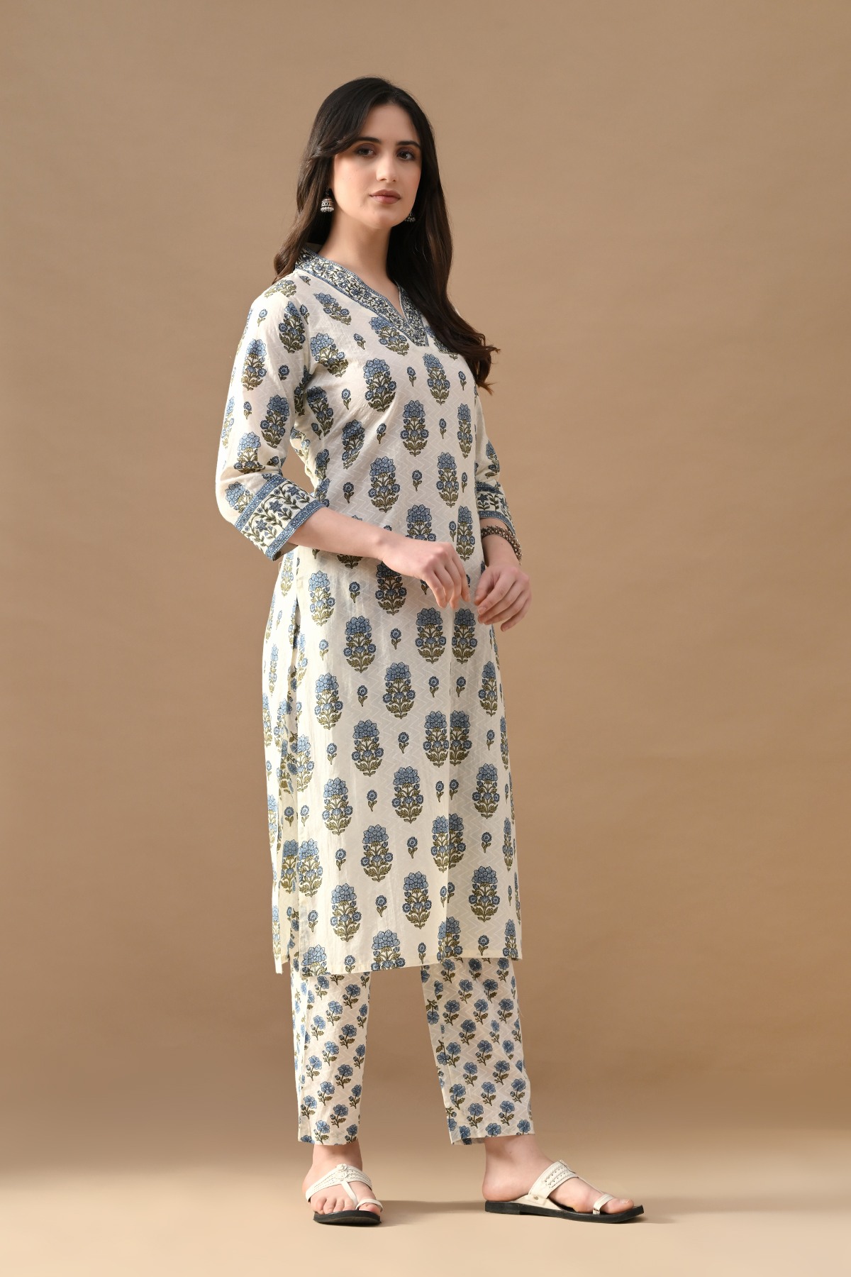 Cream floral printed straight kurta set, featuring v-neck, three-quarter sleeves, a straight hemline, and side slits. it pairs perfectly with matching pants which have a functional pocket. for a chic, sophisticated look, ideal for any occasion or causal wear.