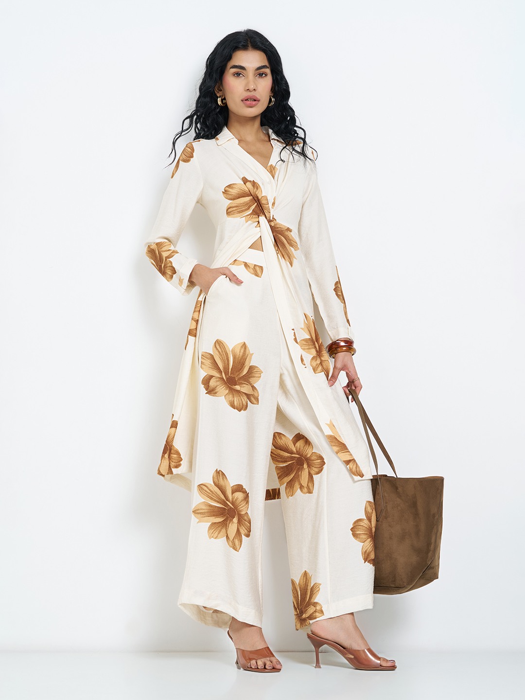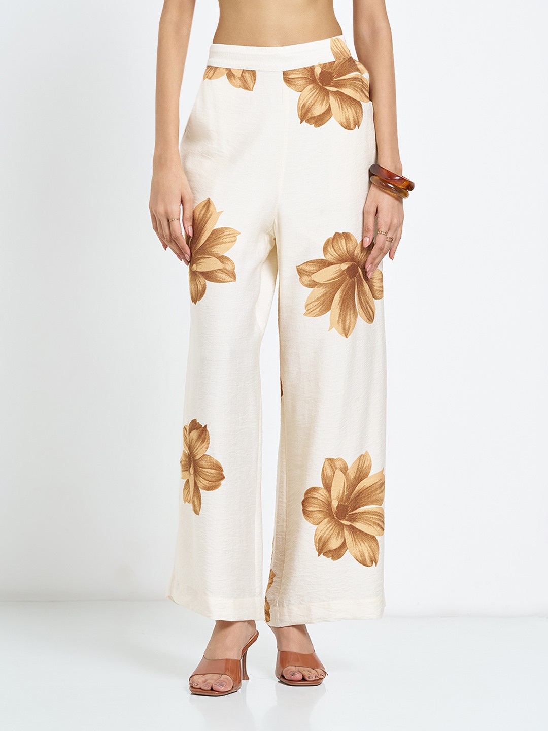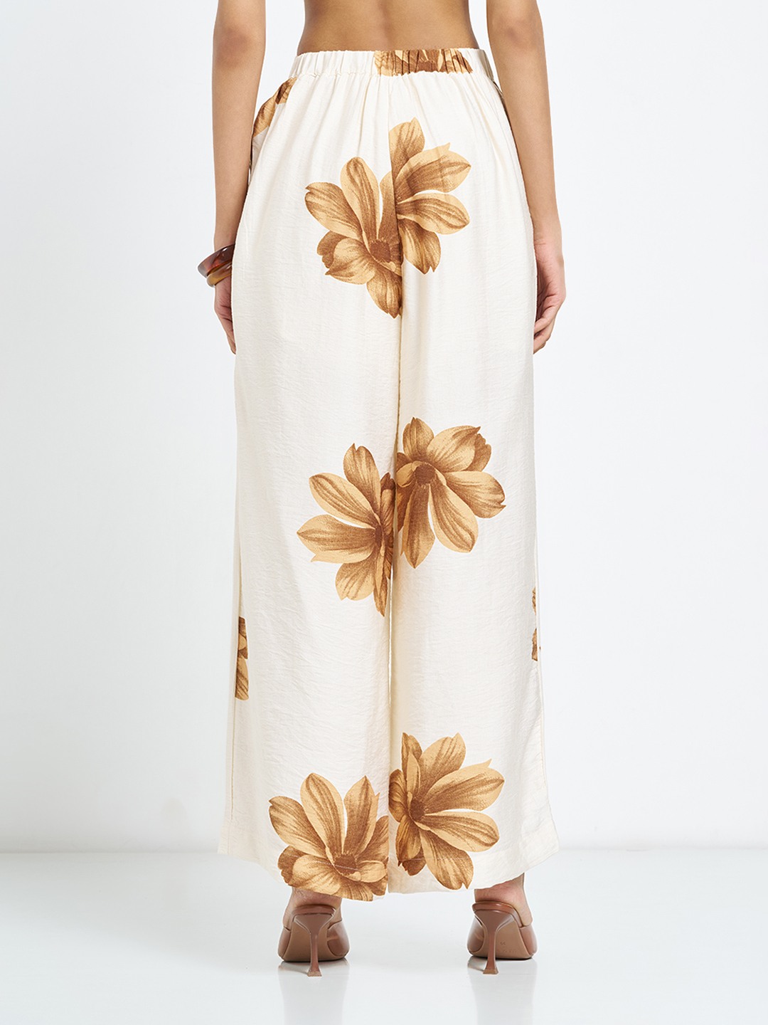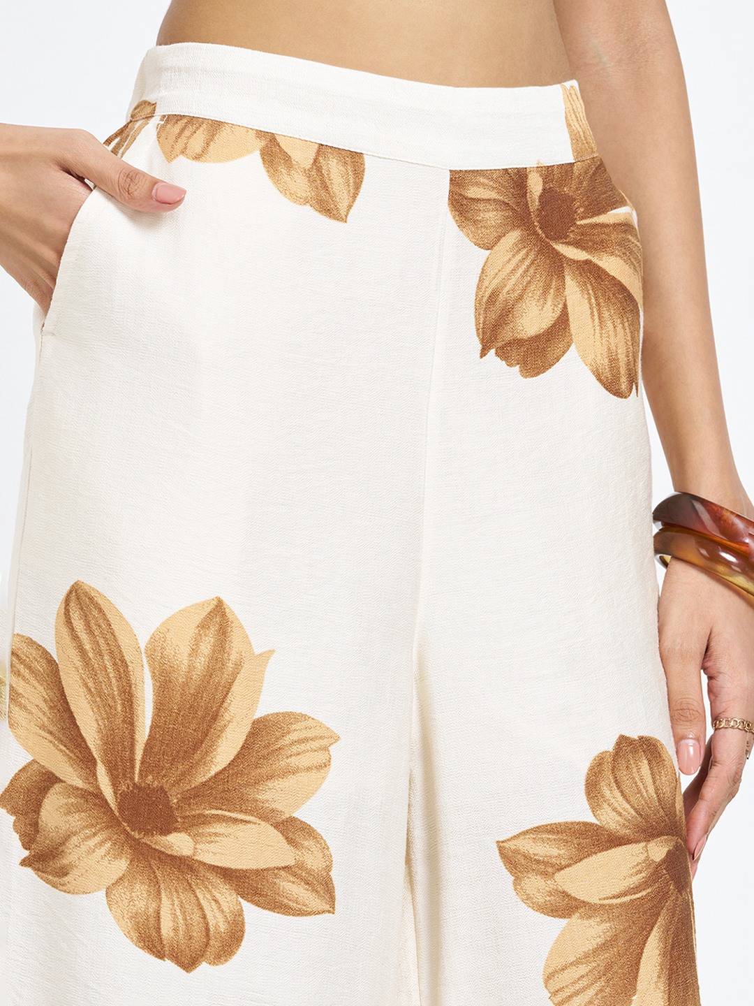 Monochrome florals lend this pair a bold yet refined presence. Designed with an elasticated waistband, it features a clean front pleats, functional side pockets and a flowing wide leg silhouette. Lightweight woven construction keeps the drape fluid and comfortable through the day.