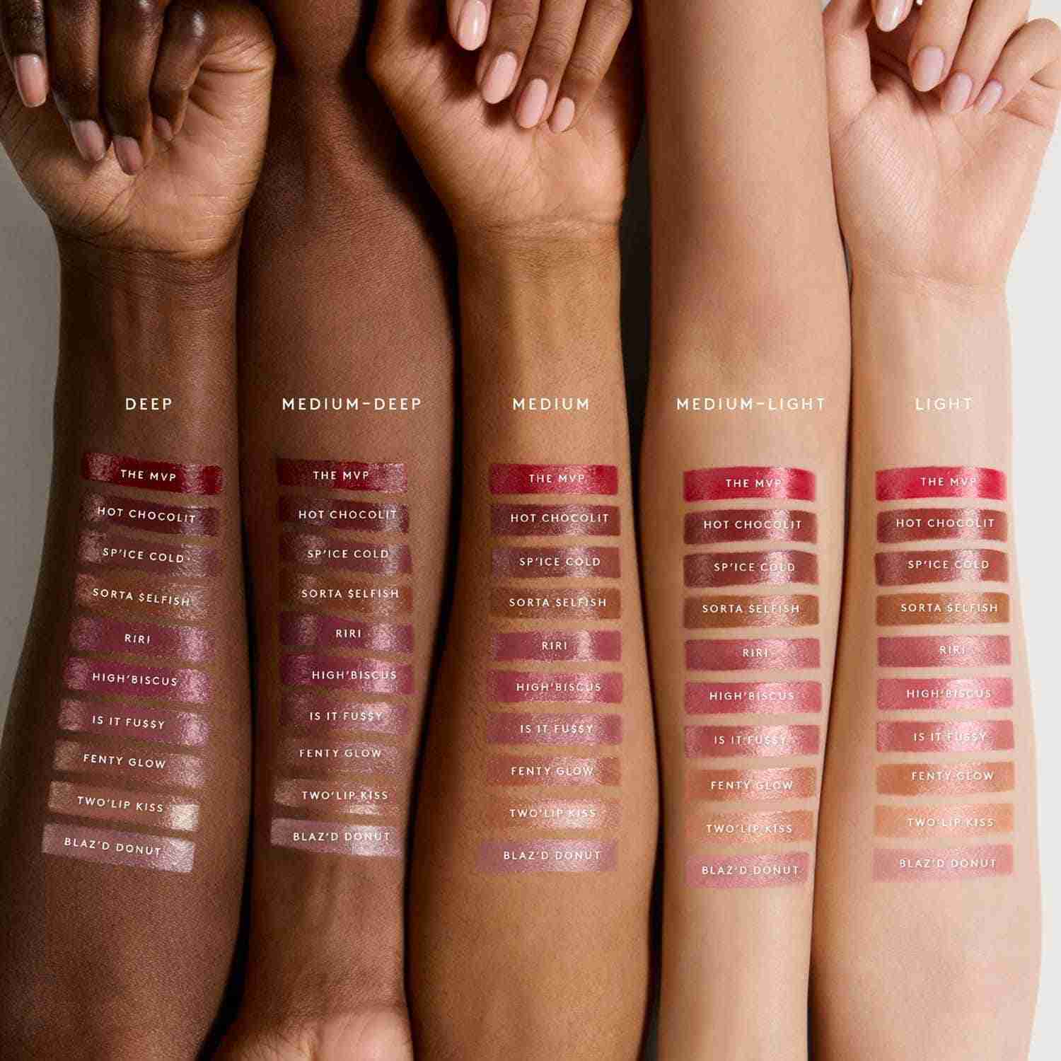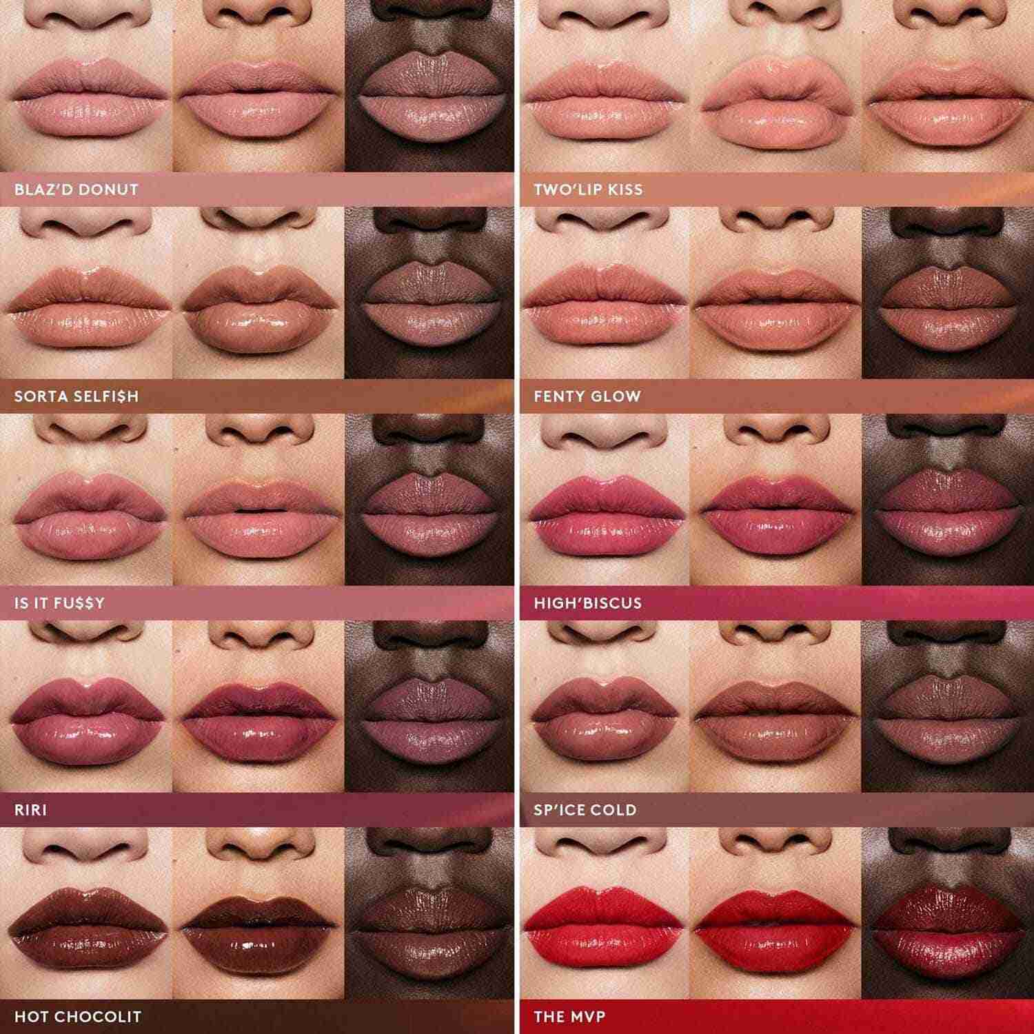 Blaz'D Donut: Ingredients: Bis-Diglyceryl Polyacyladipate-2, Diisostearyl Malate, Hydrogenated Polyisobutene, Squalane, Bis-Behenyl/Isostearyl/Phytosteryl Dimer Dilinoleyl Dimer Dilinoleate, Polybutene, Cera Alba/Beeswax/Cire D'Abeille, Synthetic Wax, Butyrospermum Parkii (Shea) Butter, Polyglyceryl-2 Triisostearate, Aroma/Flavor, Parfum/Fragrance, Caprylyl Glycol, Triethoxycaprylylsilane, Aluminum Hydroxide, Polyhydroxystearic Acid, Tocopherol, Helianthus Annuus (Sunflower) Seed Oil, Actinidia Chinensis (Kiwi) Seed Oil, Benzyl Benzoate, Limonene. May Contain/Peut Contenir (+/-): Titanium Dioxide (Ci 77891), Iron Oxides (Ci 77491, Ci 77492, Ci 77499), Red 6 Lake (Ci 15850), Red 7 Lake (Ci 15850). Two'Lip Kiss: Ingredients: Bis-Diglyceryl Polyacyladipate-2, Diisostearyl Malate, Hydrogenated Polyisobutene, Squalane, Bis-Behenyl/Isostearyl/Phytosteryl Dimer Dilinoleyl Dimer Dilinoleate, Polybutene, Cera Alba/Beeswax/Cire D'Abeille, Synthetic Wax, Butyrospermum Parkii (Shea) Butter, Polyglyceryl-2 Triisostearate, Aroma/Flavor, Parfum/Fragrance, Caprylyl Glycol, Triethoxycaprylylsilane, Aluminum Hydroxide, Polyhydroxystearic Acid, Tocopherol, Helianthus Annuus (Sunflower) Seed Oil, Actinidia Chinensis (Kiwi) Seed Oil, Benzyl Benzoate, Limonene. May Contain/Peut Contenir (+/-): Titanium Dioxide (Ci 77891), Iron Oxides (Ci 77491, Ci 77492, Ci 77499), Red 6 Lake (Ci 15850), Red 7 Lake (Ci 15850). Fenty Glow: Ingredients: Bis-Diglyceryl Polyacyladipate-2, Diisostearyl Malate, Hydrogenated Polyisobutene, Squalane, Bis-Behenyl/Isostearyl/Phytosteryl Dimer Dilinoleyl Dimer Dilinoleate, Polybutene, Cera Alba/Beeswax/Cire D'Abeille, Synthetic Wax, Butyrospermum Parkii (Shea) Butter, Polyglyceryl-2 Triisostearate, Aroma/Flavor, Parfum/Fragrance, Caprylyl Glycol, Triethoxycaprylylsilane, Aluminum Hydroxide, Polyhydroxystearic Acid, Tocopherol, Helianthus Annuus (Sunflower) Seed Oil, Actinidia Chinensis (Kiwi) Seed Oil, Benzyl Benzoate, Limonene. May Contain/Peut Contenir (+/-): Titanium Dioxide (Ci 77891), Iron Oxides (Ci 77491, Ci 77492, Ci 77499), Red 6 Lake (Ci 15850), Red 7 Lake (Ci 15850). Is It Fussy: Ingredients: Bis-Diglyceryl Polyacyladipate-2, Diisostearyl Malate, Hydrogenated Polyisobutene, Squalane, Bis-Behenyl/Isostearyl/Phytosteryl Dimer Dilinoleyl Dimer Dilinoleate, Polybutene, Cera Alba/Beeswax/Cire D'Abeille, Synthetic Wax, Butyrospermum Parkii (Shea) Butter, Polyglyceryl-2 Triisostearate, Aroma/Flavor, Parfum/Fragrance, Caprylyl Glycol, Triethoxycaprylylsilane, Aluminum Hydroxide, Polyhydroxystearic Acid, Tocopherol, Helianthus Annuus (Sunflower) Seed Oil, Actinidia Chinensis (Kiwi) Seed Oil, Benzyl Benzoate, Limonene. May Contain/Peut Contenir (+/-): Titanium Dioxide (Ci 77891), Iron Oxides (Ci 77491, Ci 77492, Ci 77499), Red 6 Lake (Ci 15850), Red 7 Lake (Ci 15850). High'Biscus: Ingredients: Bis-Diglyceryl Polyacyladipate-2, Diisostearyl Malate, Hydrogenated Polyisobutene, Squalane, Bis-Behenyl/Isostearyl/Phytosteryl Dimer Dilinoleyl Dimer Dilinoleate, Polybutene, Cera Alba/Beeswax/Cire D'Abeille, Synthetic Wax, Butyrospermum Parkii (Shea) Butter, Polyglyceryl-2 Triisostearate, Aroma/Flavor, Parfum/Fragrance, Caprylyl Glycol, Triethoxycaprylylsilane, Aluminum Hydroxide, Polyhydroxystearic Acid, Tocopherol, Helianthus Annuus (Sunflower) Seed Oil, Actinidia Chinensis (Kiwi) Seed Oil, Benzyl Benzoate, Limonene. May Contain/Peut Contenir (+/-): Titanium Dioxide (Ci 77891), Iron Oxides (Ci 77491, Ci 77492, Ci 77499), Red 6 Lake (Ci 15850), Red 7 Lake (Ci 15850). Riri: Ingredients: Bis-Diglyceryl Polyacyladipate-2, Diisostearyl Malate, Hydrogenated Polyisobutene, Squalane, Bis-Behenyl/Isostearyl/Phytosteryl Dimer Dilinoleyl Dimer Dilinoleate, Polybutene, Cera Alba/Beeswax/Cire D'Abeille, Synthetic Wax, Butyrospermum Parkii (Shea) Butter, Polyglyceryl-2 Triisostearate, Aroma/Flavor, Parfum/Fragrance, Caprylyl Glycol, Triethoxycaprylylsilane, Aluminum Hydroxide, Polyhydroxystearic Acid, Tocopherol, Helianthus Annuus (Sunflower) Seed Oil, Actinidia Chinensis (Kiwi) Seed Oil, Benzyl Benzoate, Limonene. May Contain/Peut Contenir (+/-): Titanium Dioxide (Ci 77891), Iron Oxides (Ci 77491, Ci 77492, Ci 77499), Red 6 Lake (Ci 15850), Red 7 Lake (Ci 15850). Sorta $Elfish: Ingredients: Bis-Diglyceryl Polyacyladipate-2, Diisostearyl Malate, Hydrogenated Polyisobutene, Squalane, Bis-Behenyl/Isostearyl/Phytosteryl Dimer Dilinoleyl Dimer Dilinoleate, Polybutene, Cera Alba/Beeswax/Cire D'Abeille, Synthetic Wax, Butyrospermum Parkii (Shea) Butter, Polyglyceryl-2 Triisostearate, Aroma/Flavor, Parfum/Fragrance, Caprylyl Glycol, Triethoxycaprylylsilane, Aluminum Hydroxide, Polyhydroxystearic Acid, Tocopherol, Helianthus Annuus (Sunflower) Seed Oil, Actinidia Chinensis (Kiwi) Seed Oil, Benzyl Benzoate, Limonene. May Contain/Peut Contenir (+/-): Titanium Dioxide (Ci 77891), Iron Oxides (Ci 77491, Ci 77492, Ci 77499), Red 6 Lake (Ci 15850), Red 7 Lake (Ci 15850). Sp'Ice Cold: Ingredients: Bis-Diglyceryl Polyacyladipate-2, Diisostearyl Malate, Hydrogenated Polyisobutene, Squalane, Bis-Behenyl/Isostearyl/Phytosteryl Dimer Dilinoleyl Dimer Dilinoleate, Polybutene, Cera Alba/Beeswax/Cire D'Abeille, Synthetic Wax, Butyrospermum Parkii (Shea) Butter, Polyglyceryl-2 Triisostearate, Aroma/Flavor, Parfum/Fragrance, Caprylyl Glycol, Triethoxycaprylylsilane, Aluminum Hydroxide, Polyhydroxystearic Acid, Tocopherol, Helianthus Annuus (Sunflower) Seed Oil, Actinidia Chinensis (Kiwi) Seed Oil, Benzyl Benzoate, Limonene. May Contain/Peut Contenir (+/-): Titanium Dioxide (Ci 77891), Iron Oxides (Ci 77491, Ci 77492, Ci 77499), Red 6 Lake (Ci 15850), Red 7 Lake (Ci 15850). Hot Chocolit: Ingredients: Bis-Diglyceryl Polyacyladipate-2, Diisostearyl Malate, Hydrogenated Polyisobutene, Squalane, Bis-Behenyl/Isostearyl/Phytosteryl Dimer Dilinoleyl Dimer Dilinoleate, Polybutene, Cera Alba/Beeswax/Cire D'Abeille, Synthetic Wax, Polyglyceryl-2 Triisostearate, Butyrospermum Parkii (Shea) Butter, Aroma/Flavor, Parfum/Fragrance, Caprylyl Glyc