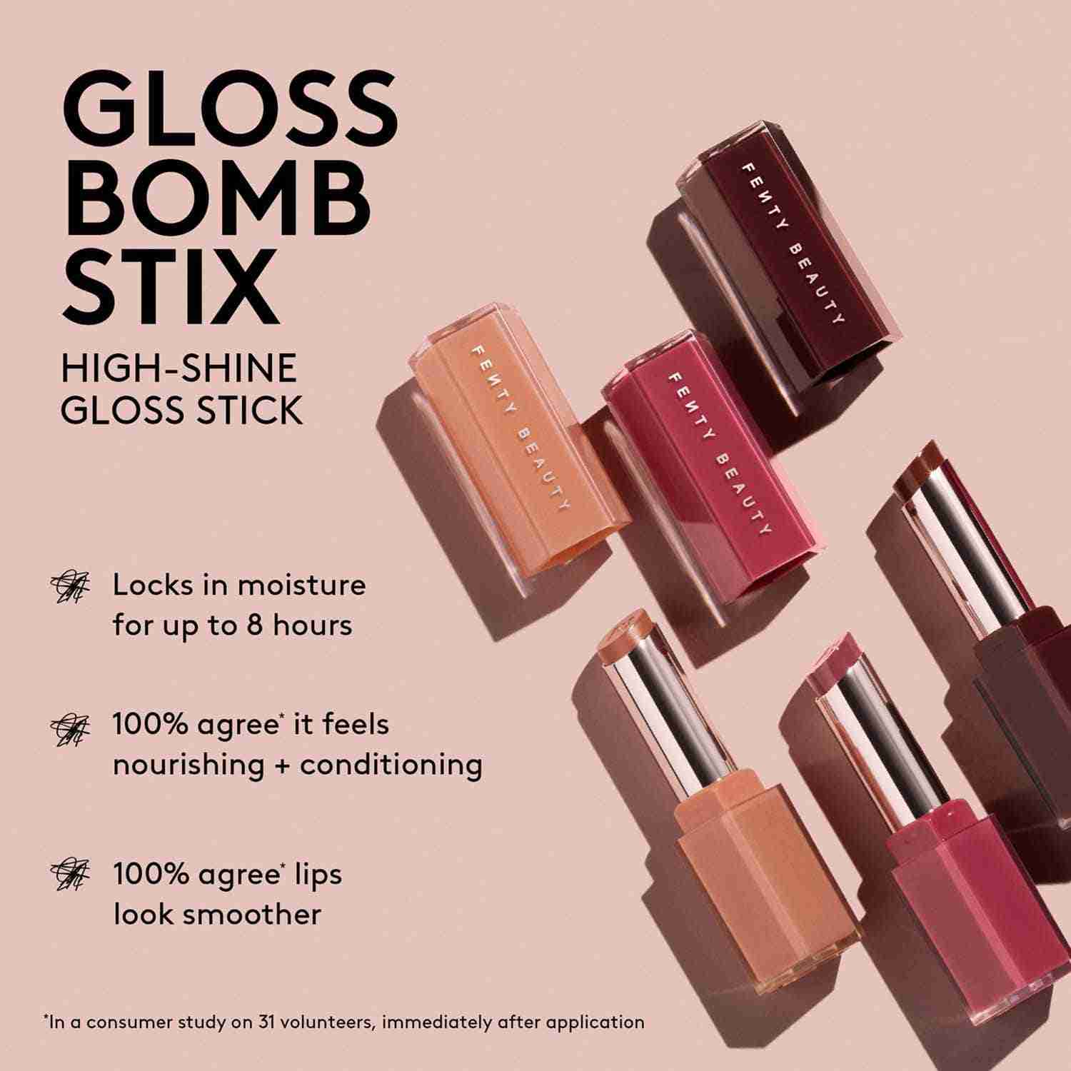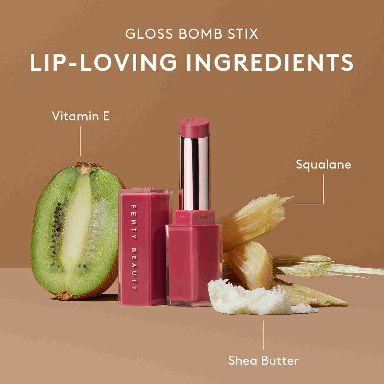 Achieve a mirror-like shine with the FENTY BEAUTY Gloss Bomb Stix High-Shine Gloss Stick - High'Biscus (3.6 g). This moisture-rich gloss stick glides on smoothly, delivering medium pigment with a luscious, glossy finish. Infused with vitamin E, shea butter, and squalane, the FENTY BEAUTY lip color stick keeps lips soft, nourished, and visibly plump. Also, this non-sticky lipstick hydrates for up to 8 hours, locking in comfort and color all day.