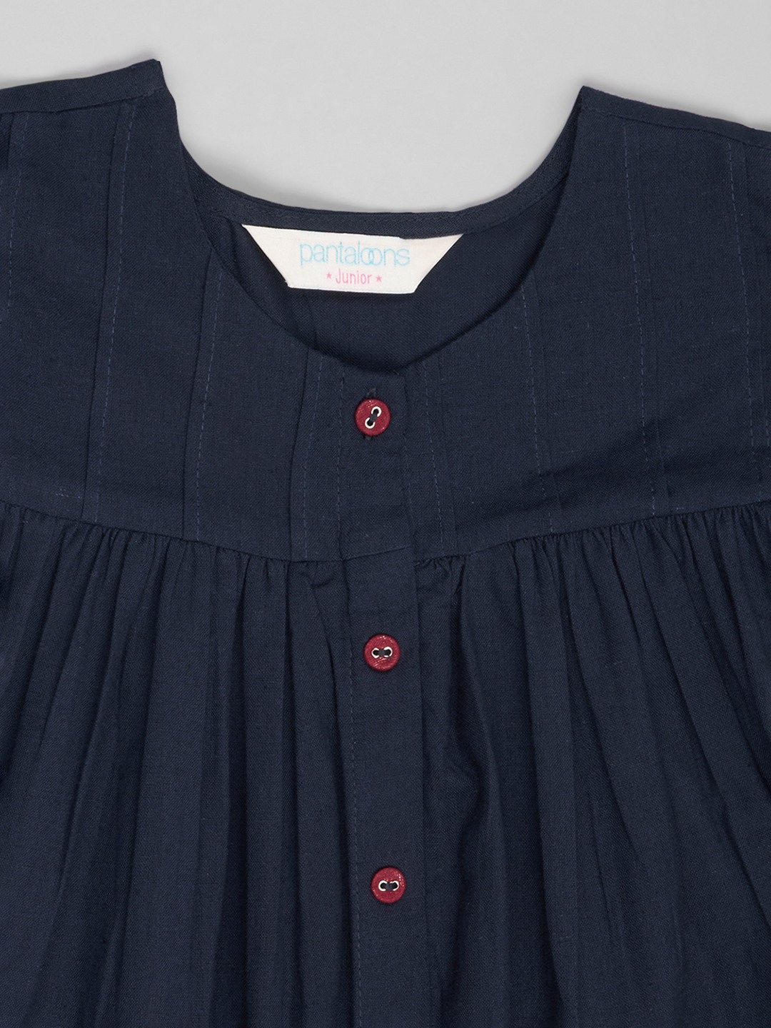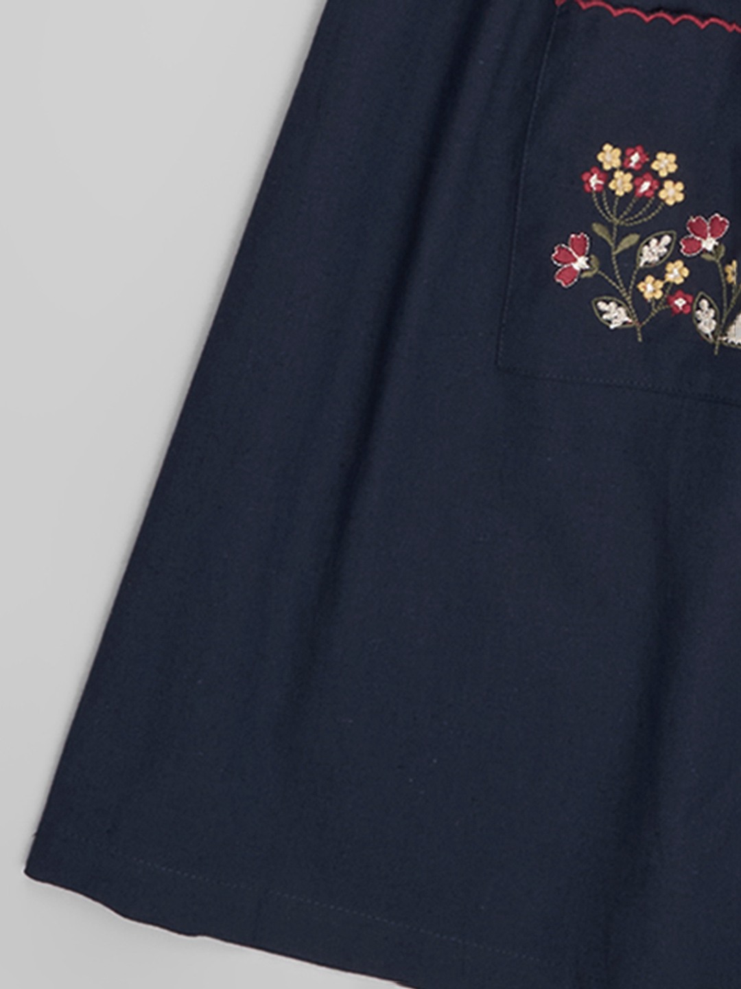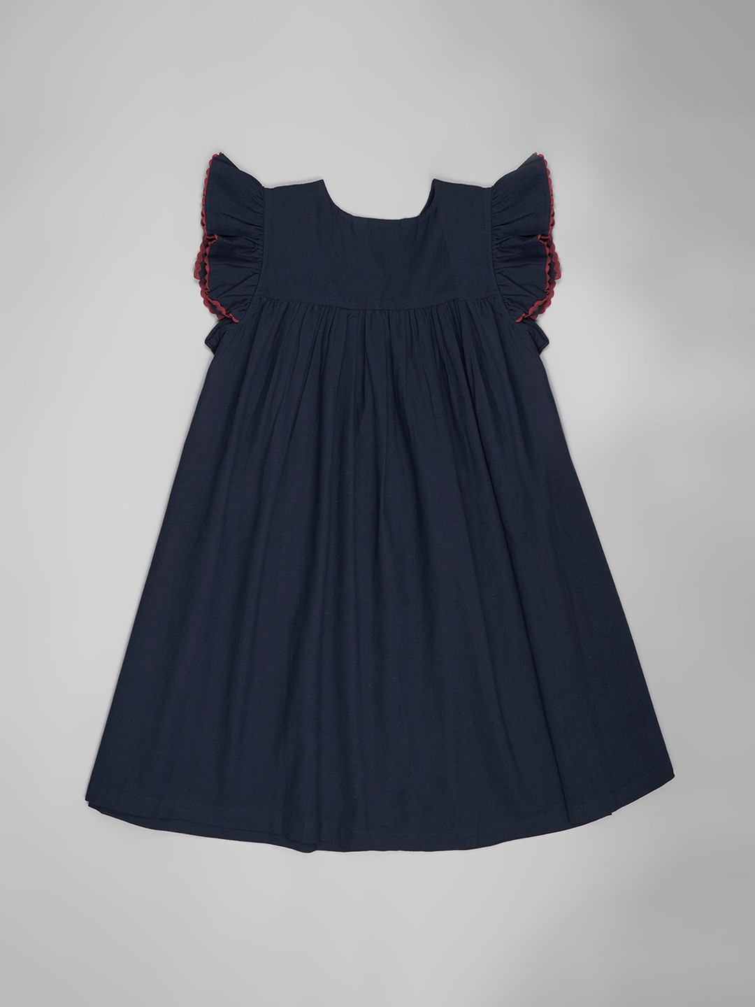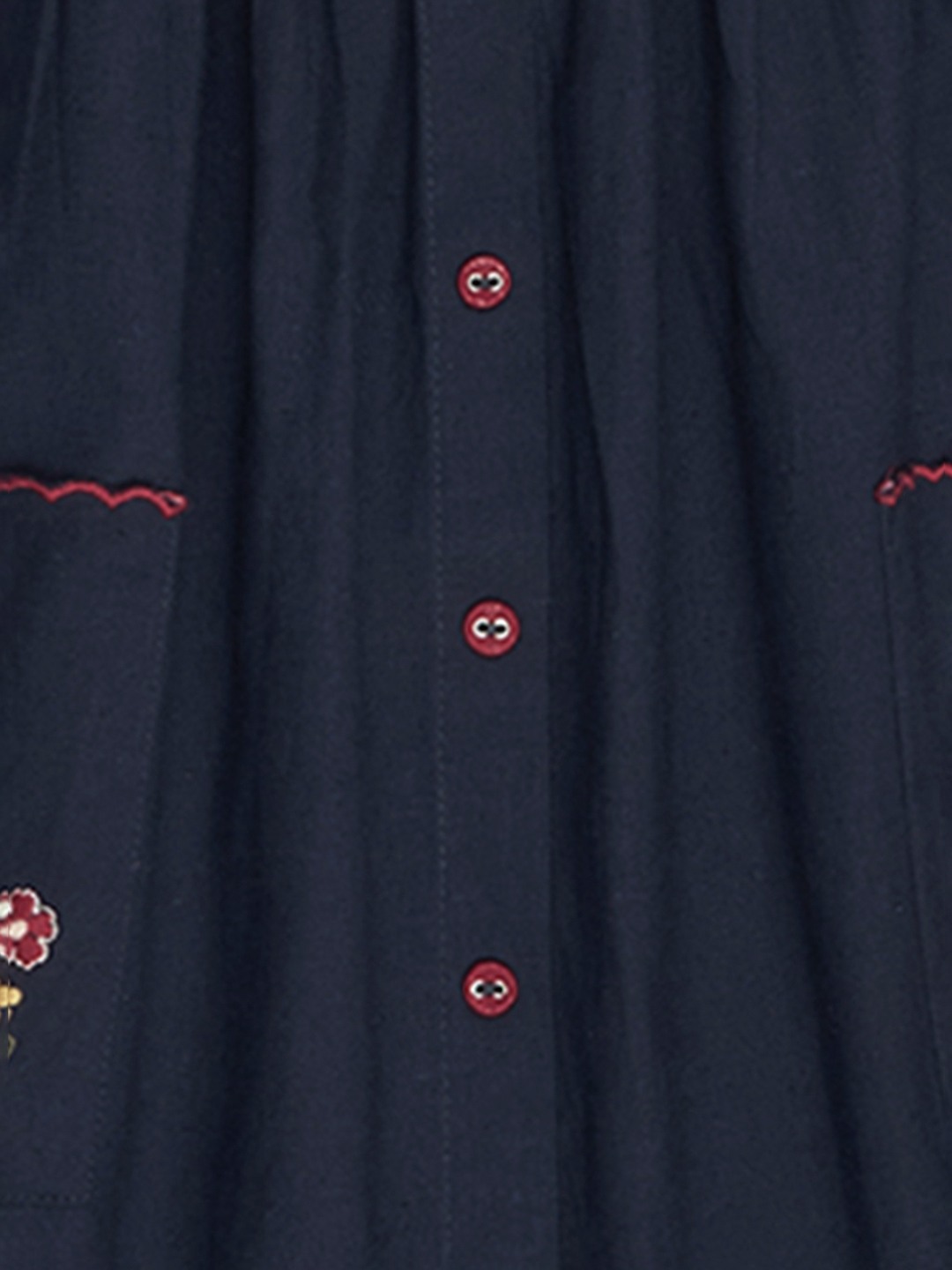 Classic charm meets playful detailing in this thoughtfully designed sleeveless dress. Featuring soft gathers through the body, it is finished with contrast buttons down the front, ruffled shoulder trims with contrast edging, and embroidered pocket accents that add a cheerful focal point. The lightweight woven fabric ensures ease of movement while keeping the silhouette comfortable and airy.