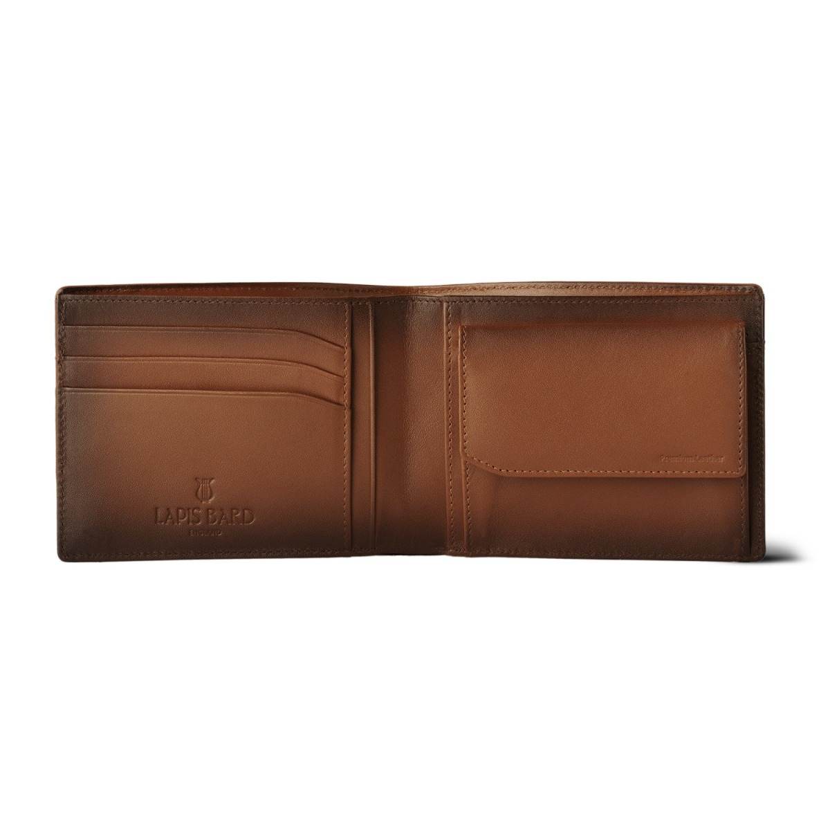 Designed in classic style, this Bi-fold wallet appeals to the sartorial dresser who likes order in his universe. Crafted from semi vegetable dyed leather, This classic styled wallet is equipped with advanced RFID technology to keep your cards secure against digital theft, dual currency compartments, 3 credit card slots, a dedicated pouch to carry coins, a slip in pouch for those ticket stubs, bills and more. The deep sumptuous cognac in two-tone is created by skilled craftsmen, who meticulously hand painted the edges, with colour that gradually darkens as it imperceptibly passes from one shade to another, taking inspiration from Leonardo da Vincis Àúsfumato technique. Custom lined with Lapis Bard monogrammed jacquard silk lining. The Lyre emblem in enamel finish is accented in gold. It is presented in Lapis Bard's signature gift box.