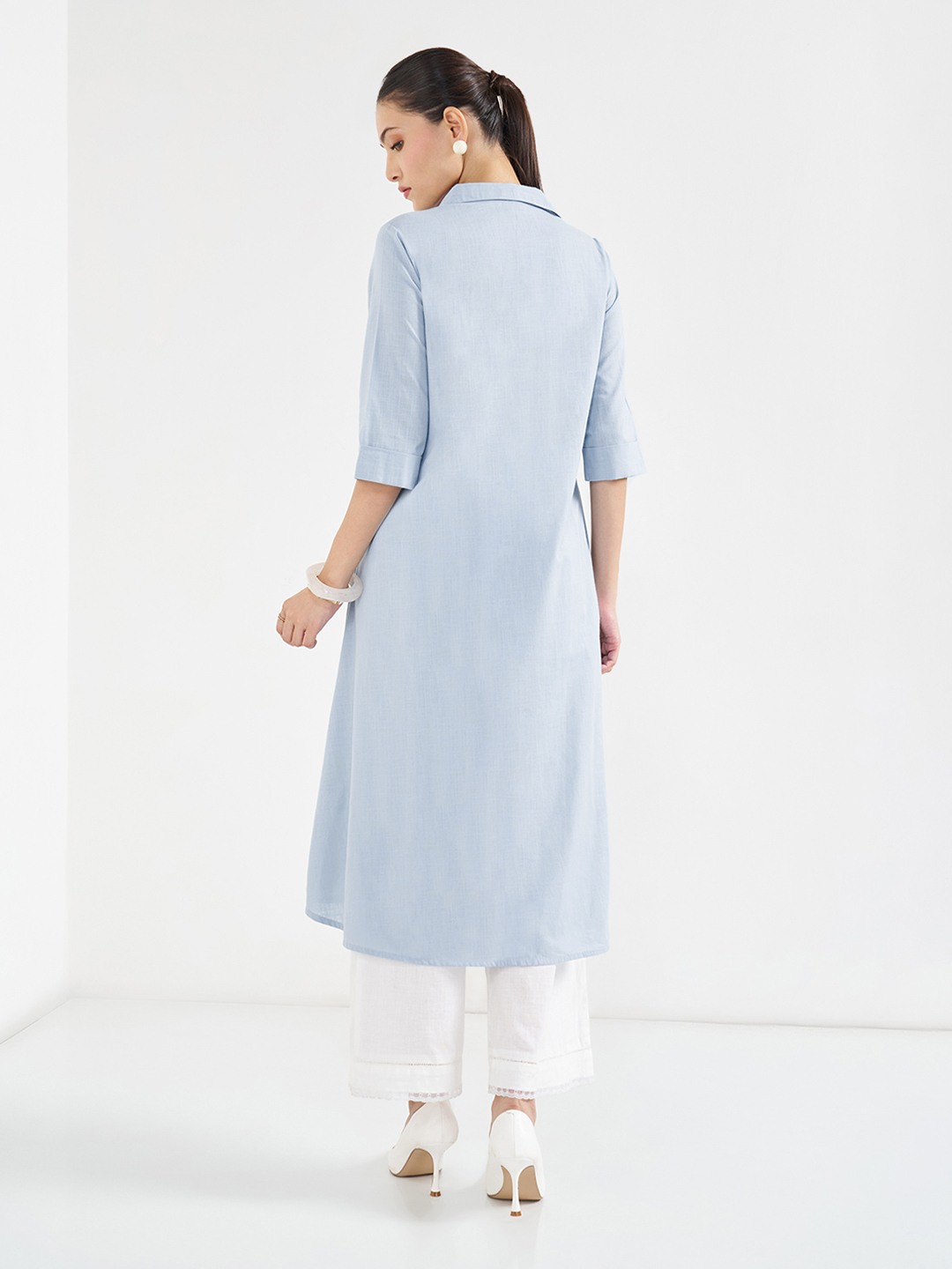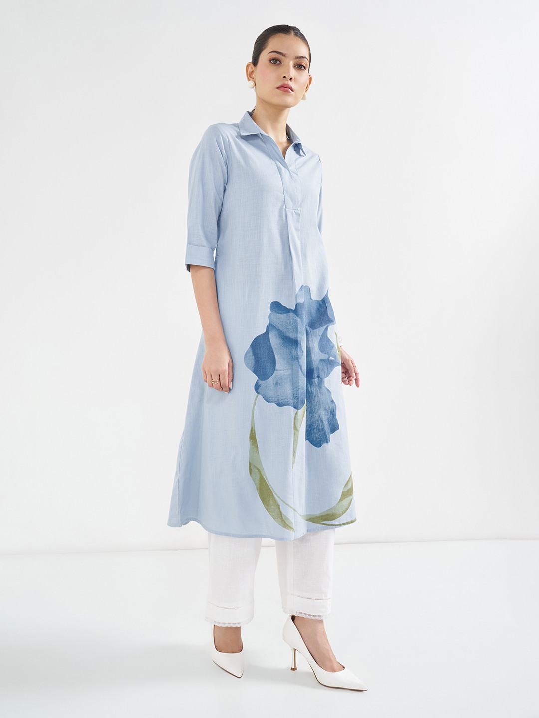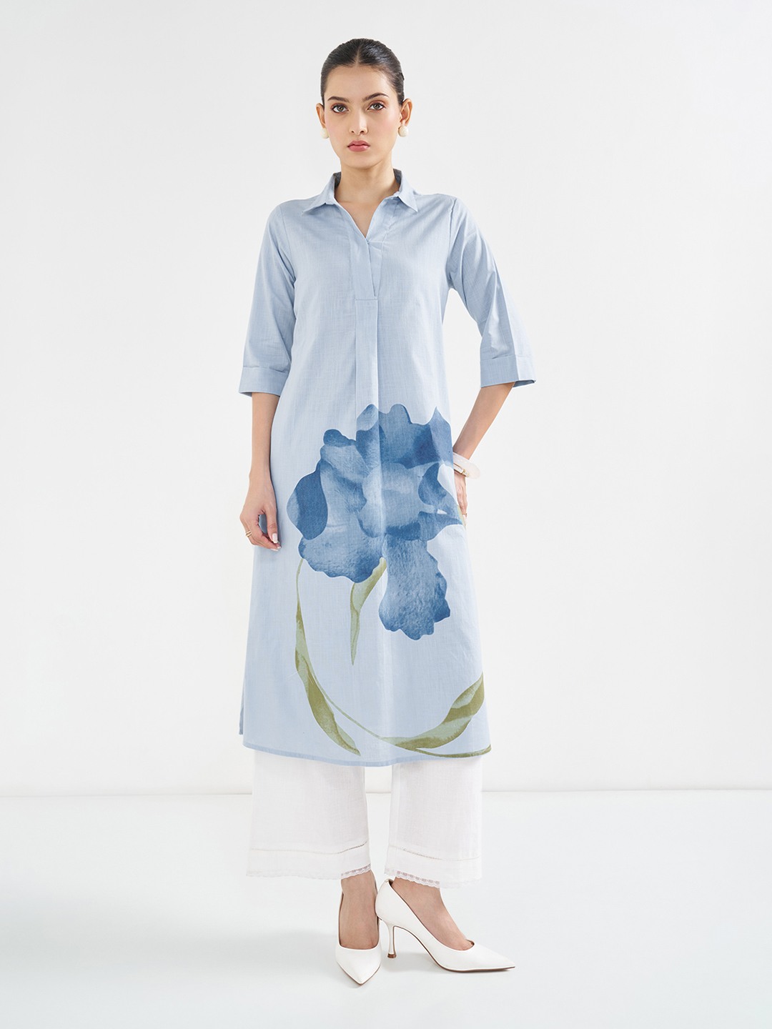 Channel the leading lady in you with this stunning silhouette. The kurta features a collared neck, cuffed 3/4 sleeves and a statement floral print. Crafted from a select fabric that will elegantly uplift your style.