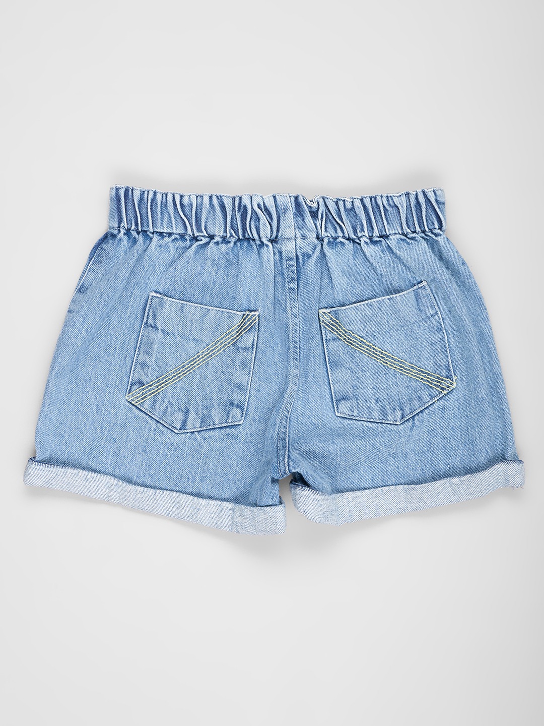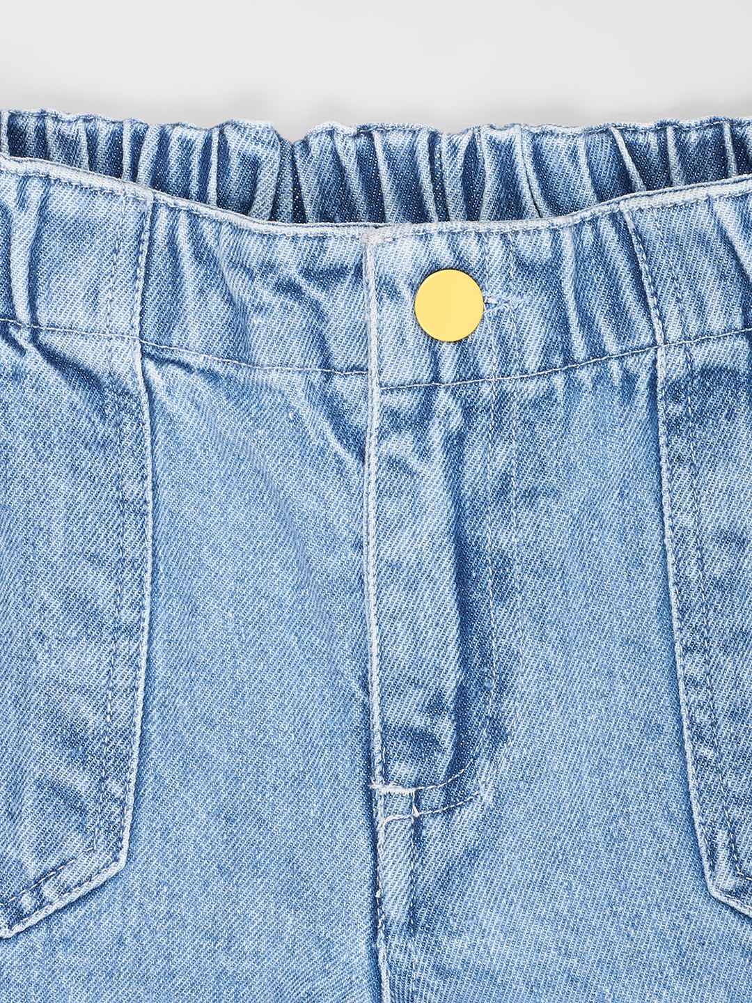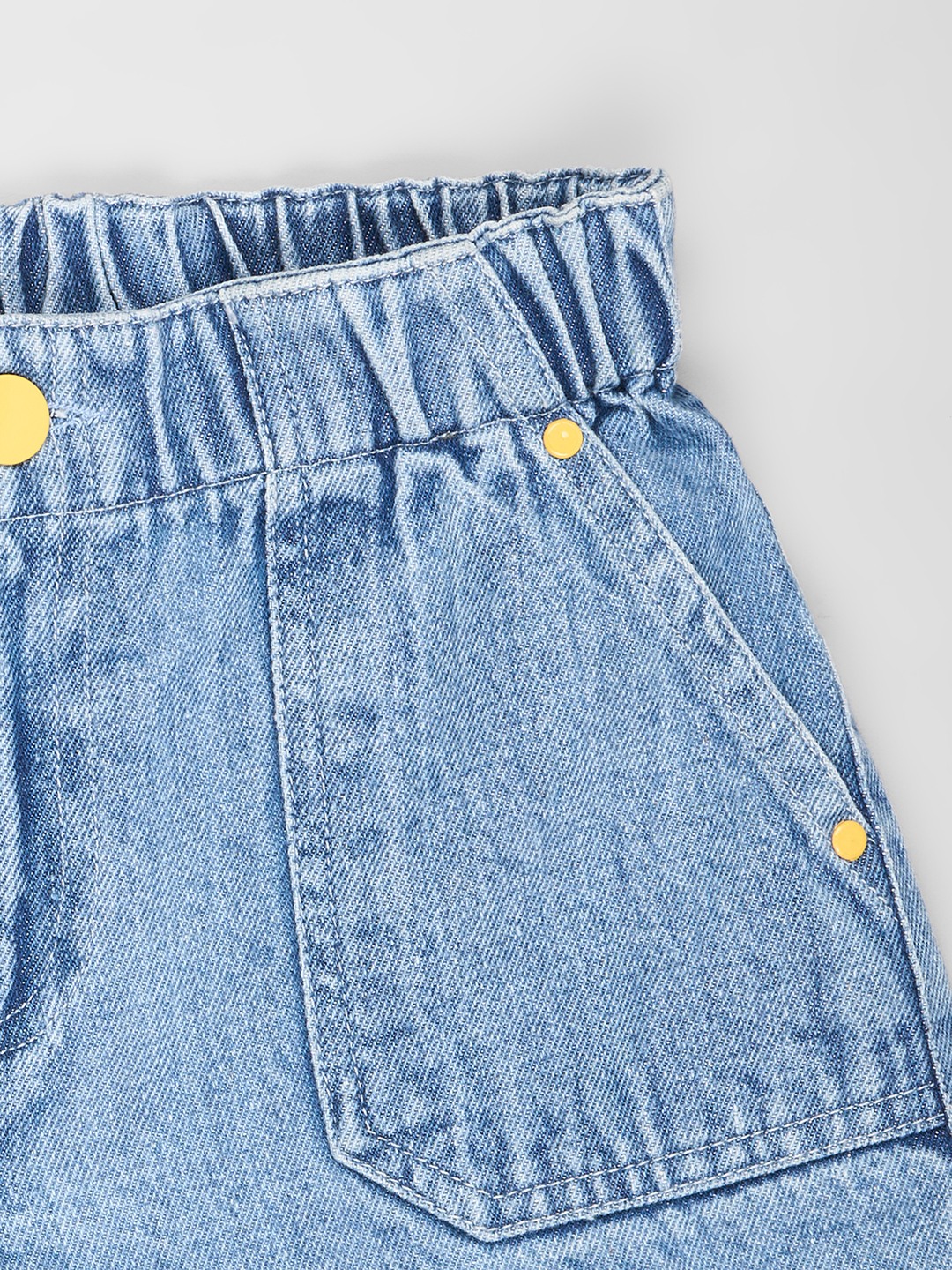Playful denim styling with an elasticated waist that adds function and character. Designed with an elasticated waistband, button detail, roomy pockets and turned-up hems for a fun, structured look. Made from soft washed denim that stays comfortable and gentle on the skin.
