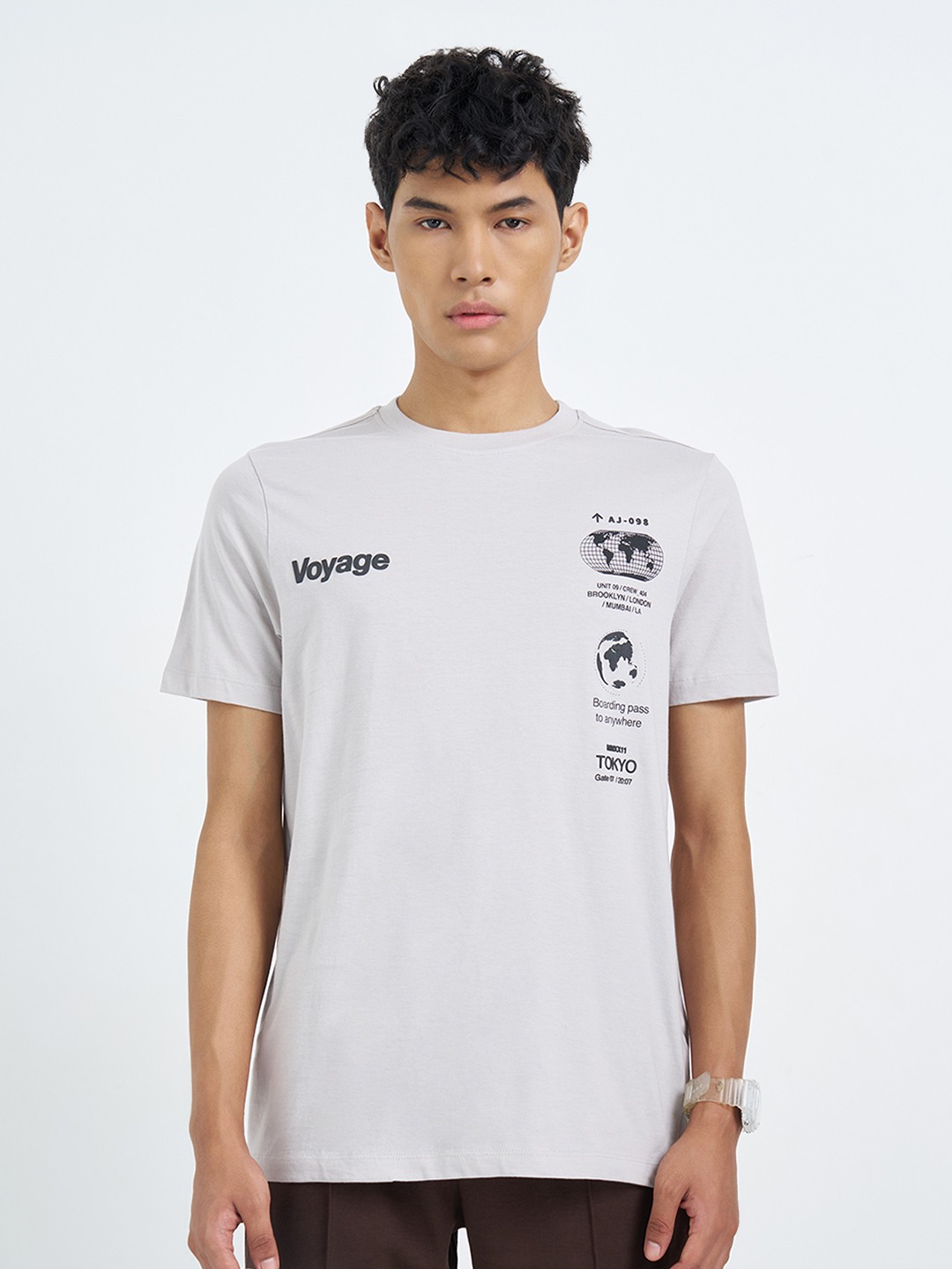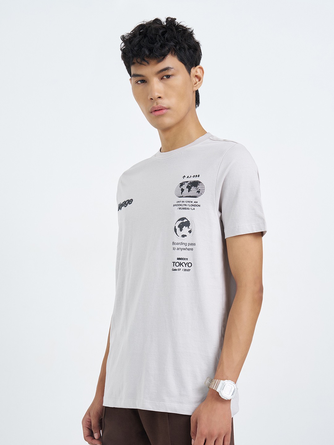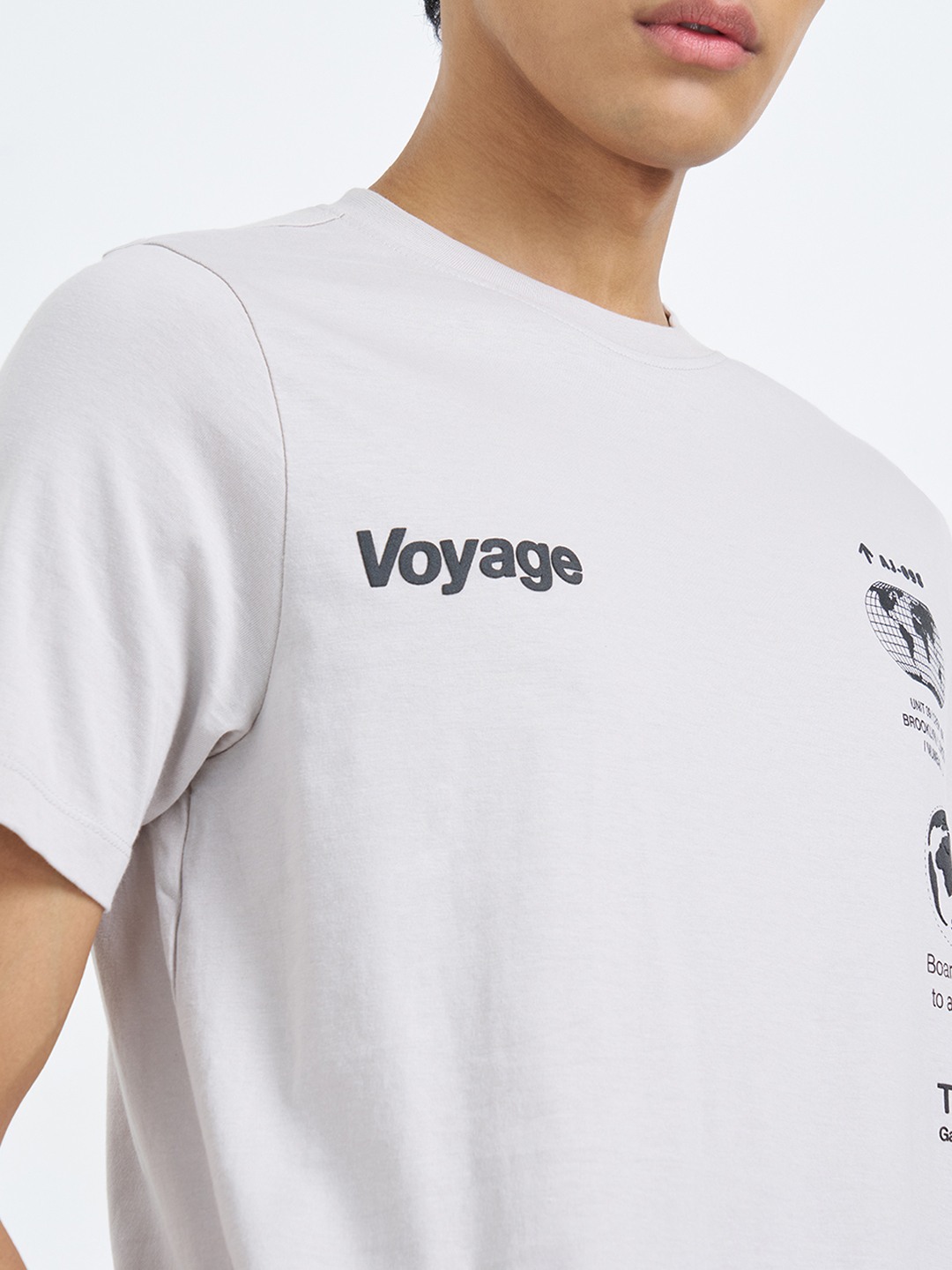 Travel-inspired graphics set the tone for this understated T-shirt with a contemporary edge. Designed with a crew neck and half sleeves, it features a smooth knit surface accented by placement text and globe motifs that feel directional without being loud. The lightweight jersey construction keeps the silhouette easy and wearable.