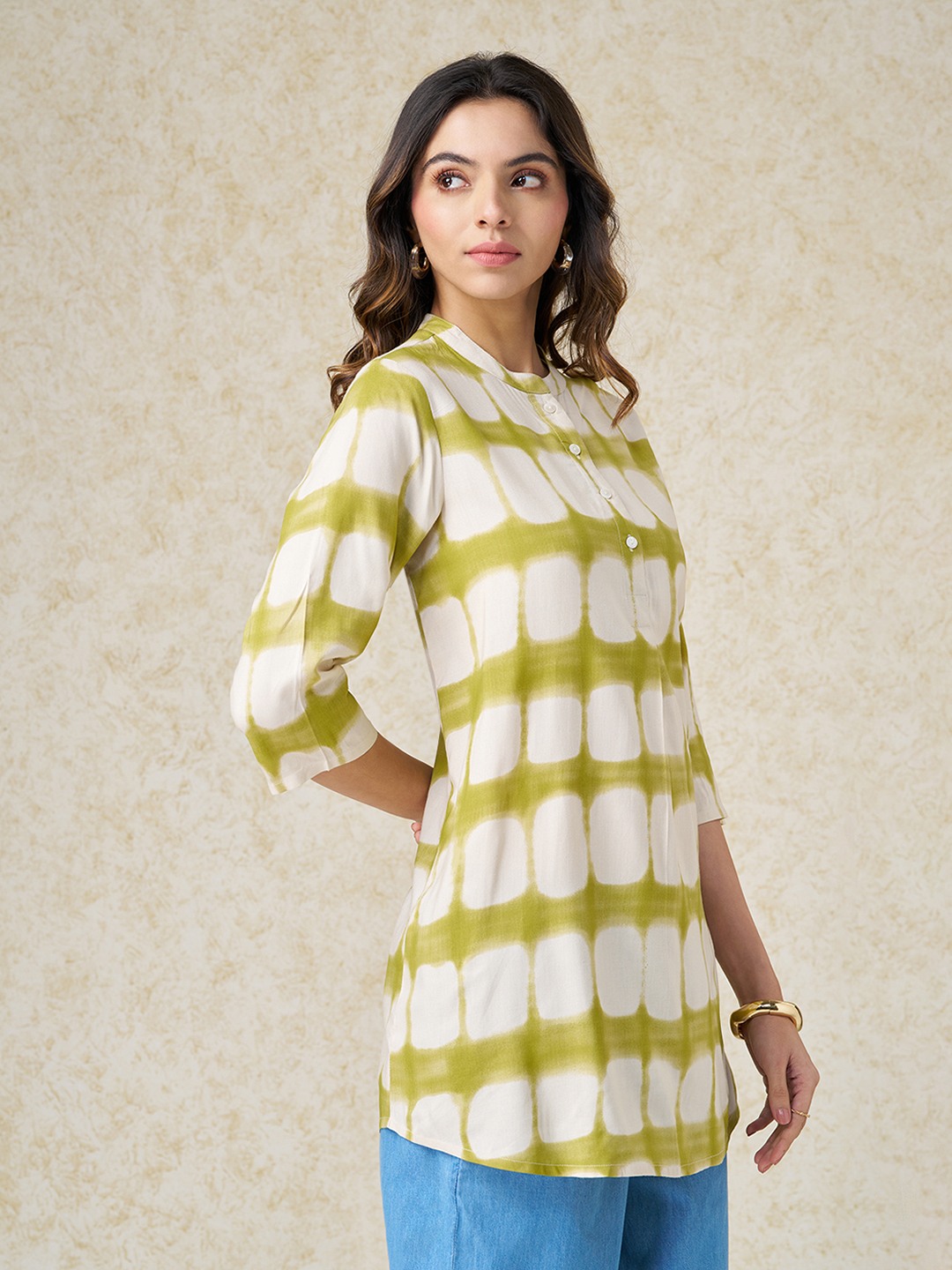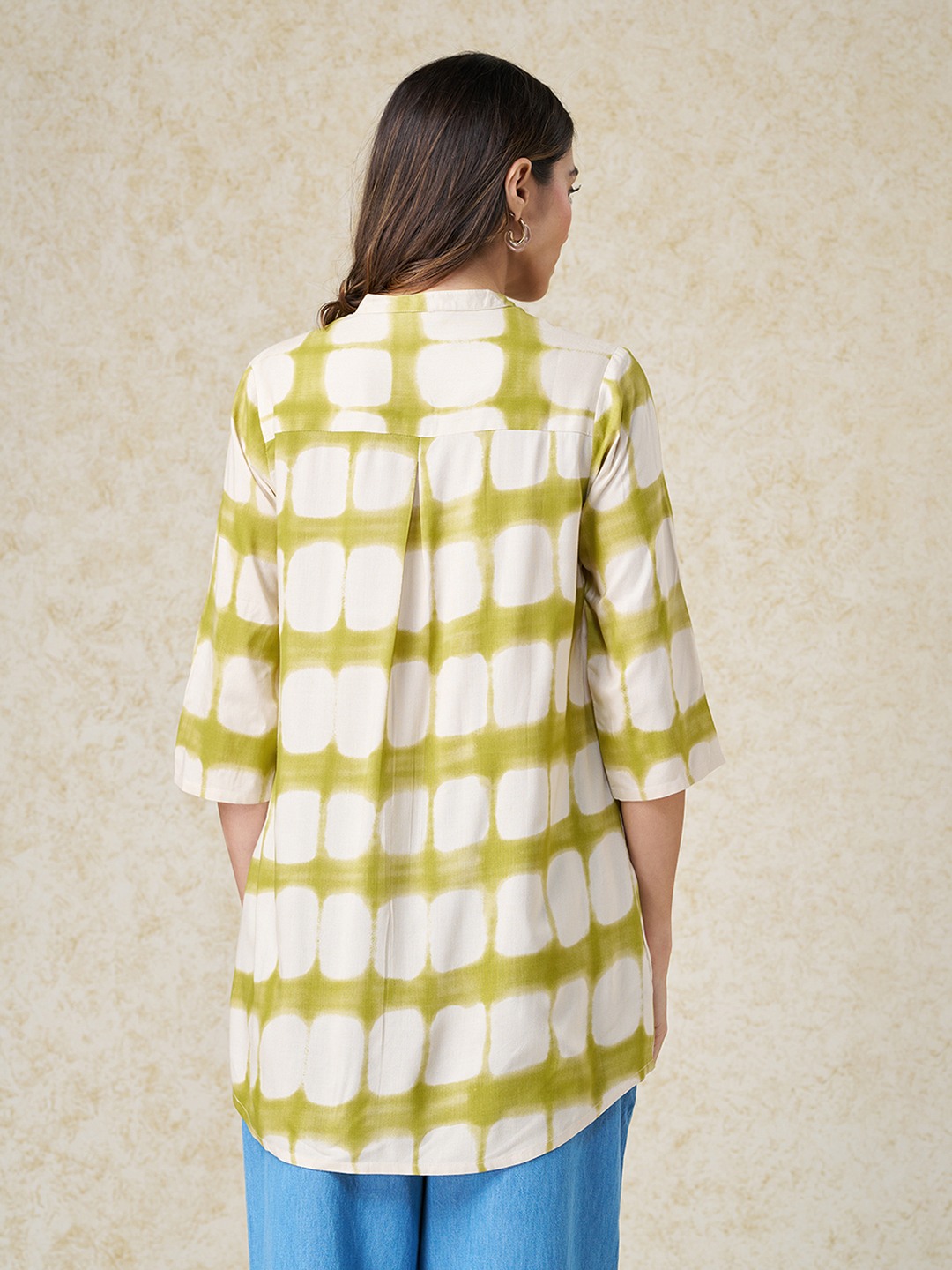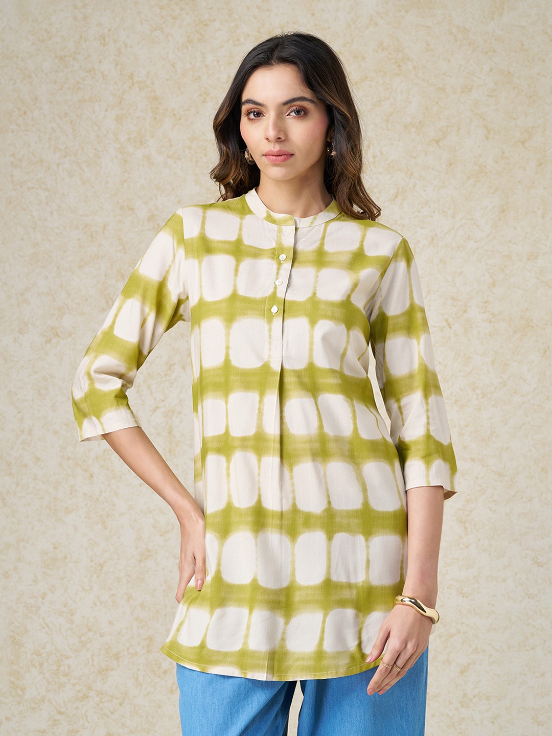Modern geometry lends this silhouette a fresh, graphic edge. Designed with a mandarin collar, half button placket and 3/4 sleeves, it features an all-over tie-dye grid print. The lightweight woven fabric offers breathable comfort with an easy drape.