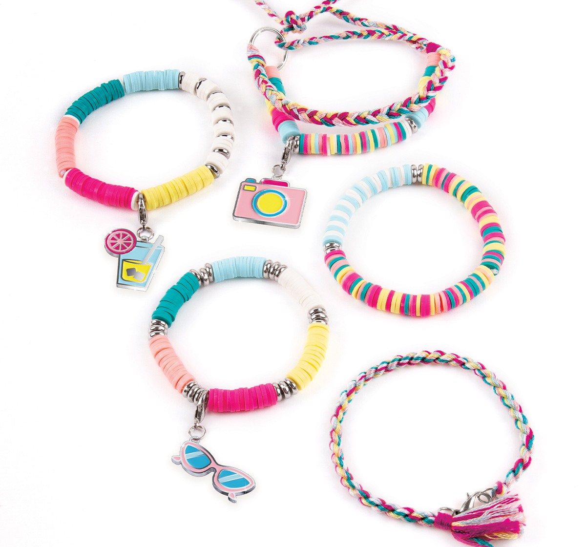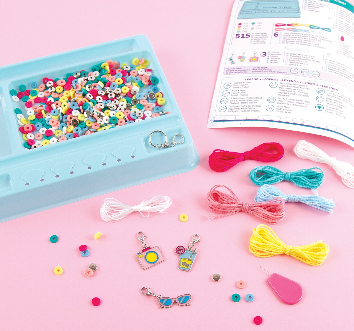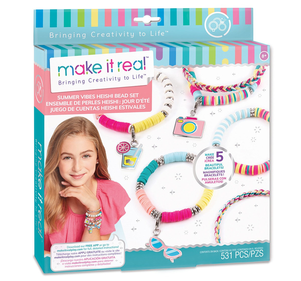 Learn how to create five heishi bead charm bracelets with this 528-piece jewelry kit complete with a sturdy PlayTray workstation. Ages 8+.