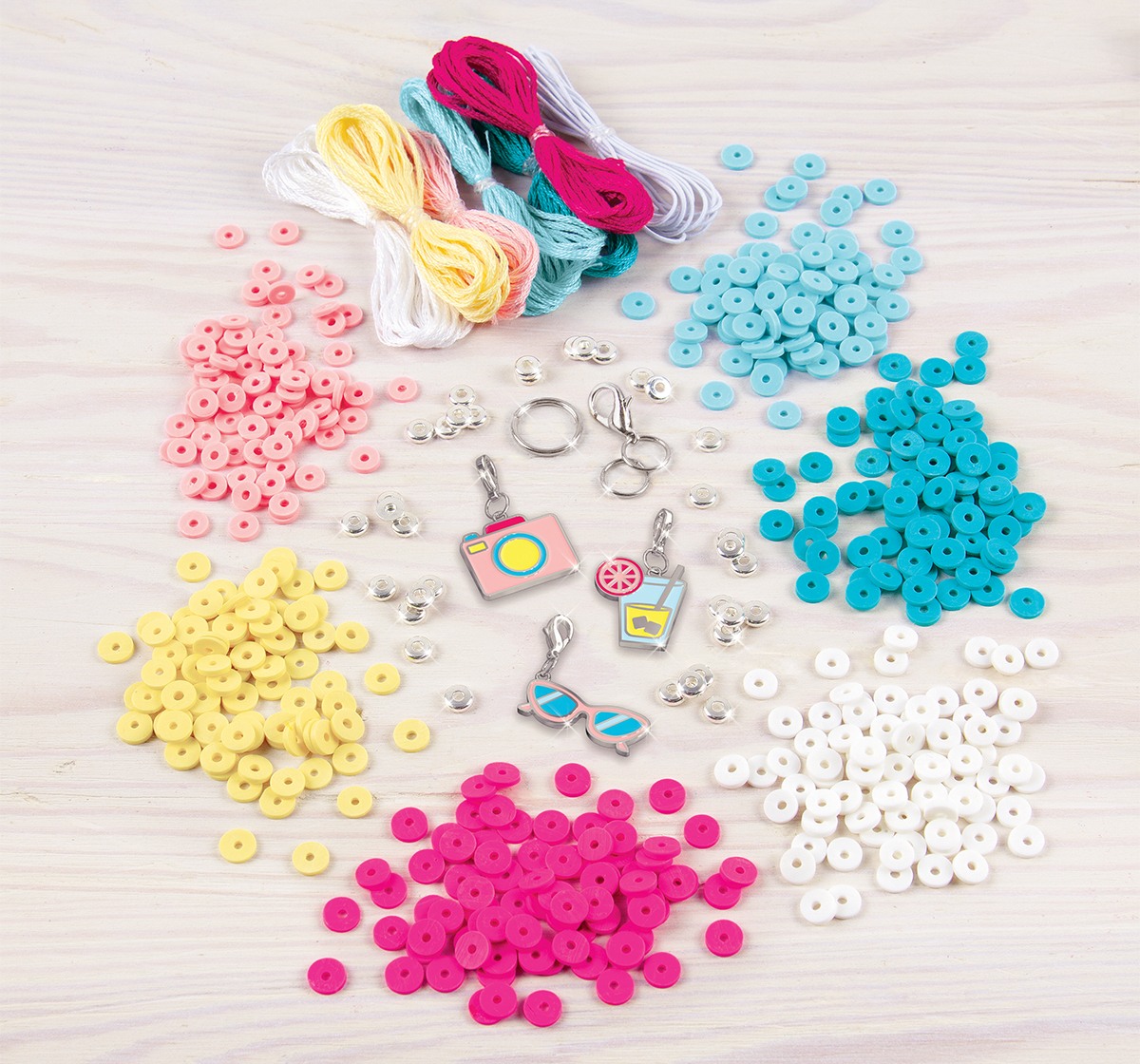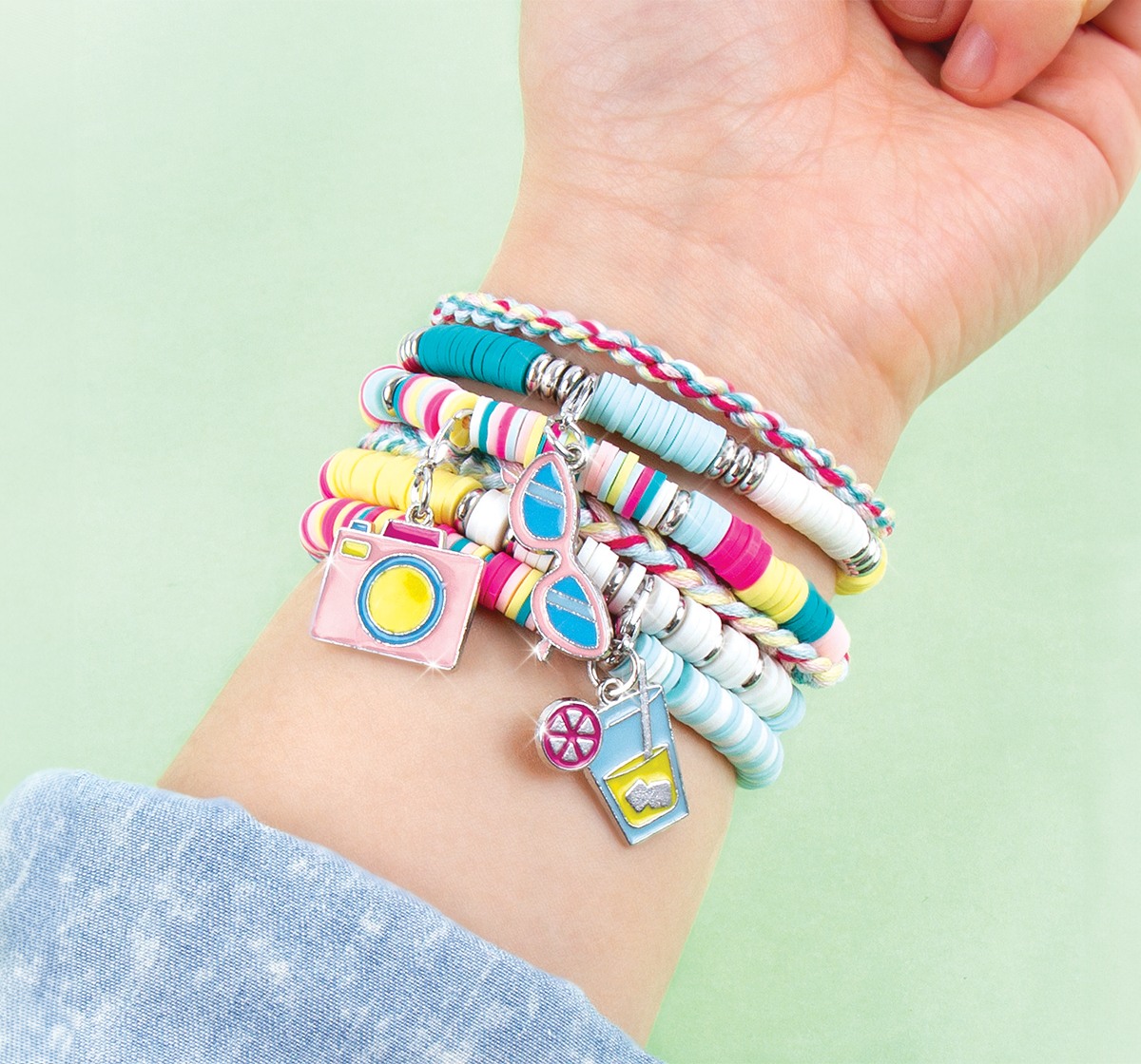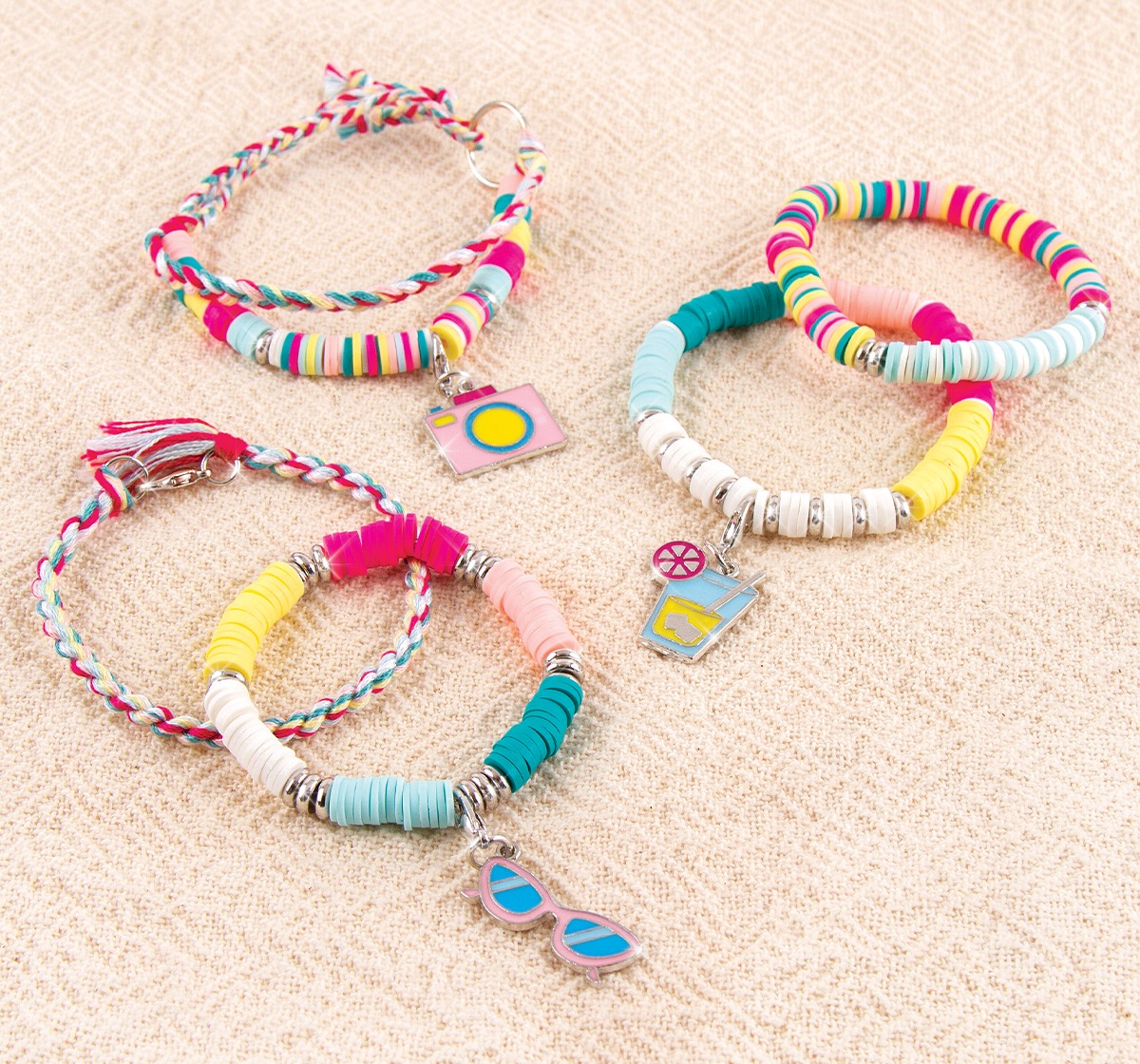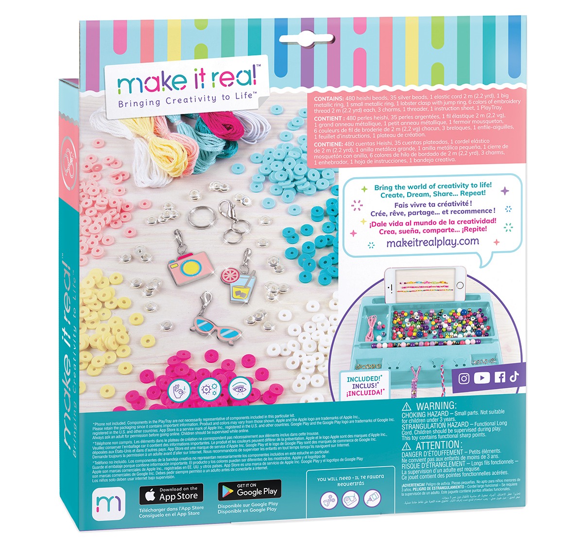 Learn how to create five heishi bead charm bracelets with this 528-piece jewelry kit complete with a sturdy PlayTray workstation. Ages 8+.