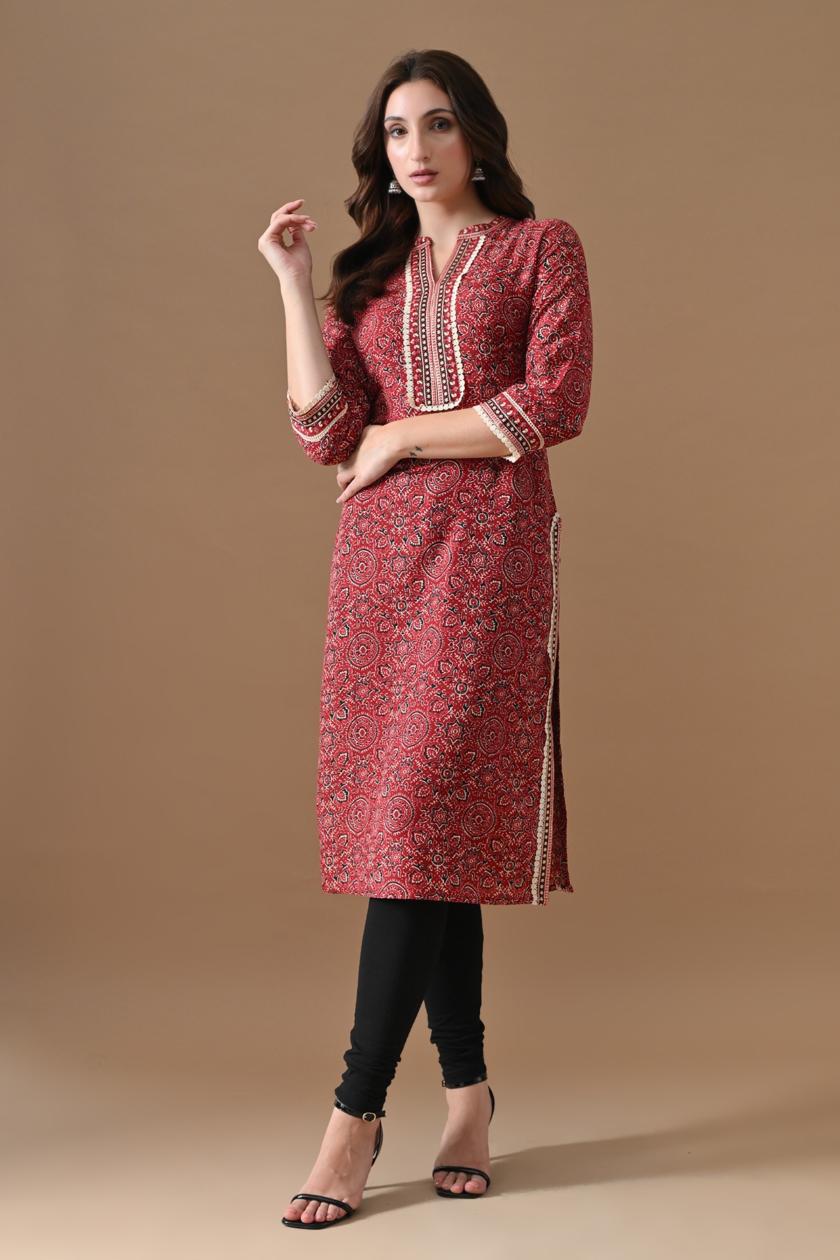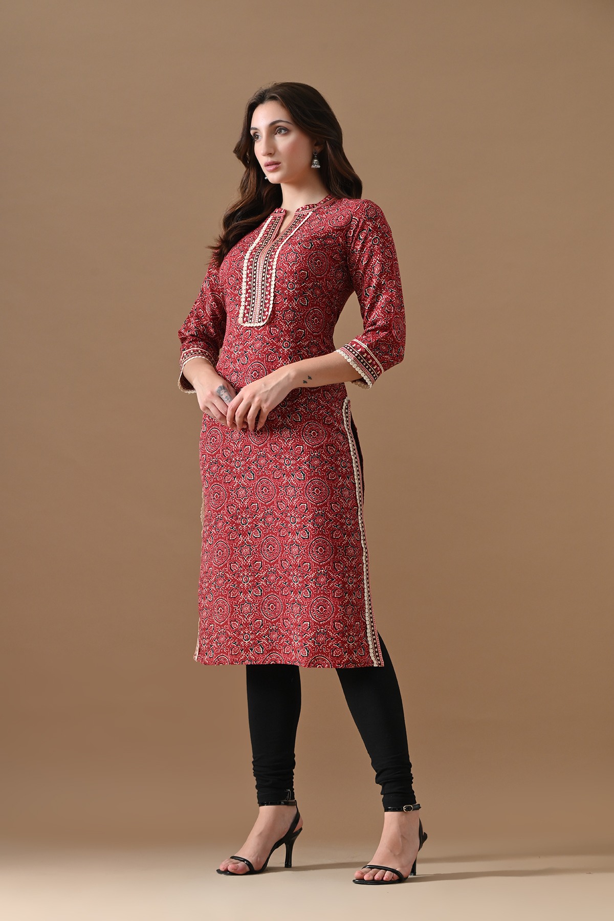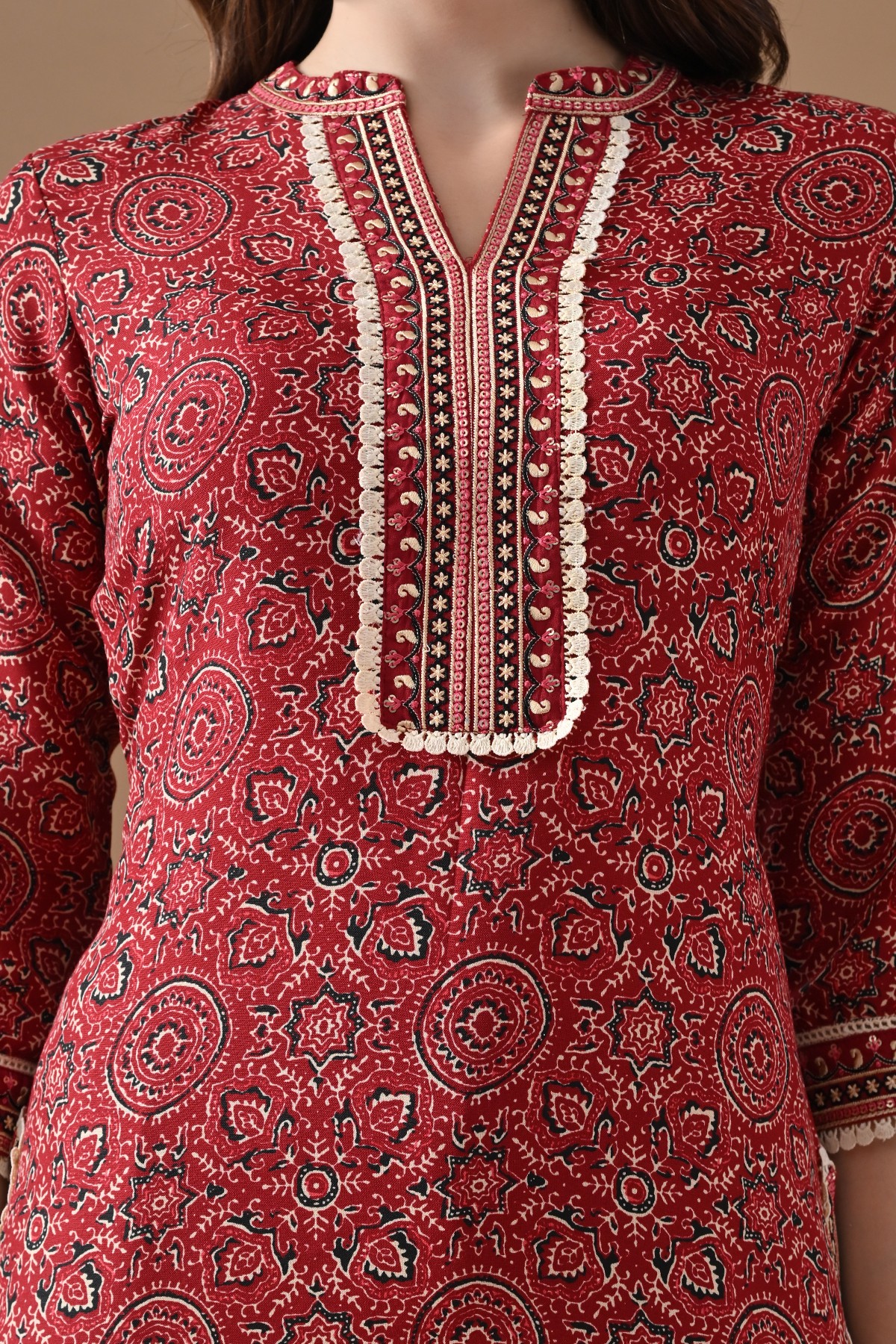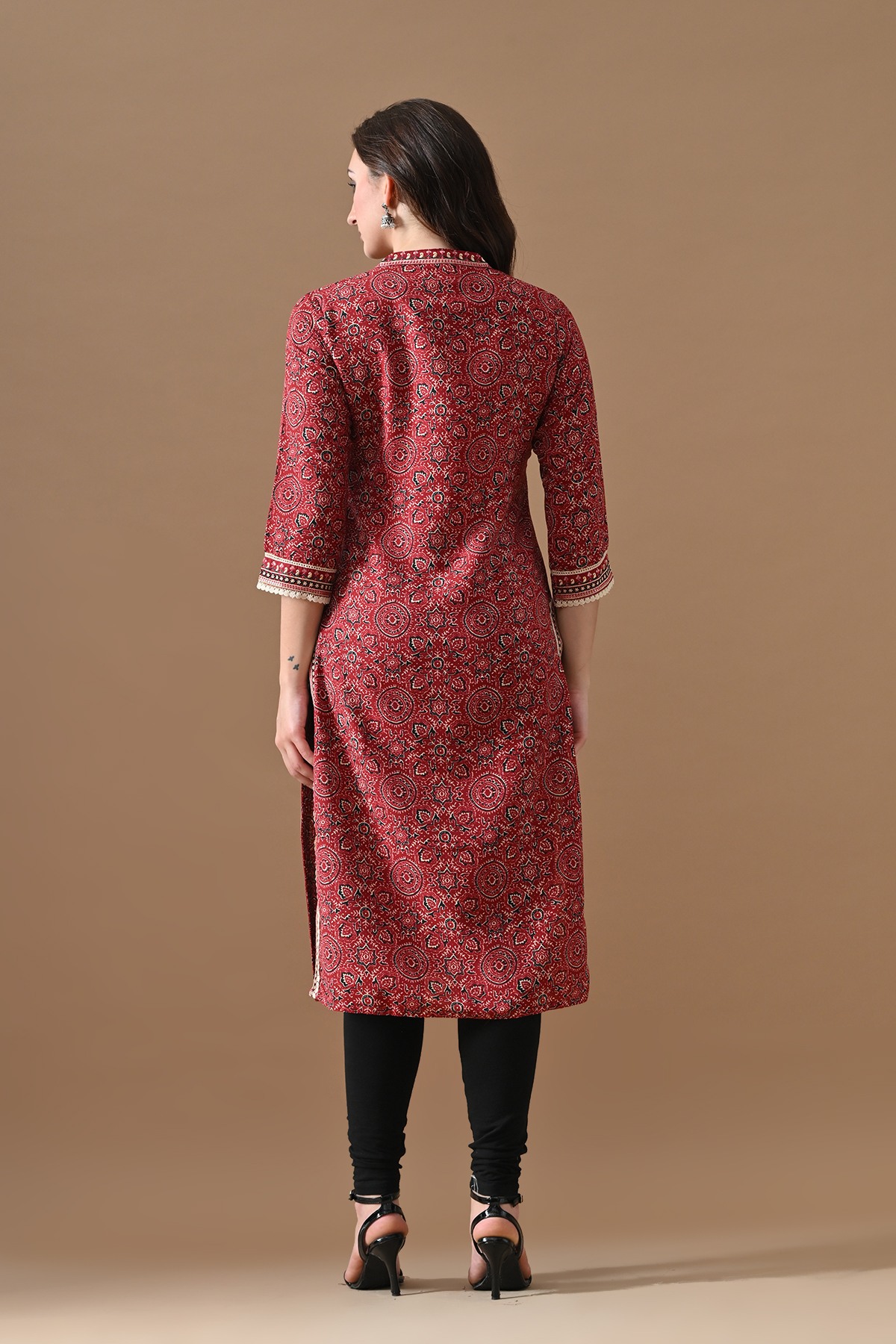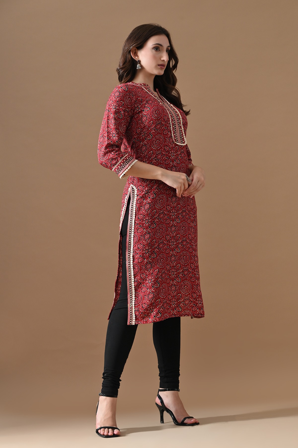 This maroon printed kurta set crafted with subtle touch of lace work. features with a classic mandarin collar, three-quarter sleeves, side slit, and straight hemline. paired with pant which have a functional pocket for ease. elegant and stylish, it’s perfect for any occasions, ensuring comfort with a touch of sophistication.