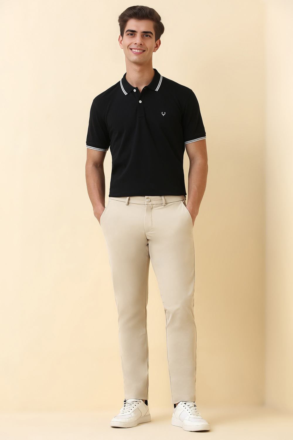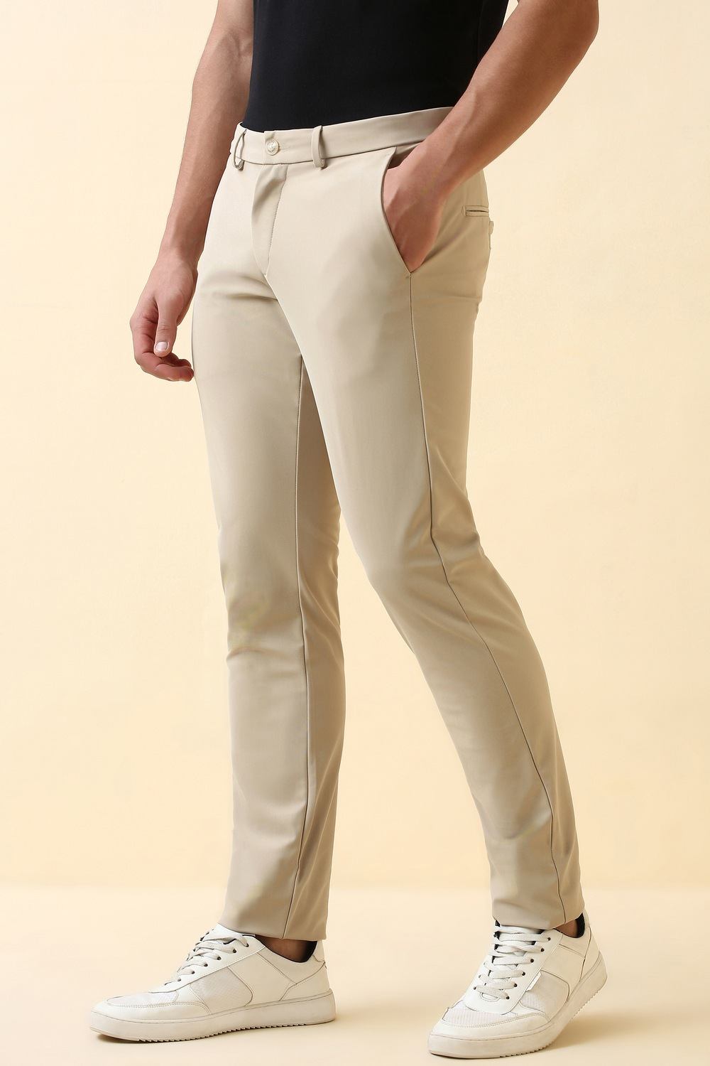 Elevate your casual ensemble with these Allen Solly trousers in a versatile beige hue. Crafted from lightweight polyester, they promise comfort and ease during everyday wear. The solid pattern enhances their timeless appeal, making them easy to pair with a variety of tops. Designed for the modern man who values style without compromise, these trousers are a go-to choice for effortless sophistication. Redefine your casual wardrobe with this essential piece.