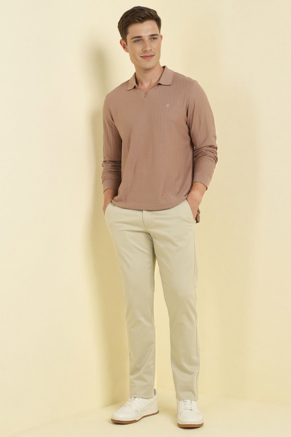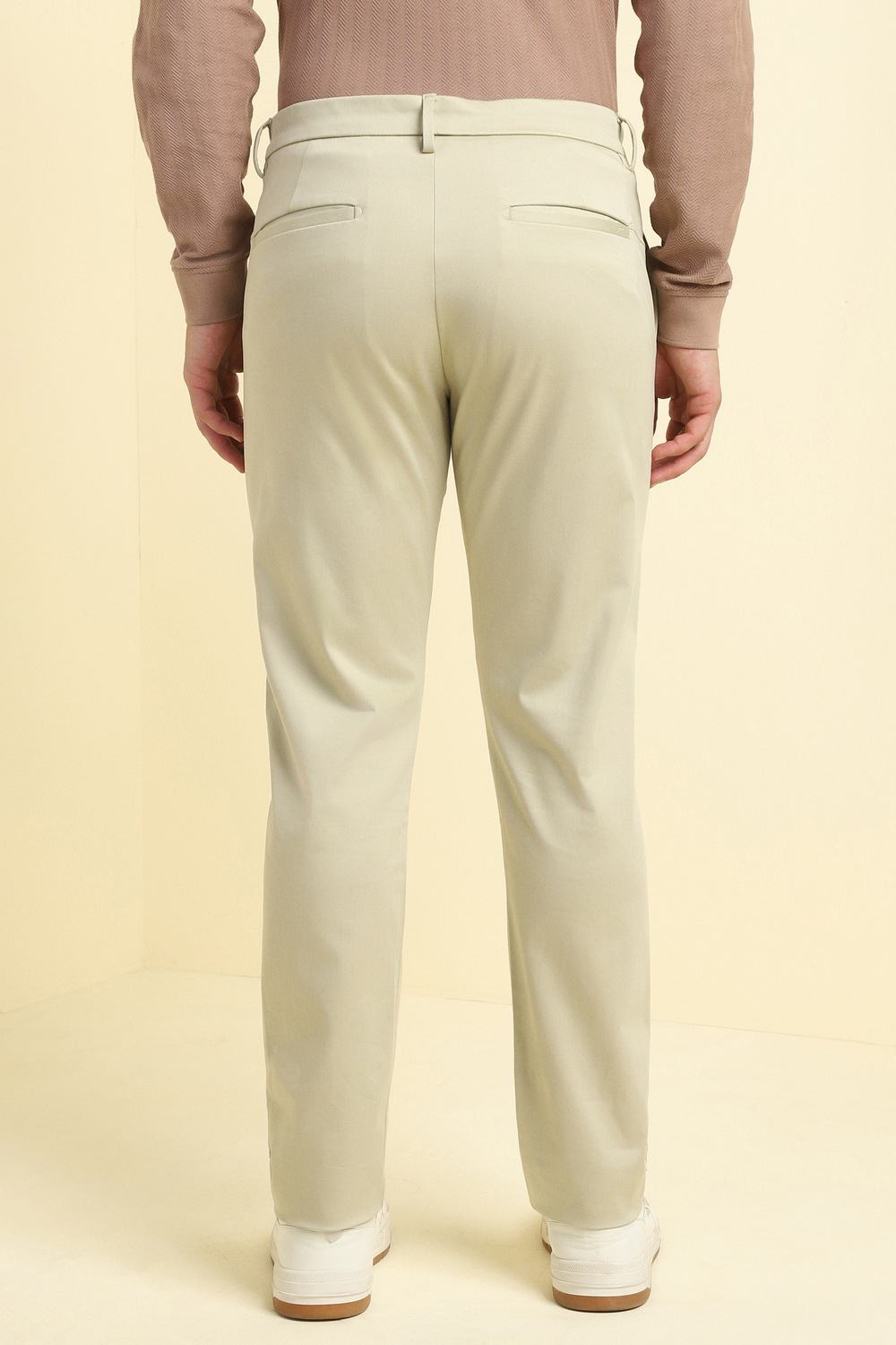 Introducing the Allen Solly men`s trouser in a sophisticated beige hue, crafted from a premium blend of cotton, modal, and elastane for superior comfort. This slim-fit design, featuring a classic flat front, is perfect for casual occasions, offering a polished and stylish look. Effortlessly versatile, these trousers are an essential addition to your wardrobe, perfect for pairing with any casual top for an elevated ensemble. Experience timeless elegance and comfort.