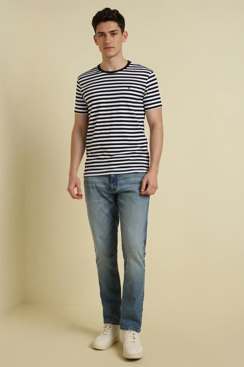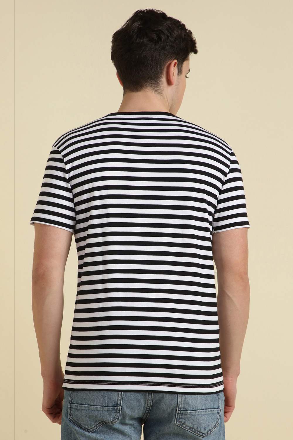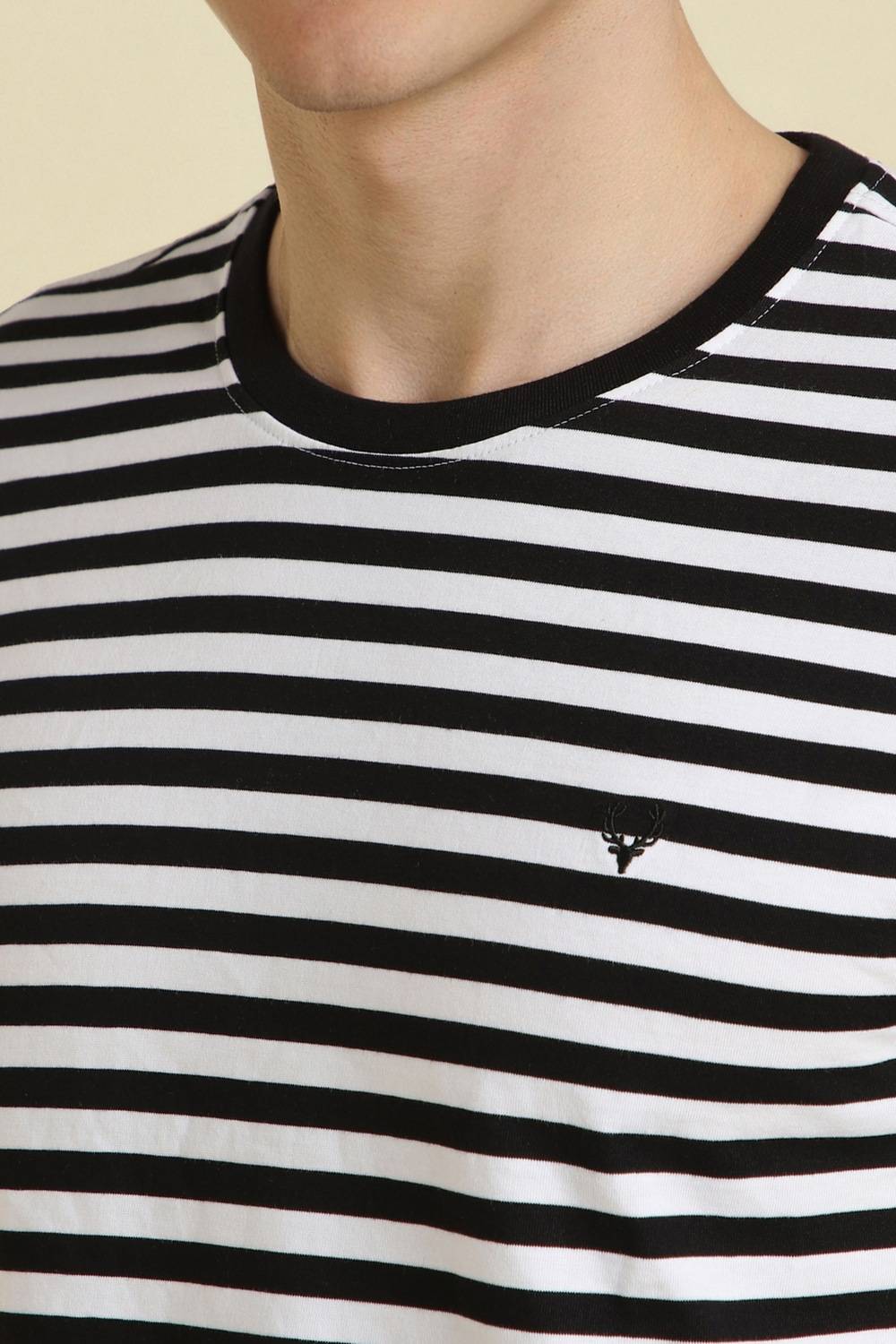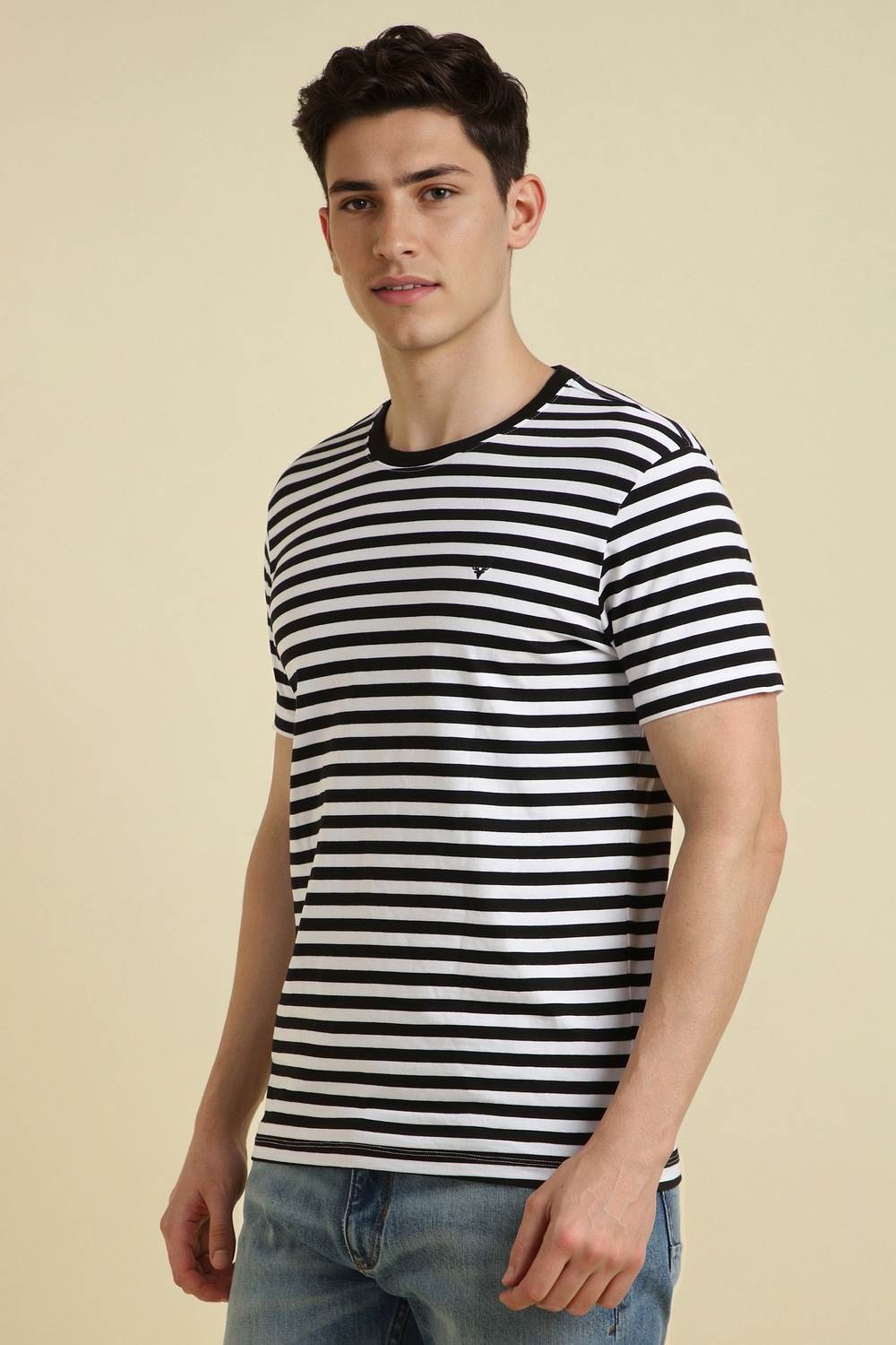 Elevate your casual wardrobe with this Allen Solly black t-shirt. Crafted from soft cotton, it features a snug fit and stylish striped pattern, enhancing your silhouette while ensuring comfort. The crew neckline and half sleeves provide a relaxed yet refined look, perfect for laid-back outings. Embrace effortless style and versatility with this essential piece, seamlessly transitioning from day to night. Ideal for the modern man who values quality and sophistication.
