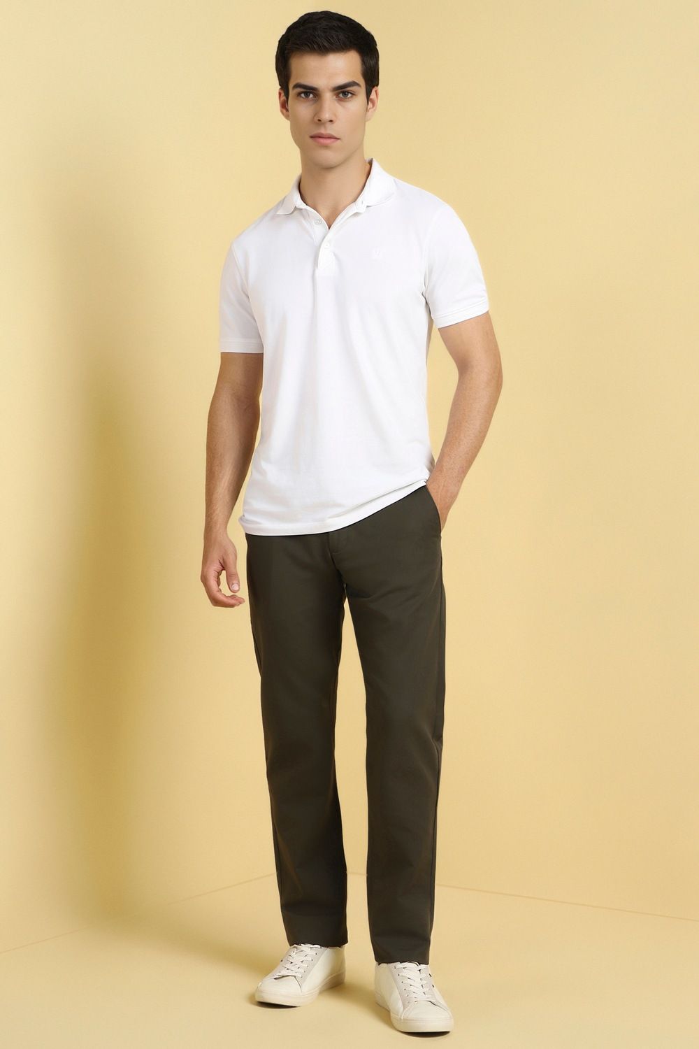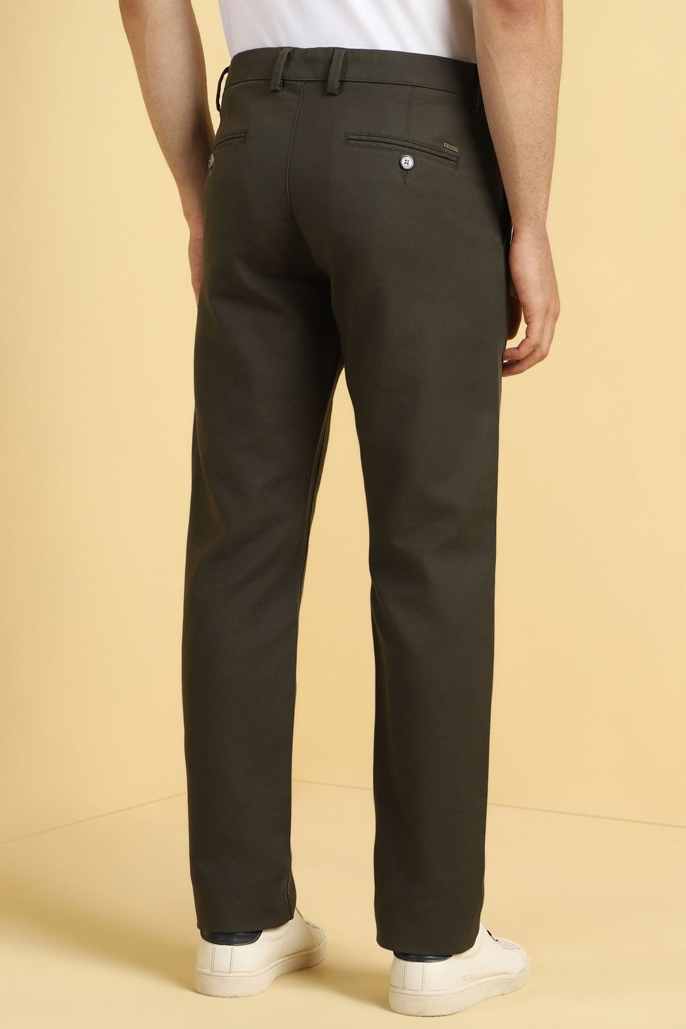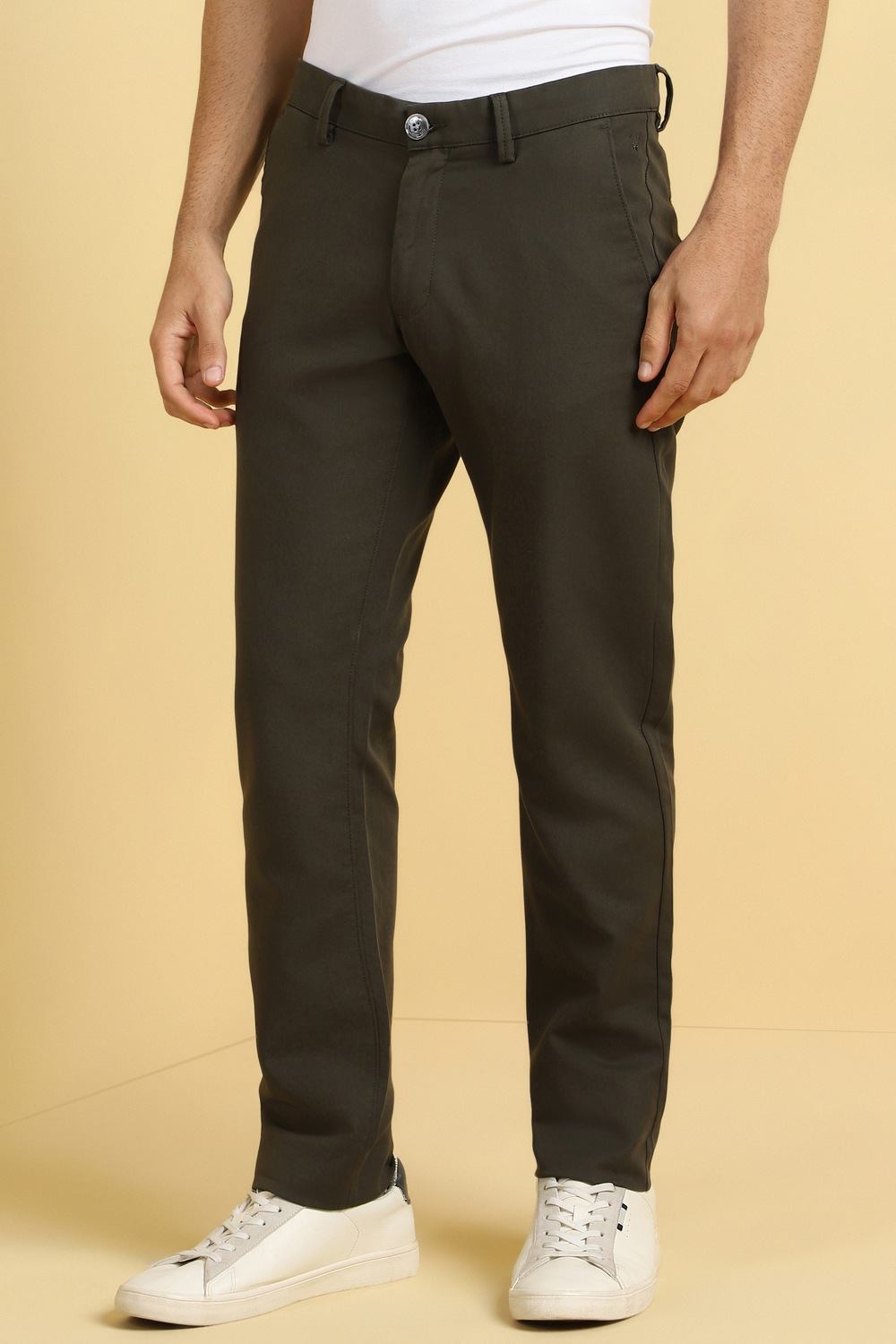 Introducing the Allen Solly Textured Green Trousers, designed for the modern man who values both style and comfort. Crafted from a premium blend of cotton and spandex, these slim-fit trousers ensure an effortless look for casual outings. Featuring a flat front, they offer a tailored silhouette that pairs perfectly with a variety of tops. Elevate your everyday wardrobe with this versatile essential that seamlessly combines sophistication and ease.