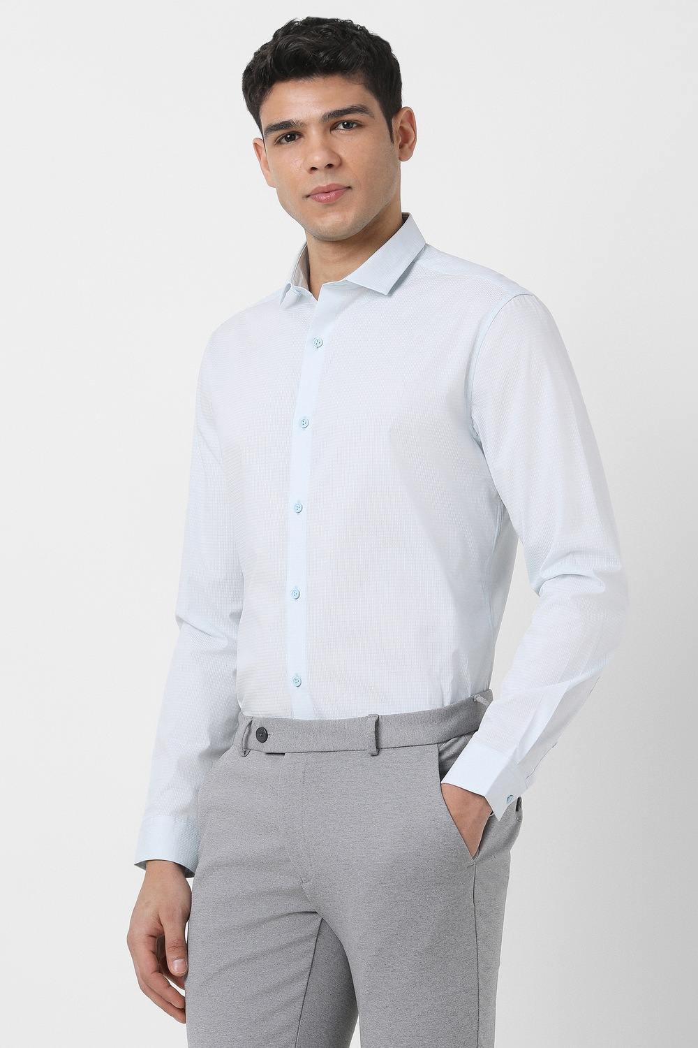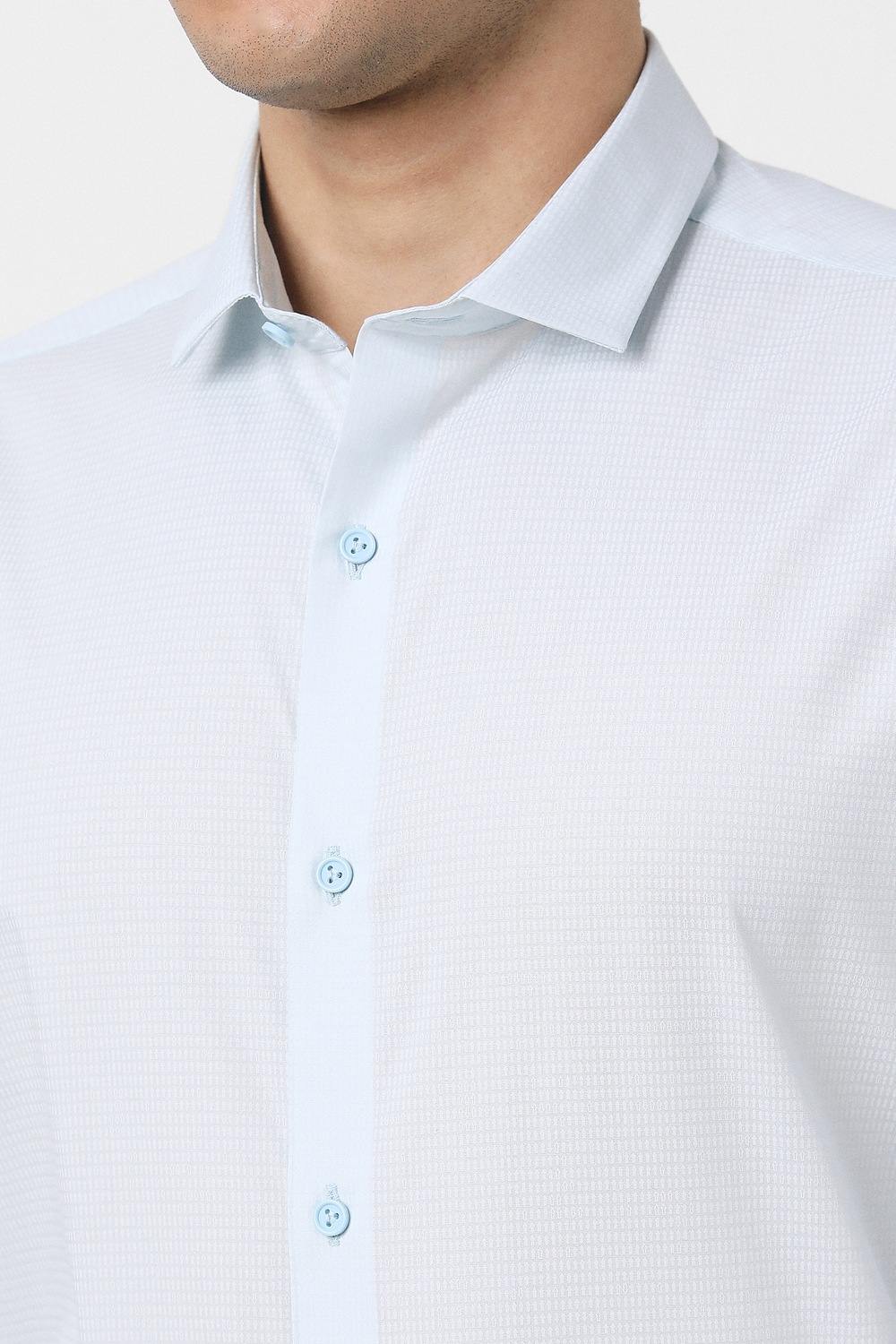 This Peter England Perform full sleeves formal shirt in light blue exudes sophistication and charm. Crafted from a durable blend of cotton and spandex, it ensures a slim fit for a polished silhouette. The textured pattern adds depth, making it perfect for formal occasions. With full sleeves for added elegance, this shirt is an essential piece for the modern gentleman seeking both style and comfort. Elevate your wardrobe with this versatile shirt.