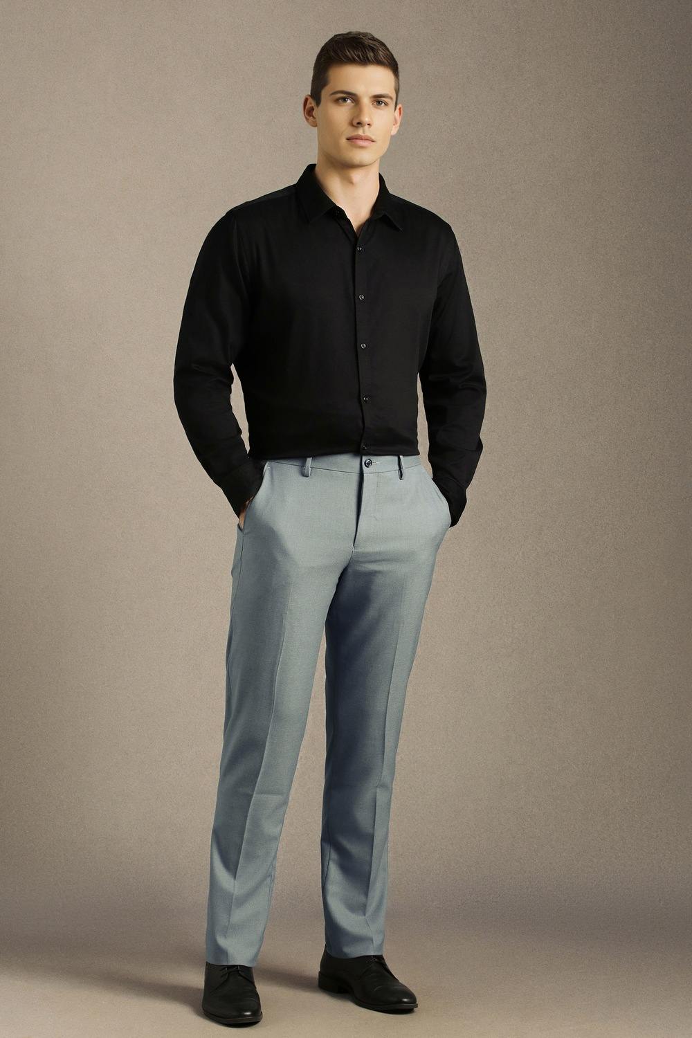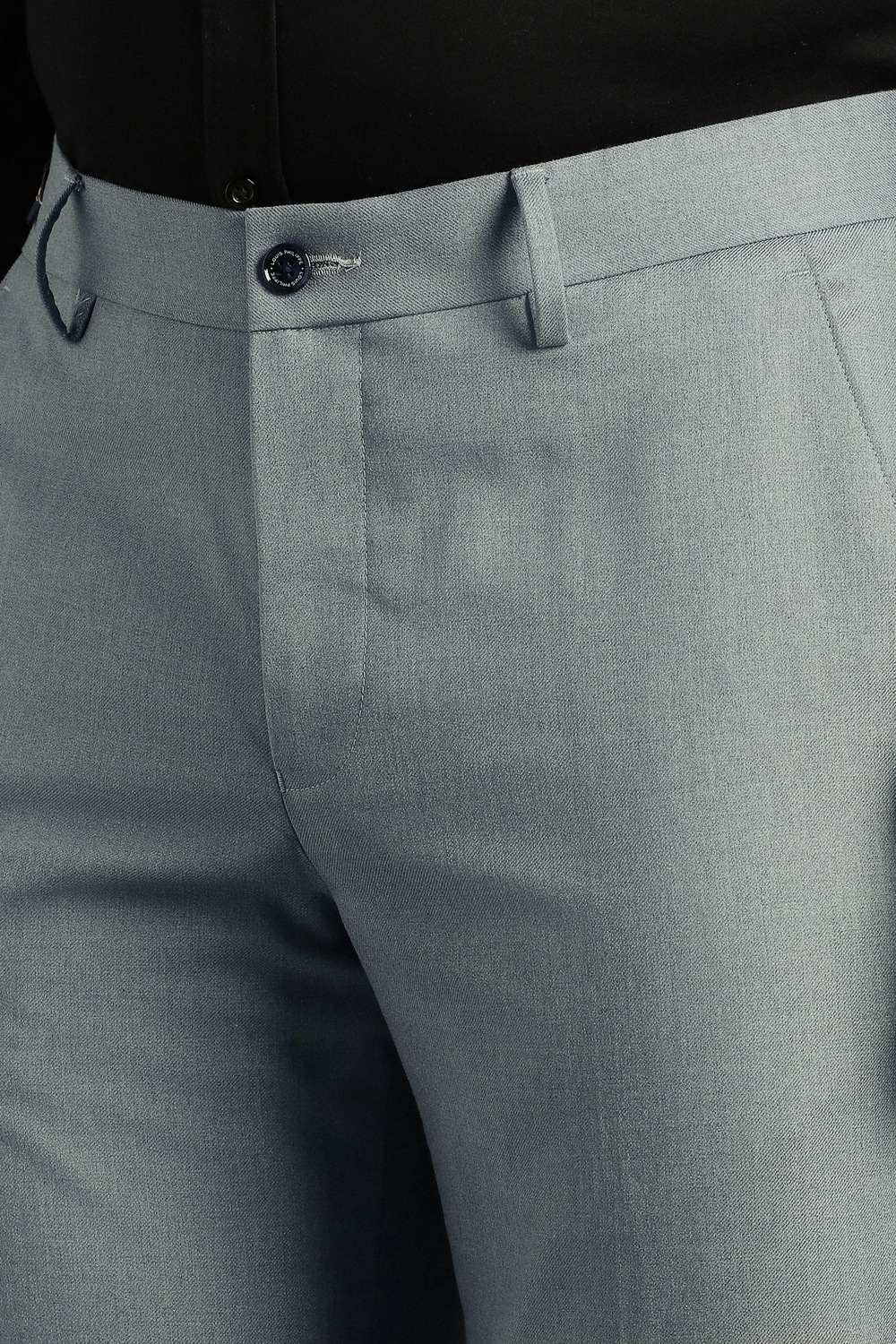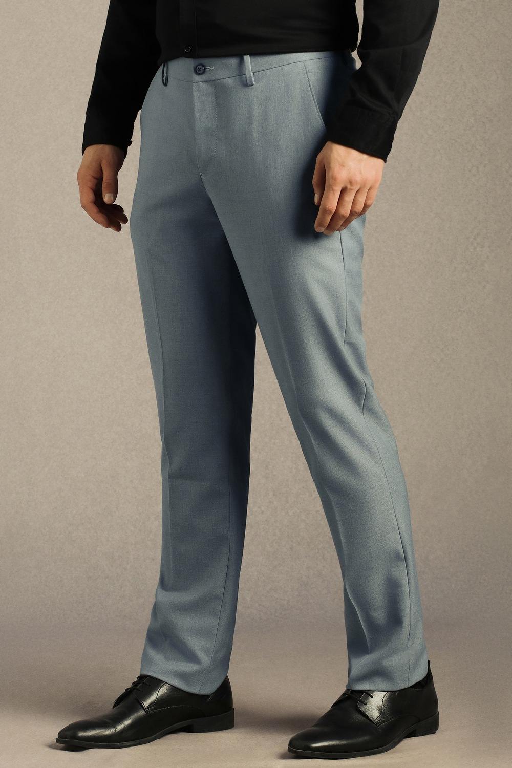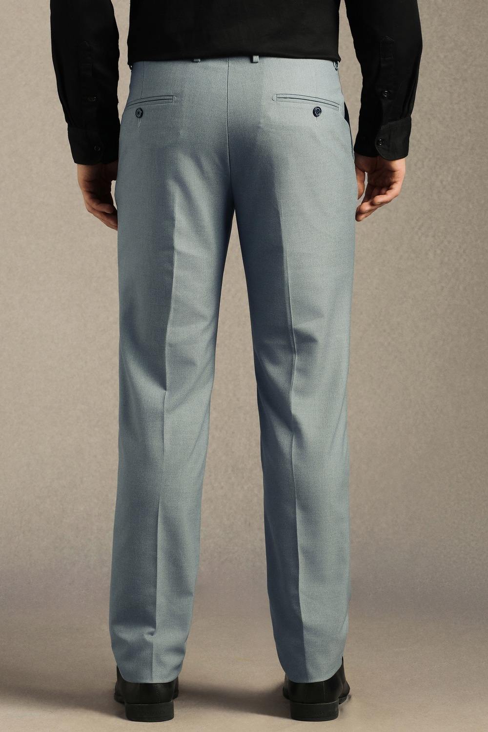 Embrace sophisticated elegance with these solid light blue trousers by Louis Philippe. Crafted from a premium blend of polyester, viscose, and spandex, they offer a comfortable fit ideal for formal occasions. The fabric provides breathability and flexibility, ensuring you look sharp while feeling at ease. Tailored for a refined silhouette, these trousers are the perfect addition to elevate your formal wardrobe and make a stylish statement.