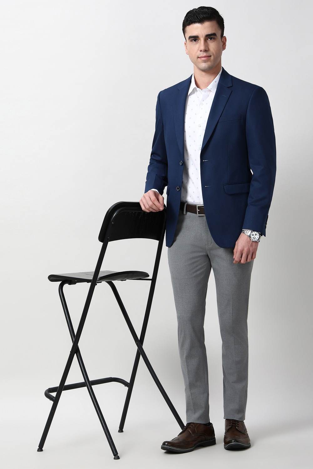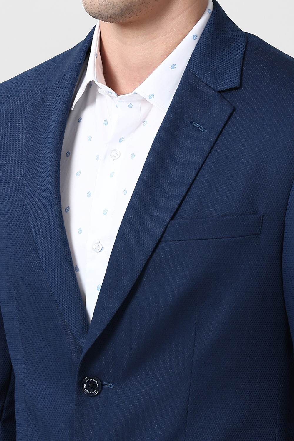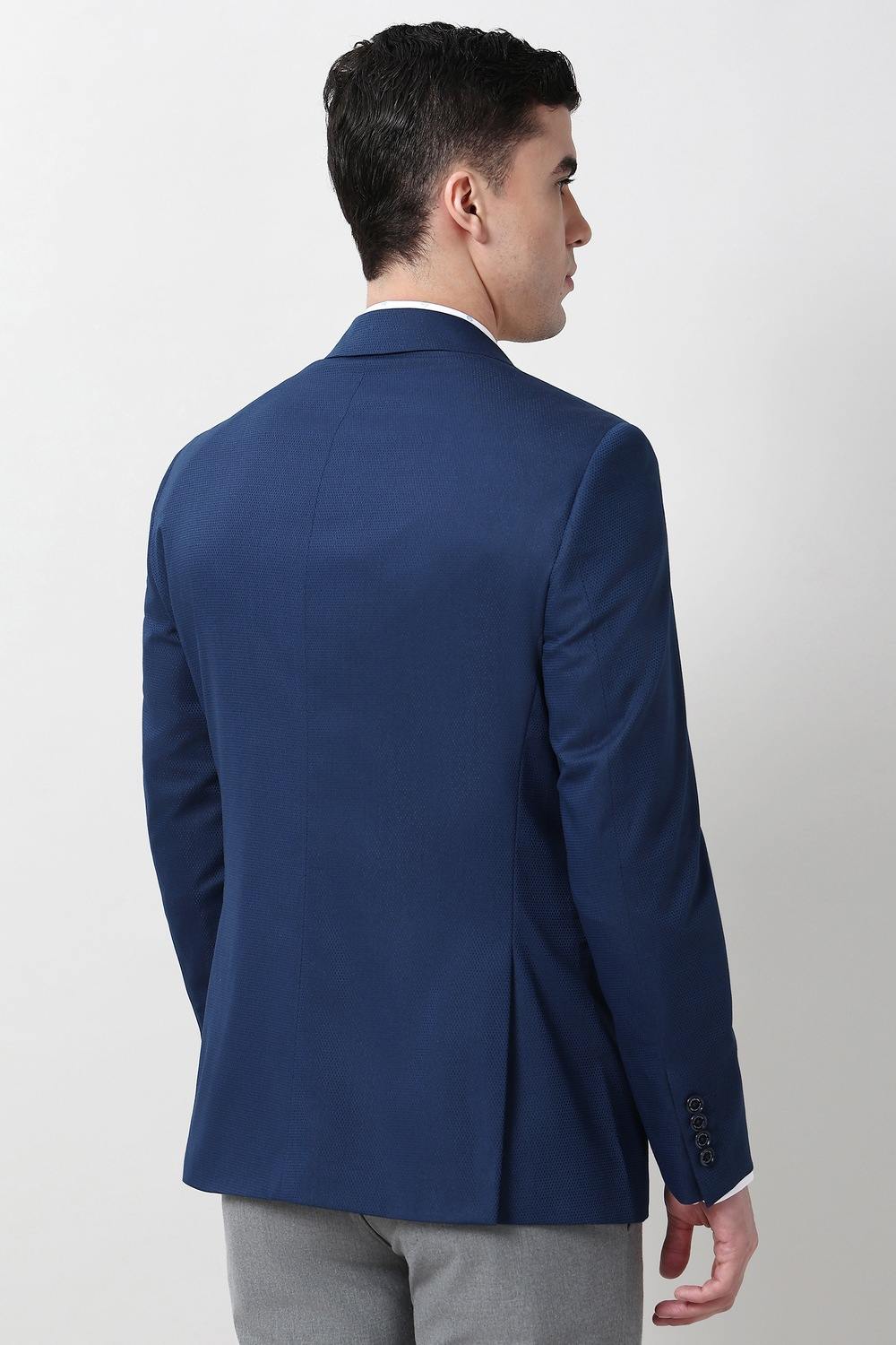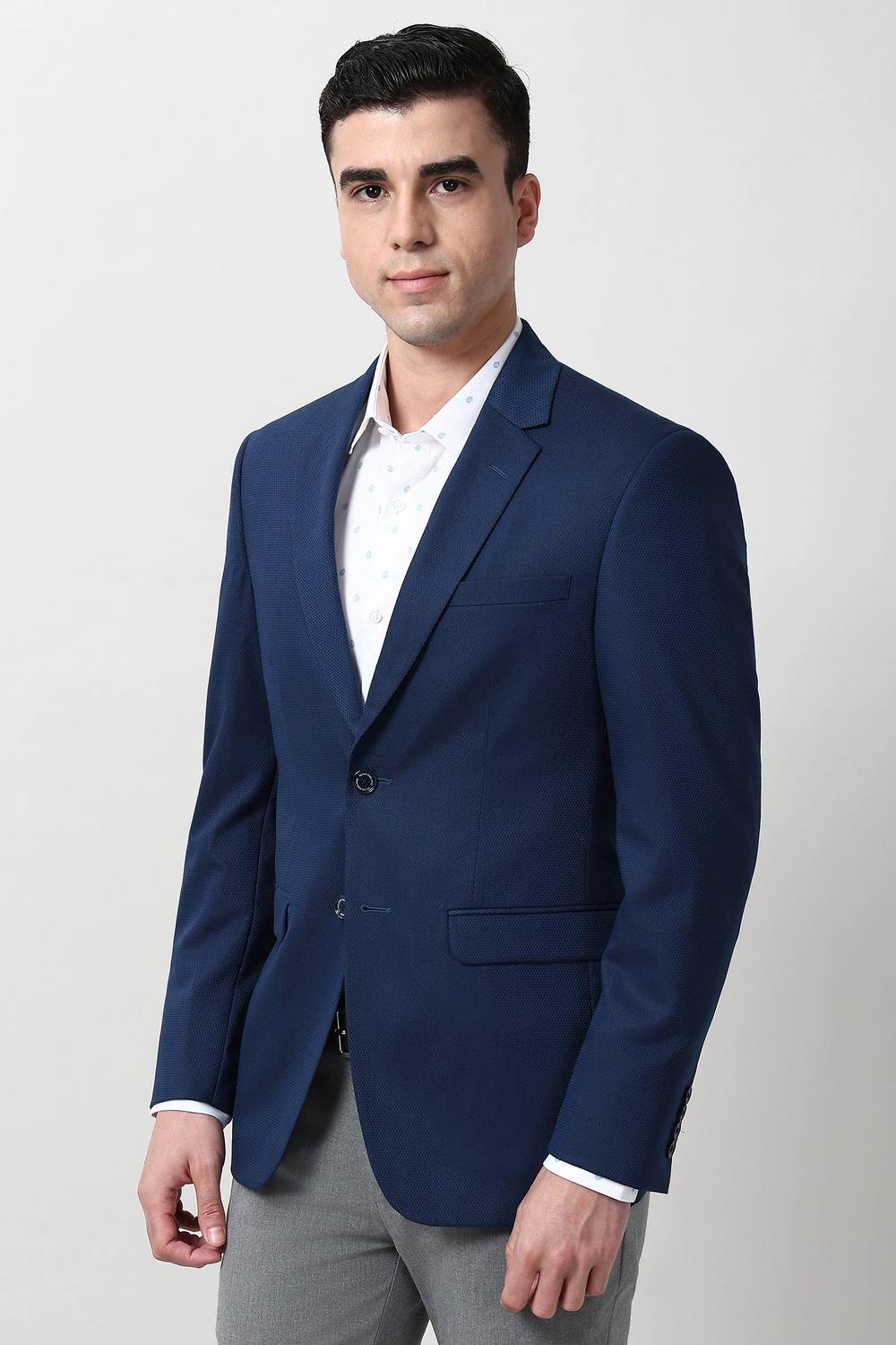 Elevate your formal wardrobe with the Peter England Elite navy blazer. Crafted from a luxurious blend of polyester, viscose, and spandex, this textured piece offers a refined silhouette that enhances comfort and style. The two-button front adds a classic touch, making it perfect for professional settings or upscale events. Embrace sophistication with this essential addition that effortlessly blends elegance and versatility.