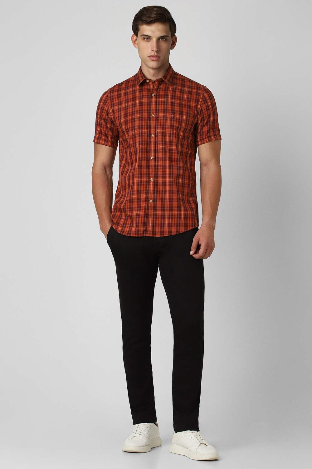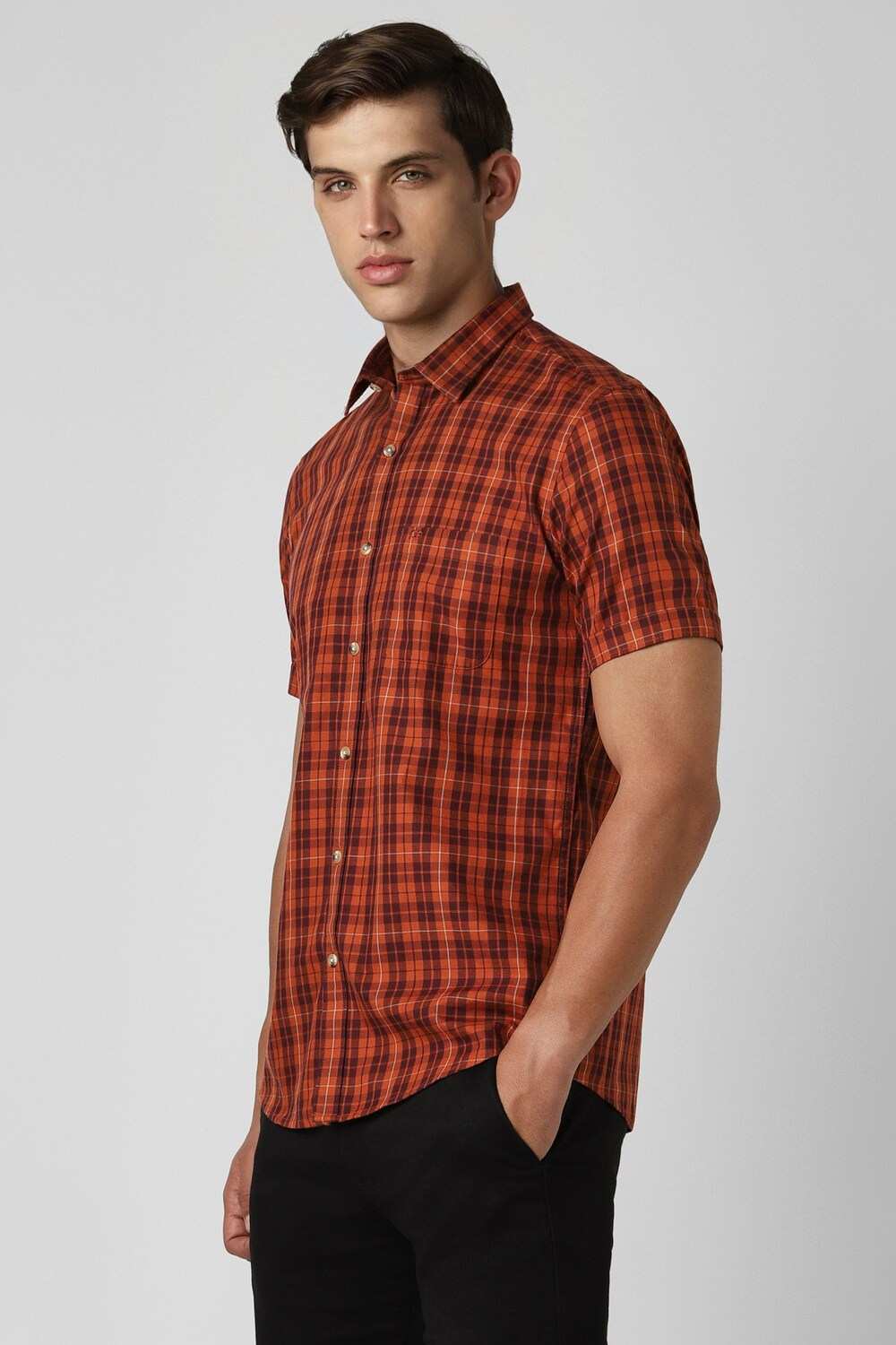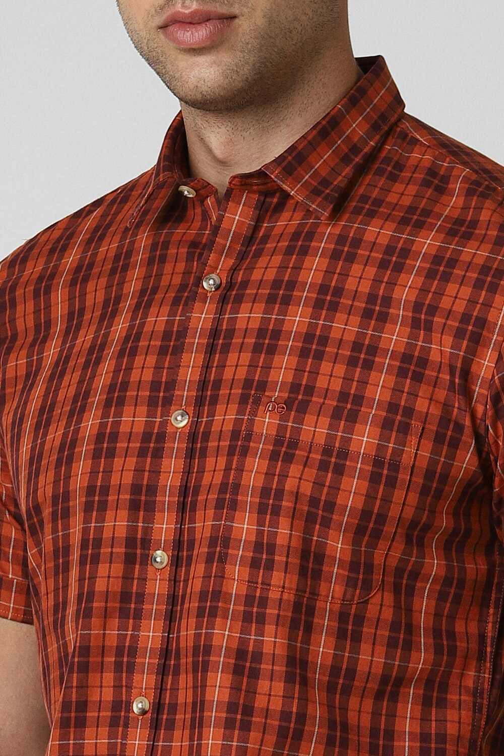 Elevate your casual wardrobe with the Peter England Casuals check shirt in vibrant orange. Crafted from breathable cotton, this slim-fit design ensures comfort without compromising style. The half sleeves make it perfect for warmer days, while the striking pattern adds a contemporary touch. Ideal for relaxed outings, this shirt promises to keep you looking sharp and feeling confident. Embrace versatile elegance with this essential piece.